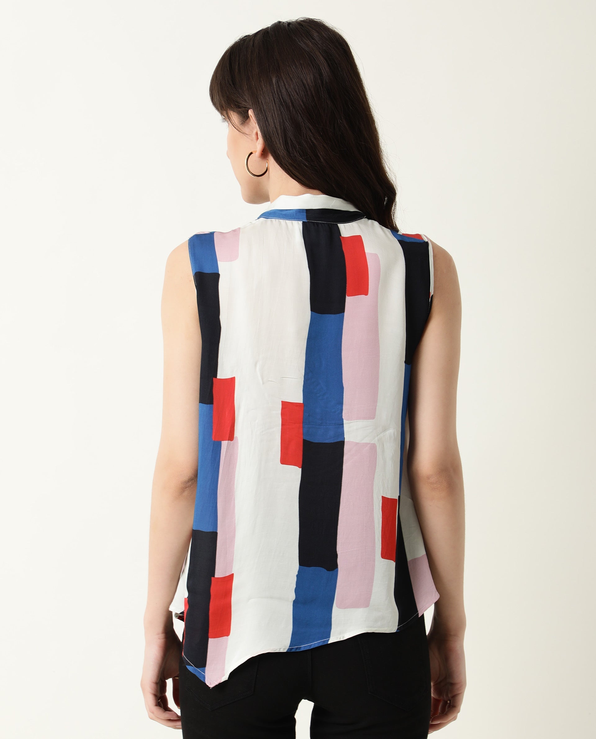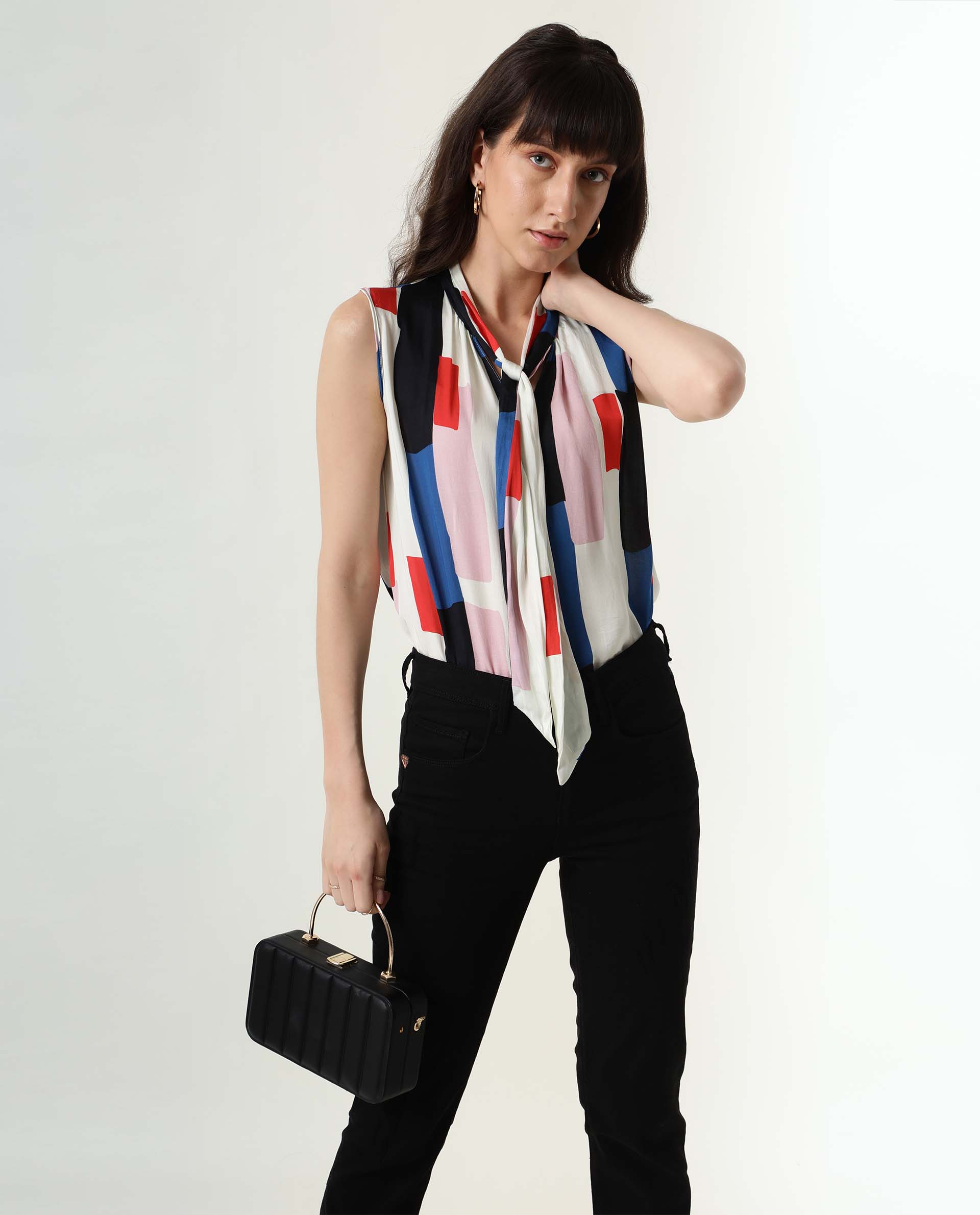 A contemporary style tie up neck sleeveless top in modern abstract stripes.
