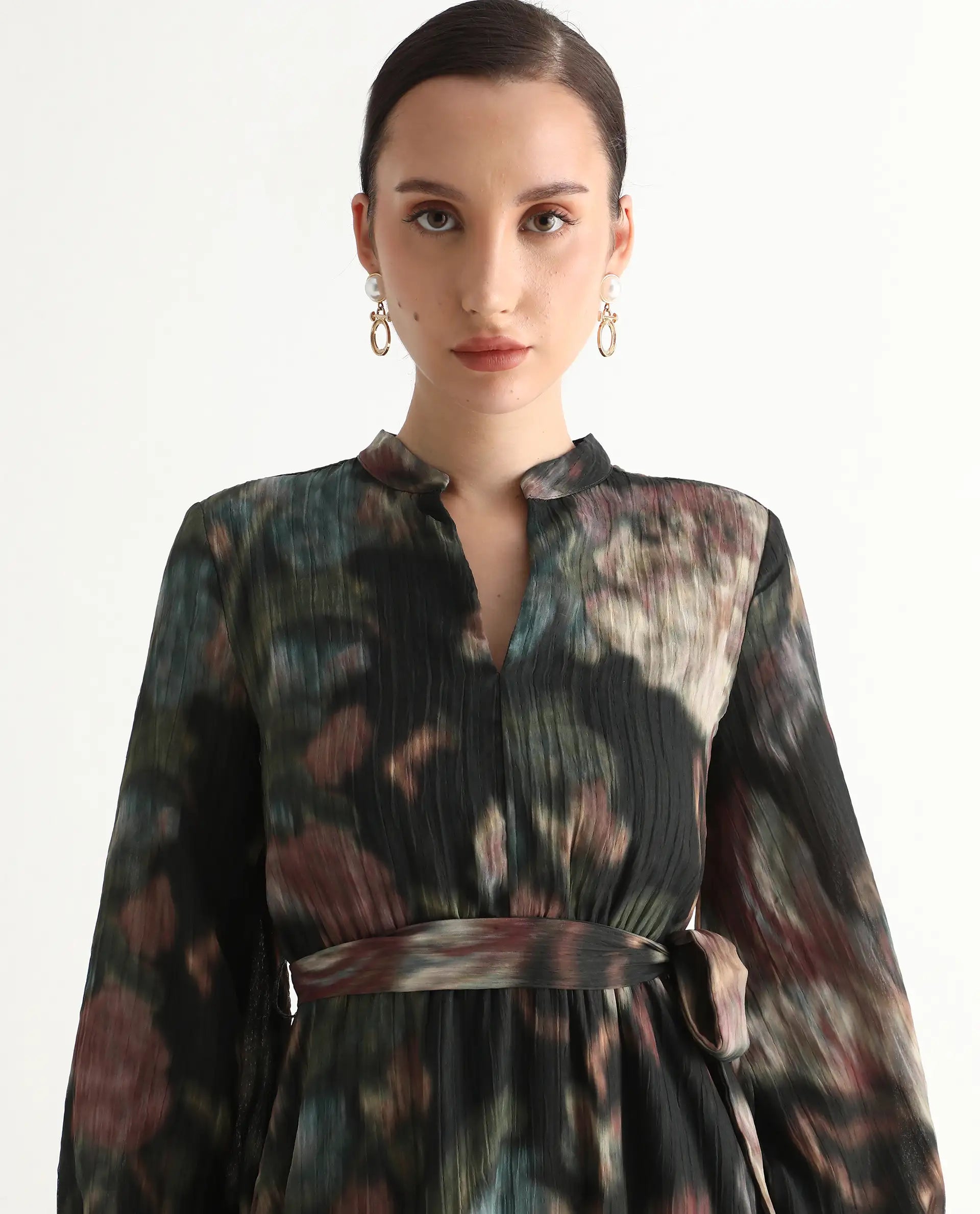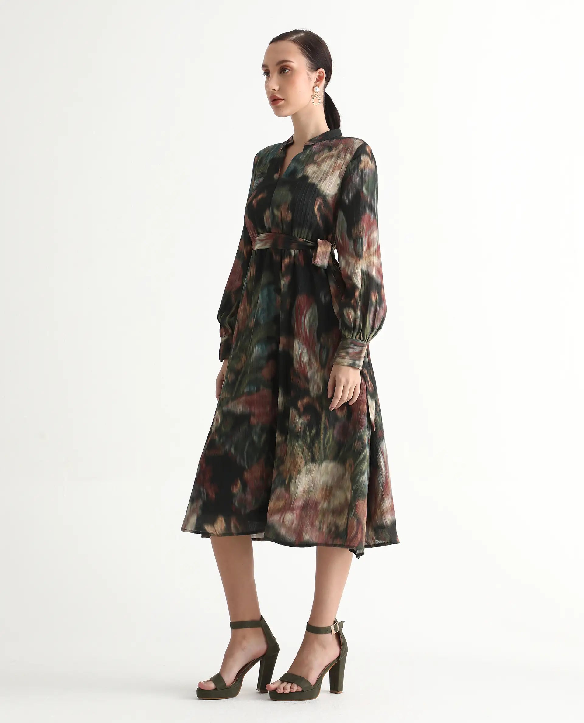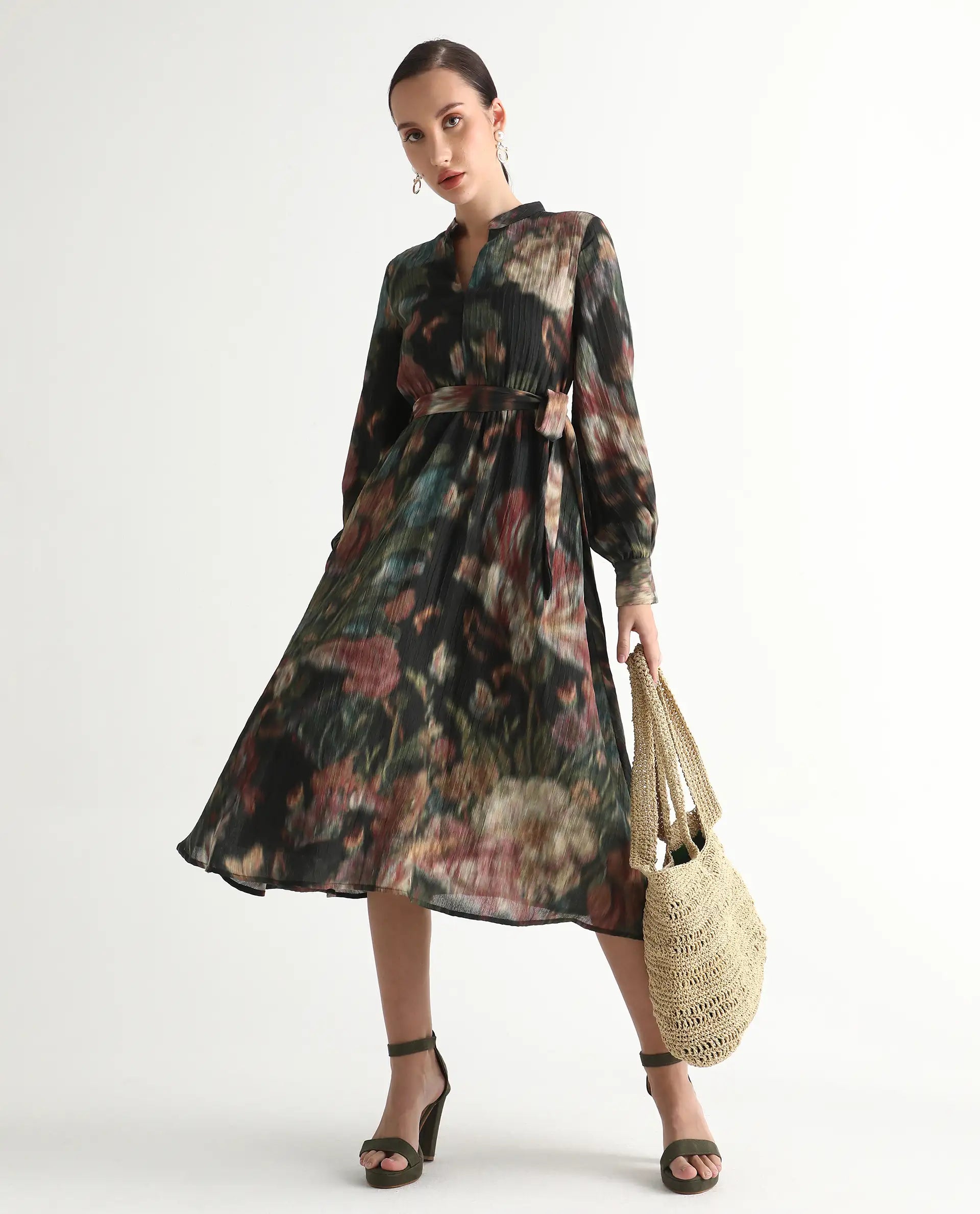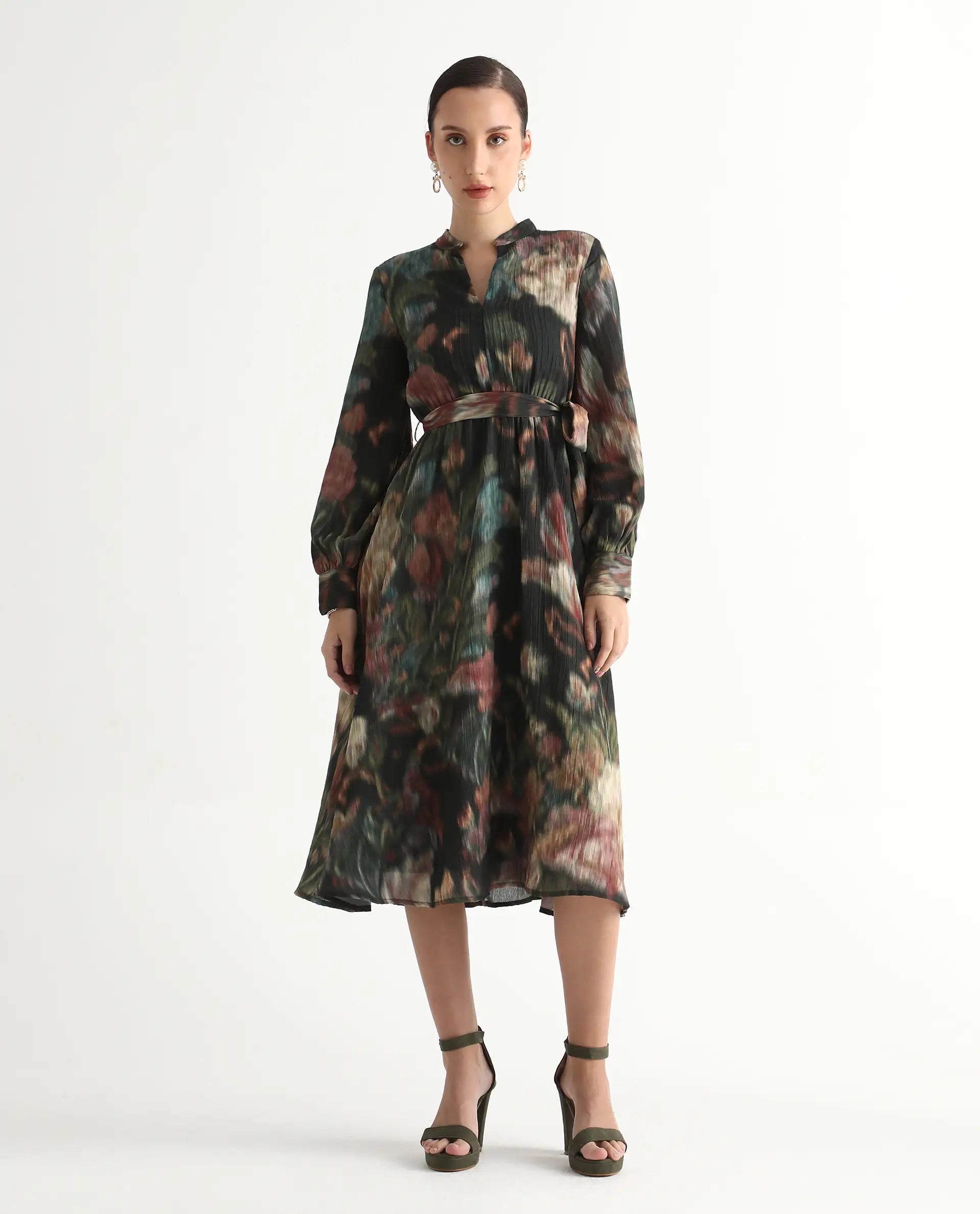 This Rareism Women Jehon dress features a sophisticated mandarin collar and cuffed sleeves, combining classic elements with modern style. The flared midi silhouette enhances movement and comfort, while the intricate printed design adds a distinctive touch. Ideal for both casual and semi-formal occasions, this dress offers a refined look with effortless elegance.