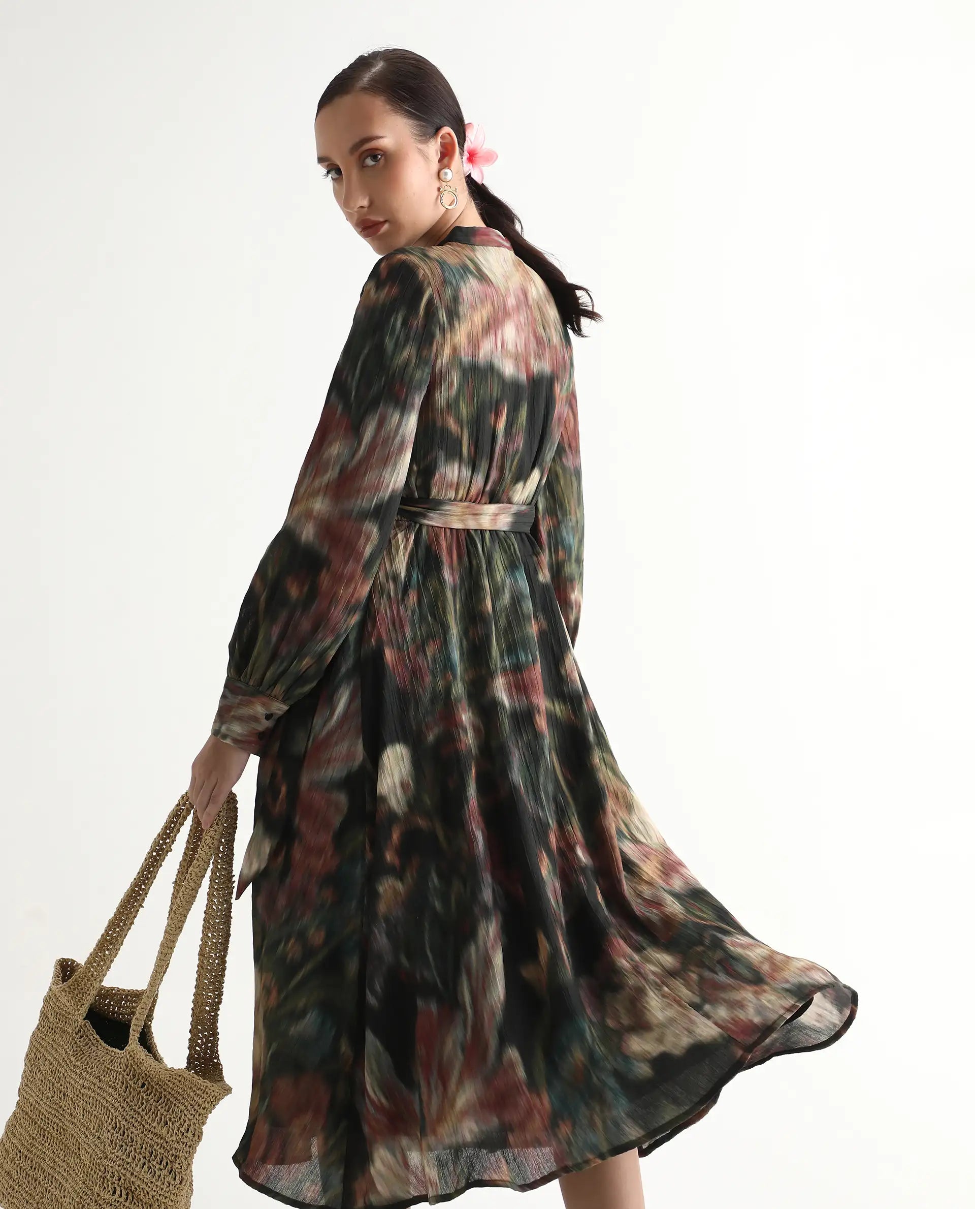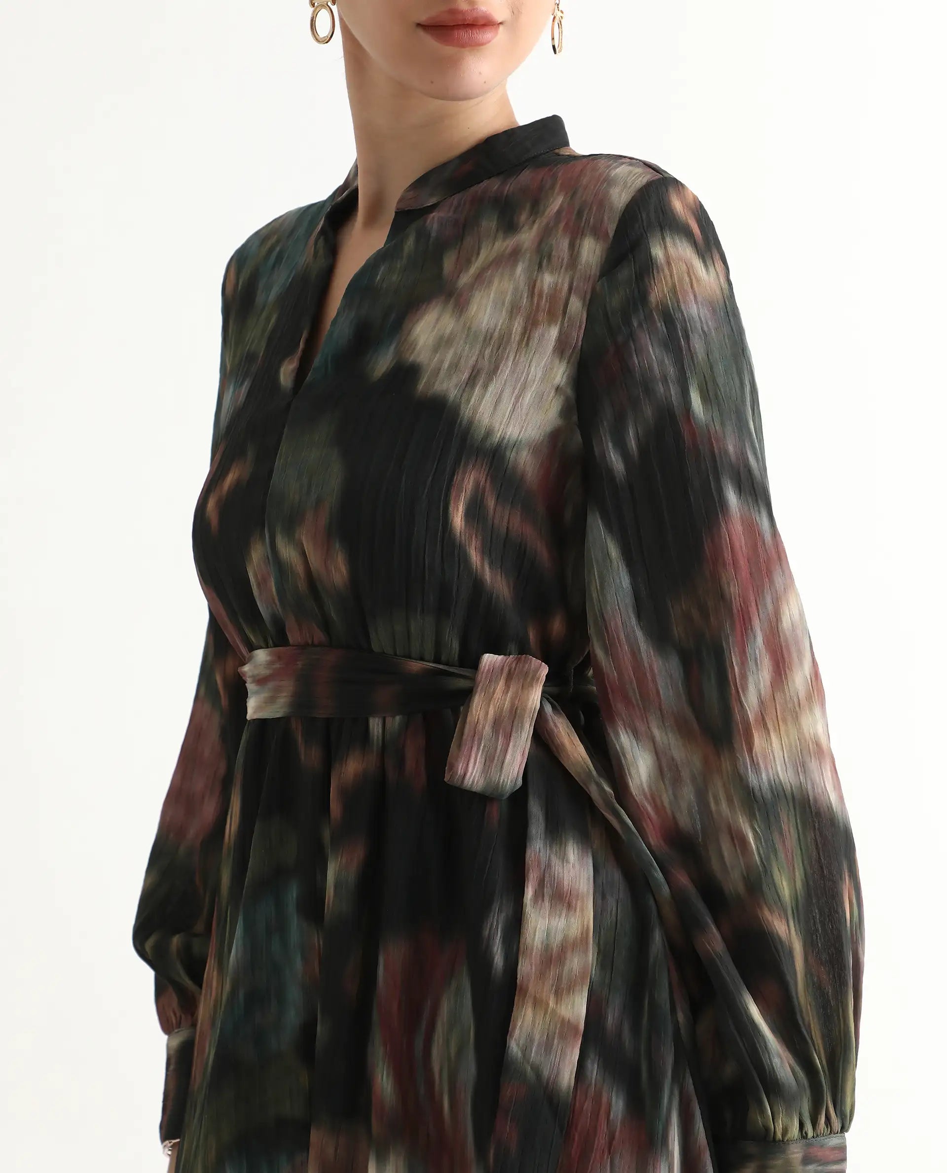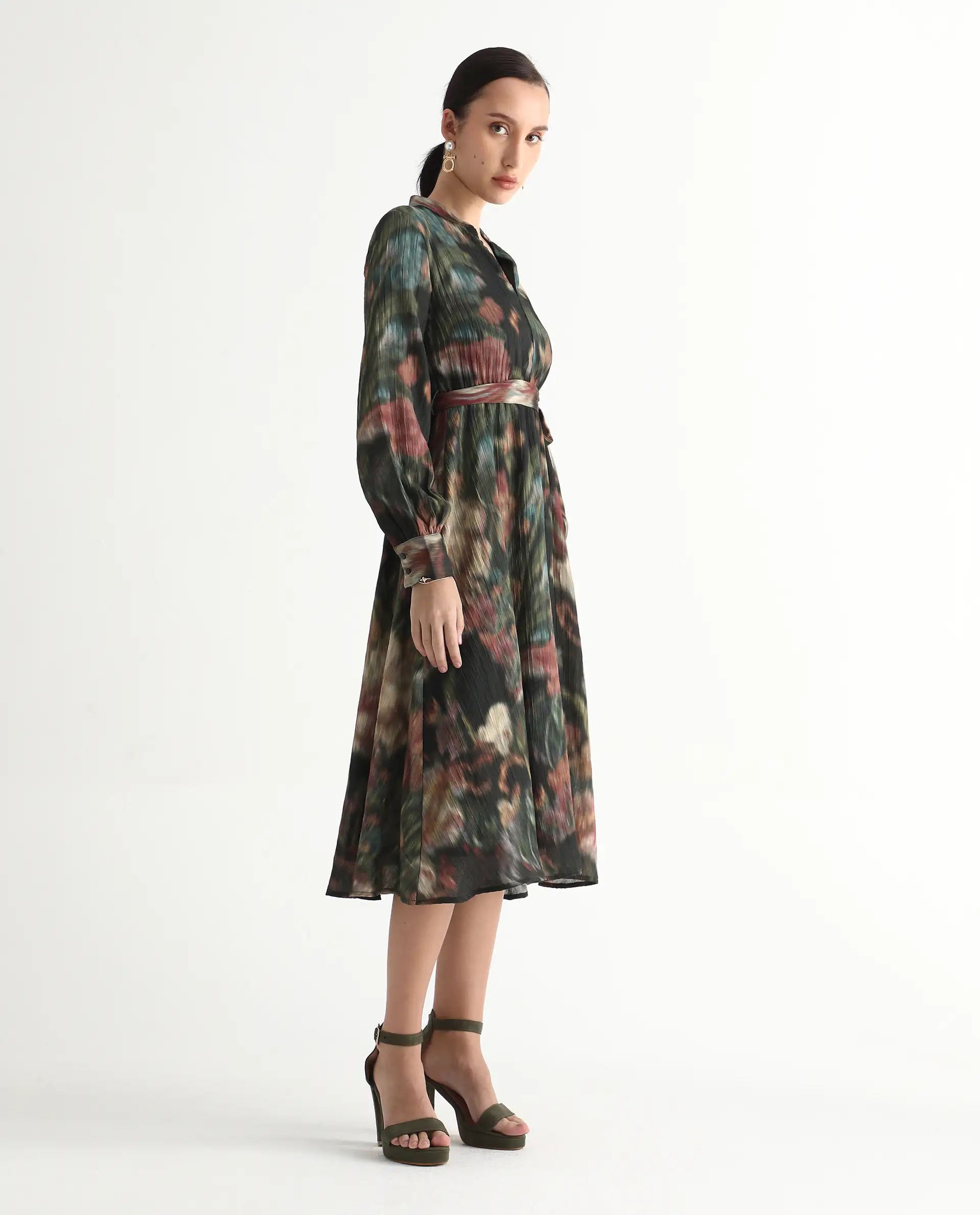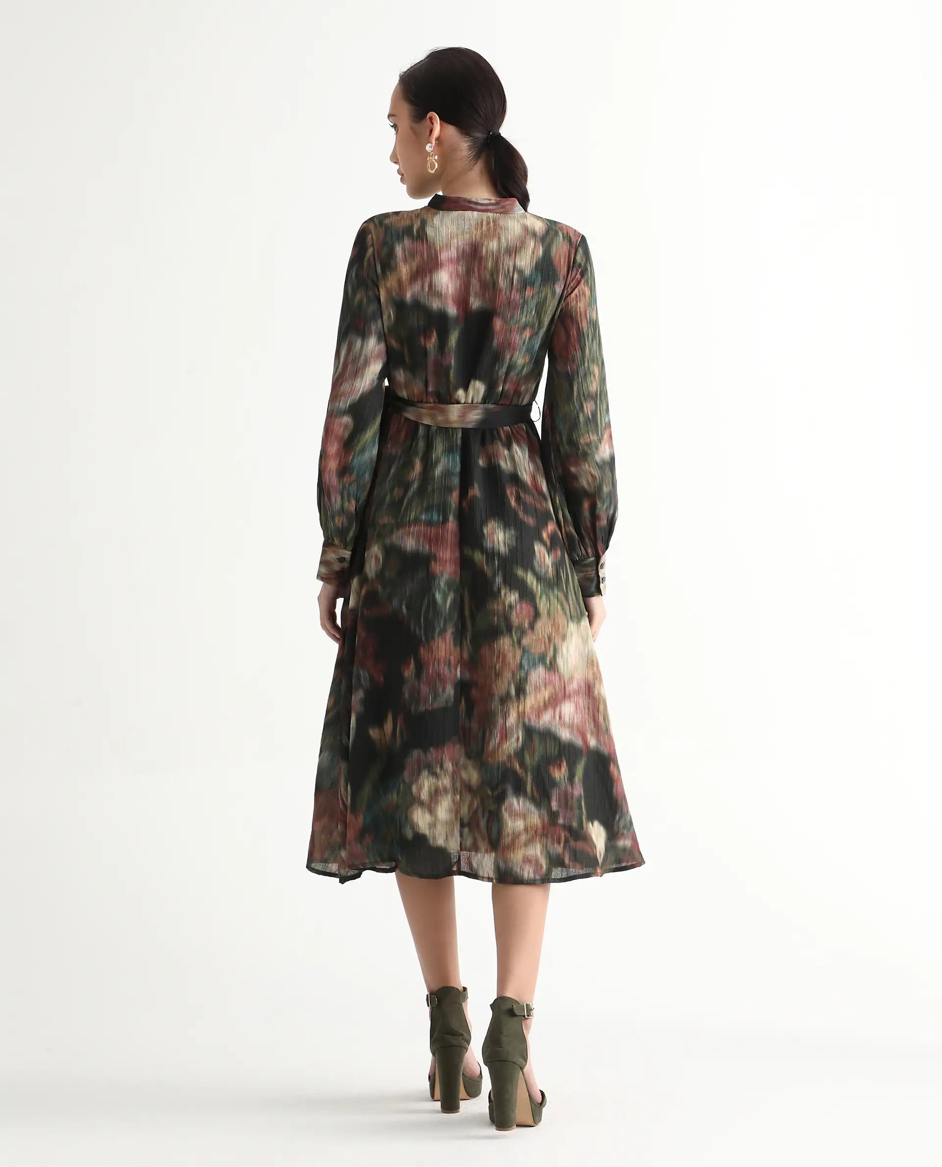 This Rareism Women Jehon dress features a sophisticated mandarin collar and cuffed sleeves, combining classic elements with modern style. The flared midi silhouette enhances movement and comfort, while the intricate printed design adds a distinctive touch. Ideal for both casual and semi-formal occasions, this dress offers a refined look with effortless elegance.