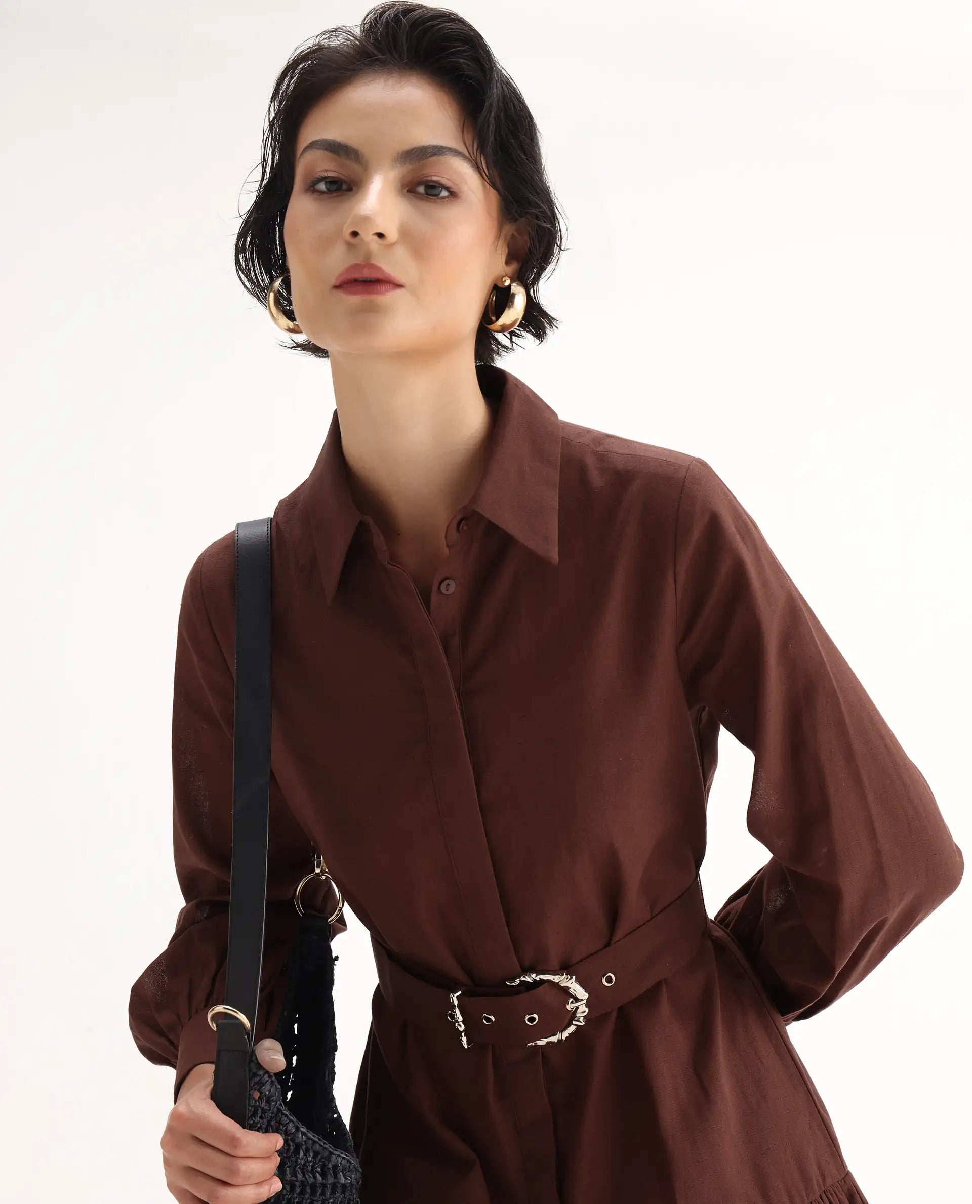 This Rareism women’s dress features a sophisticated collared neck and button closure, complemented by cuffed sleeves for a polished look. Its flared silhouette and knee-length cut offer both comfort and elegance, making it ideal for professional or casual settings. Crafted in a versatile brown shade, this plain dress combines classic style with practical design for effortless wear.