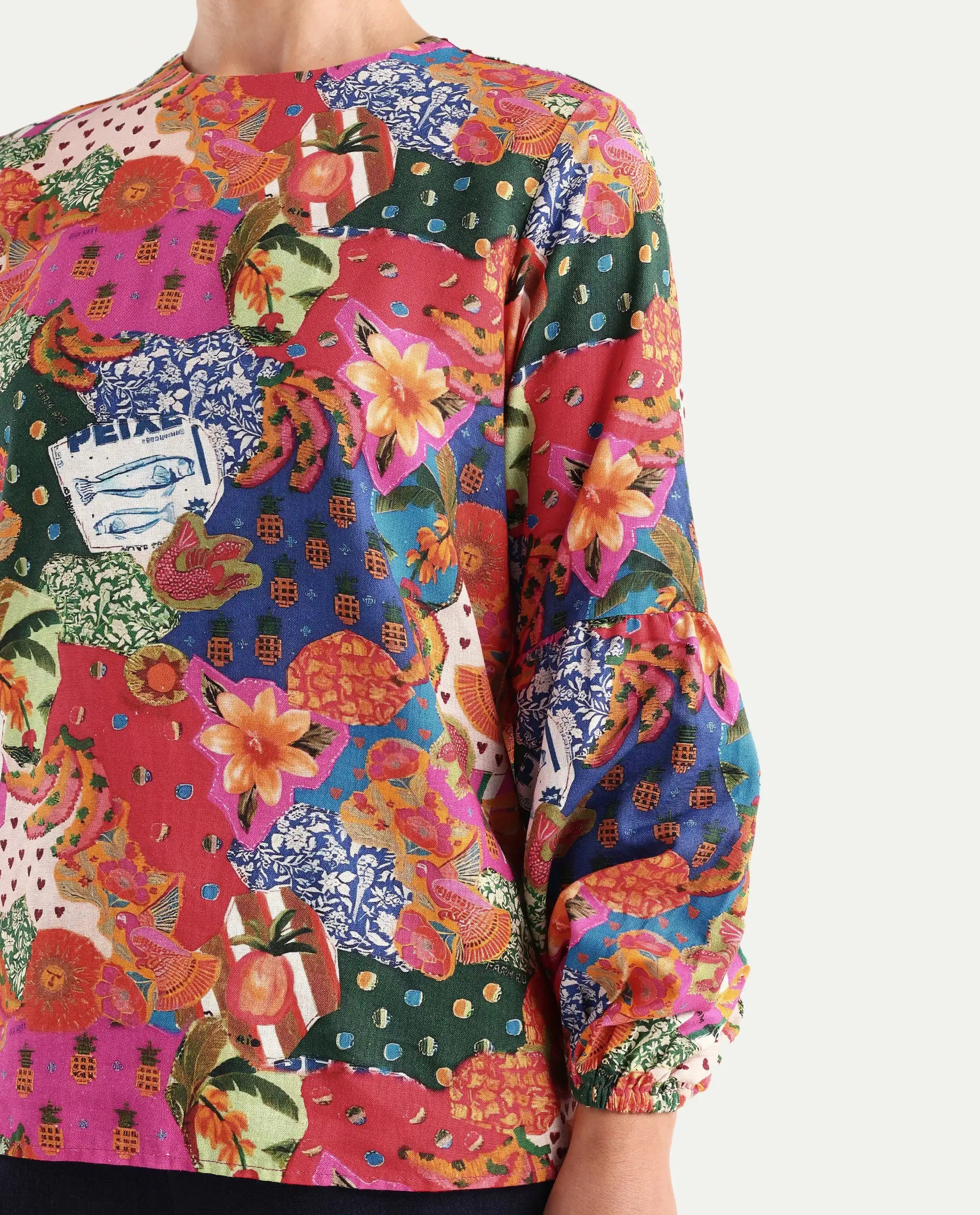 3. The button closure adds a refined touch, while the abstract print showcases artistic flair.