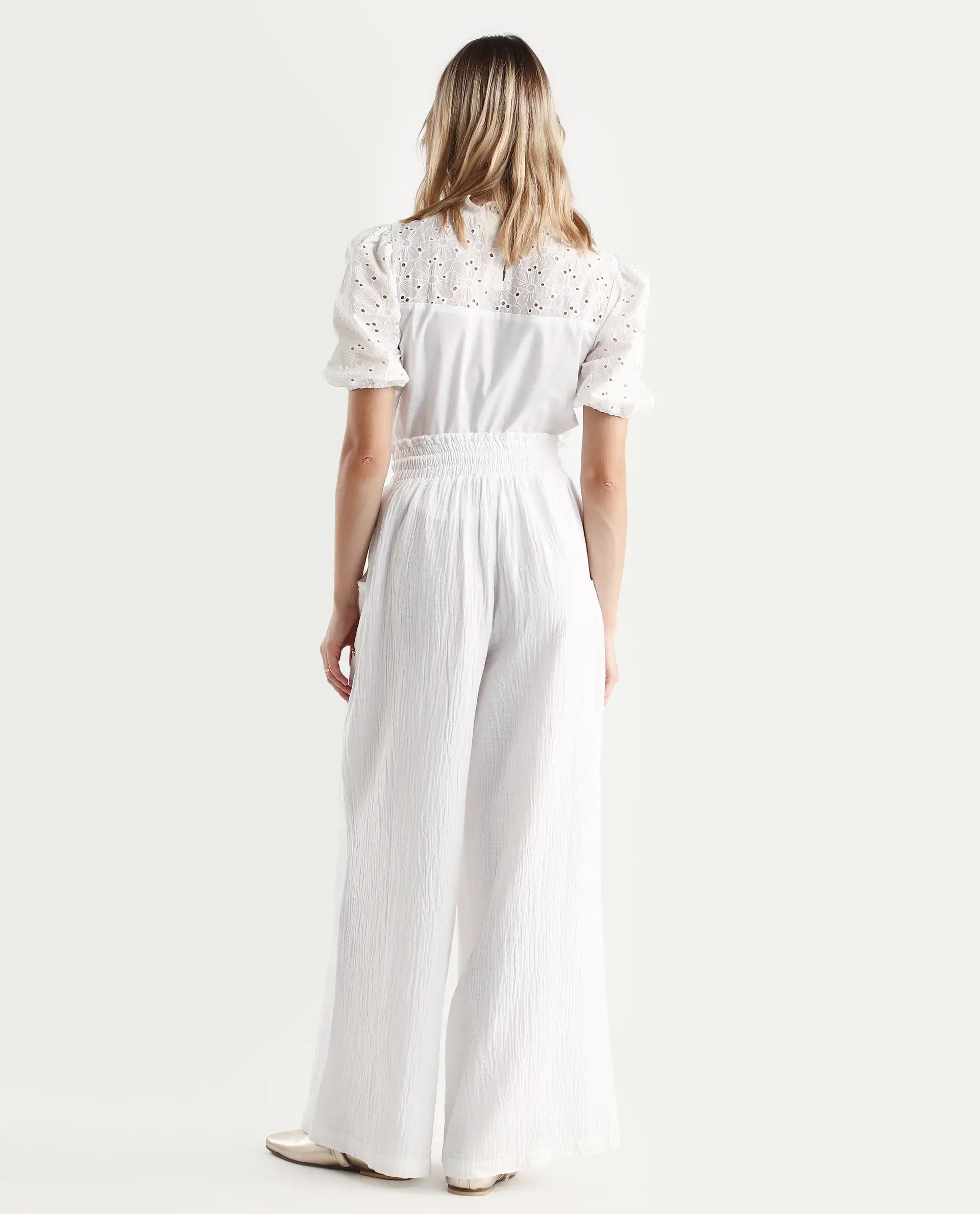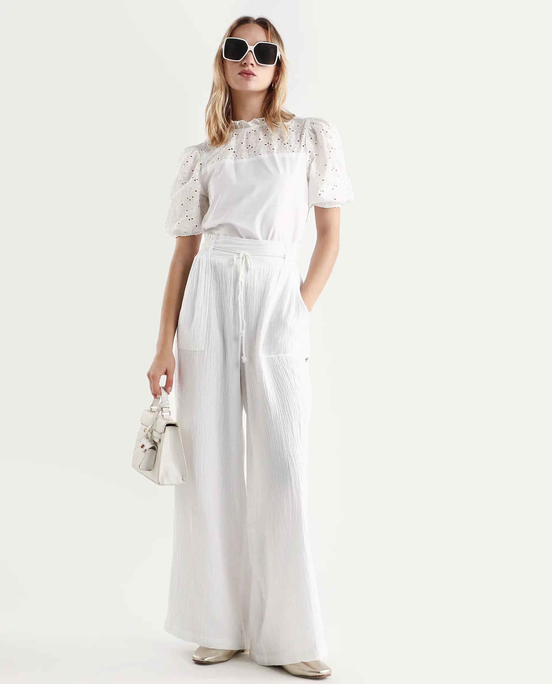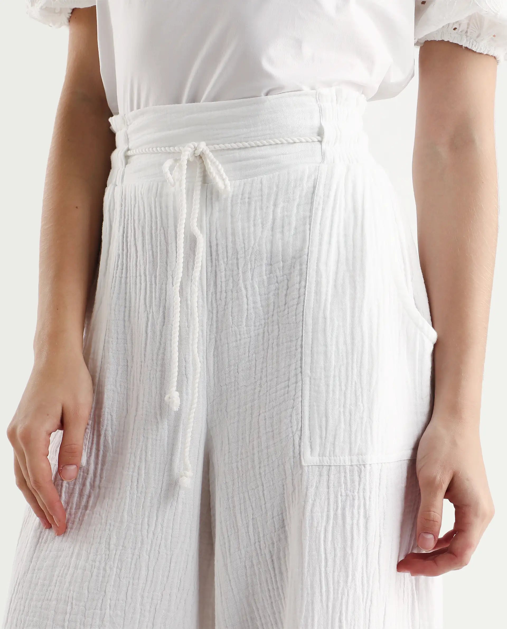 Discover the ultimate blend of comfort and style with our Pastel Tie-Up Wide Fit Ankle-Length Trousers for women. Crafted from premium cotton fabric, these trousers feature a chic tie-up closure and a flattering wide fit, perfect for resort wear. The pastel white hue adds a touch of elegance, making them versatile for any occasion. Designed with a plain, woven pattern, these ankle-length trousers are a must-have addition to your wardrobe. Elevate your fashion game with these stylish and comfortable trousers, ideal for both casual and formal settings. Embrace effortless sophistication today.