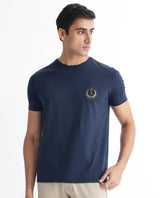 Rare Rabbit Men's Kos Navy Solid Crew Neck Chest Embroidered Label Branding Half Sleeves Regular Fit T-Shirt