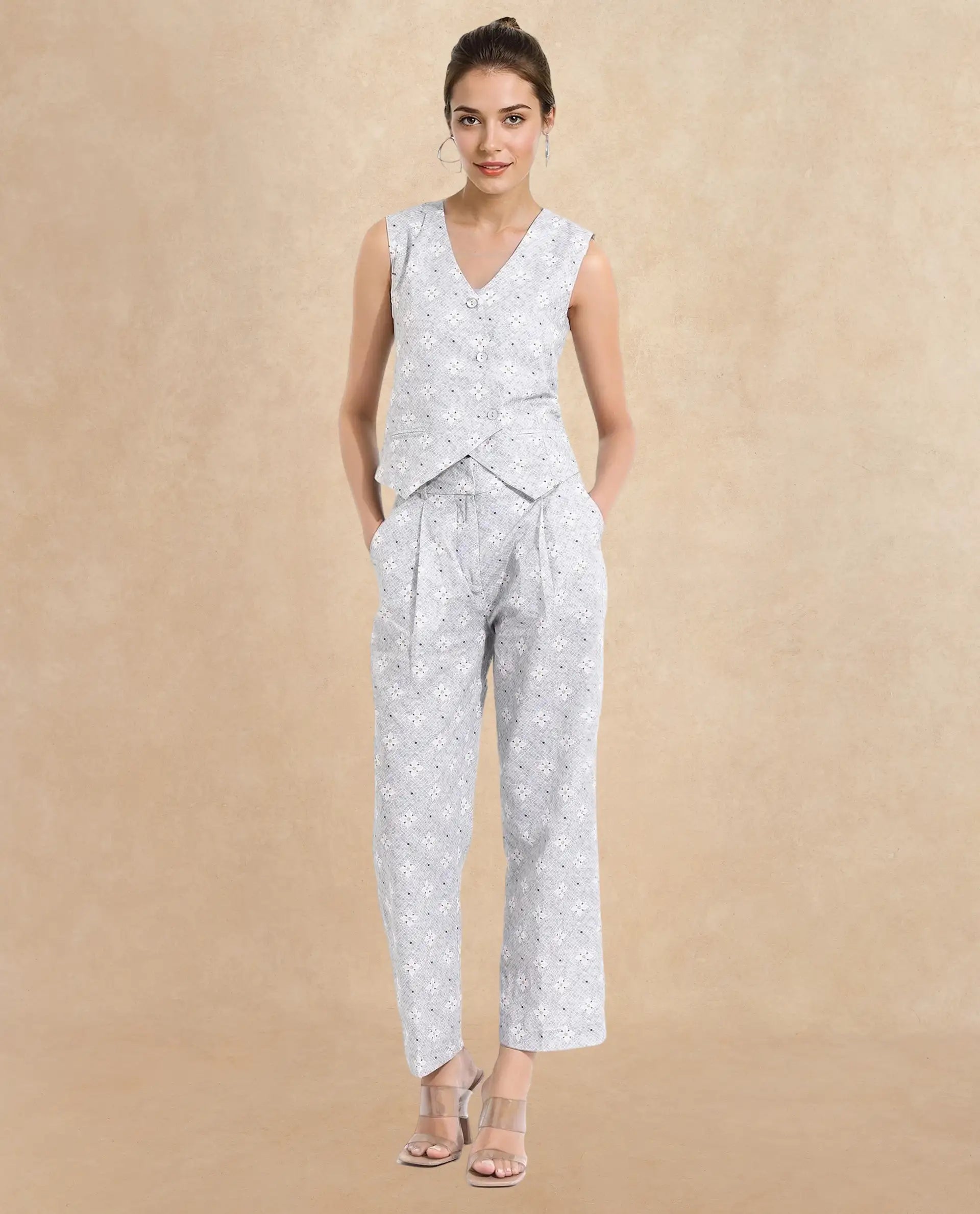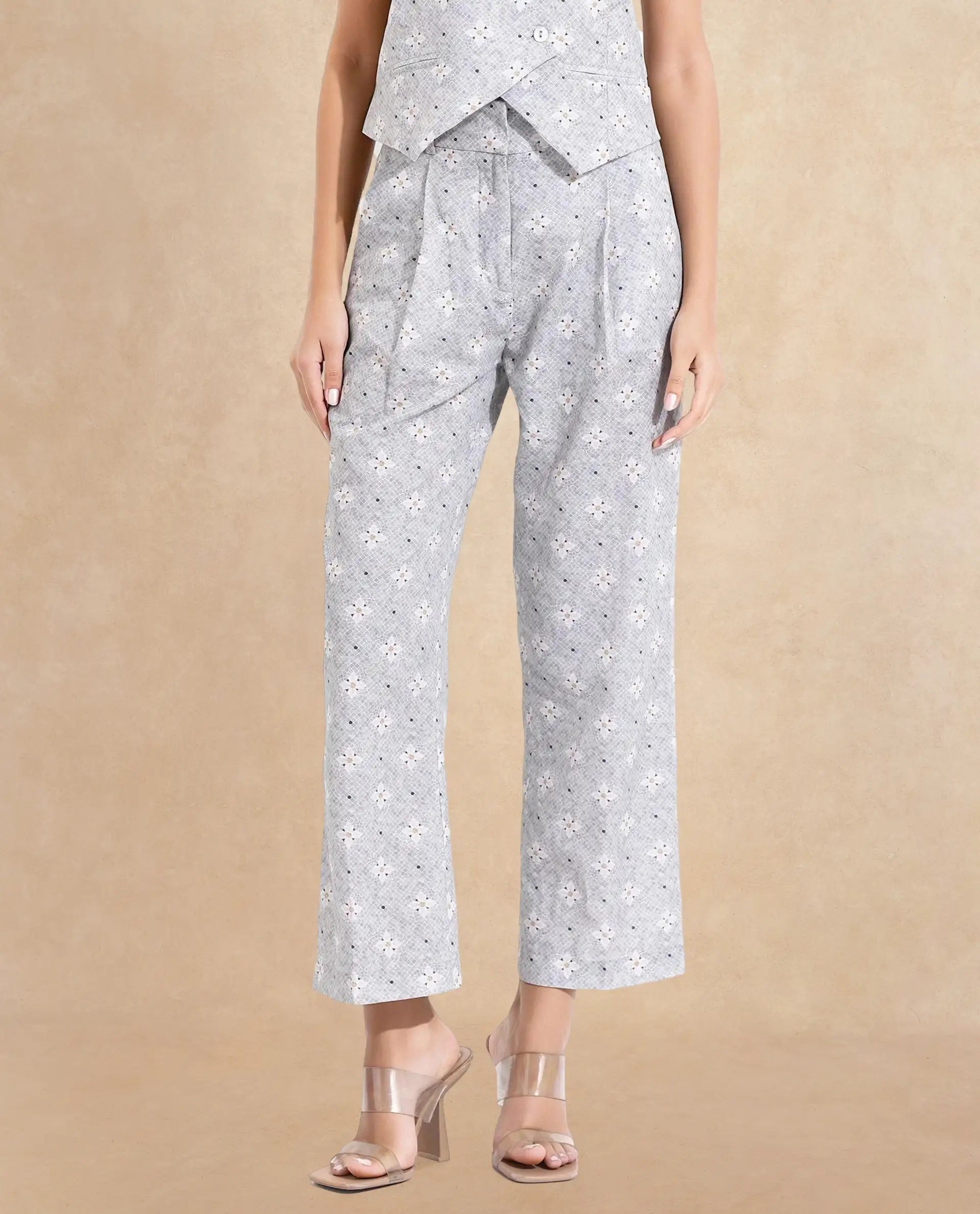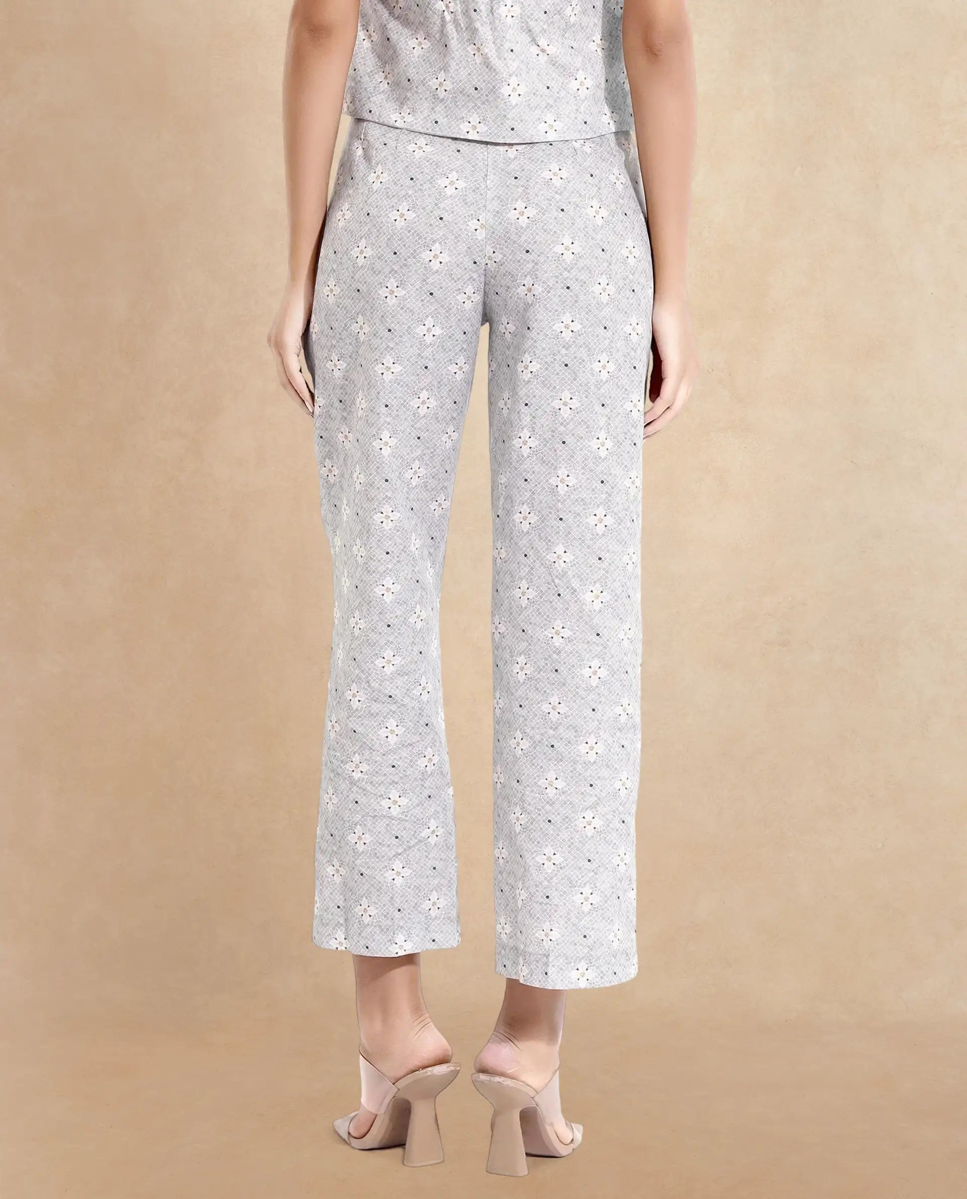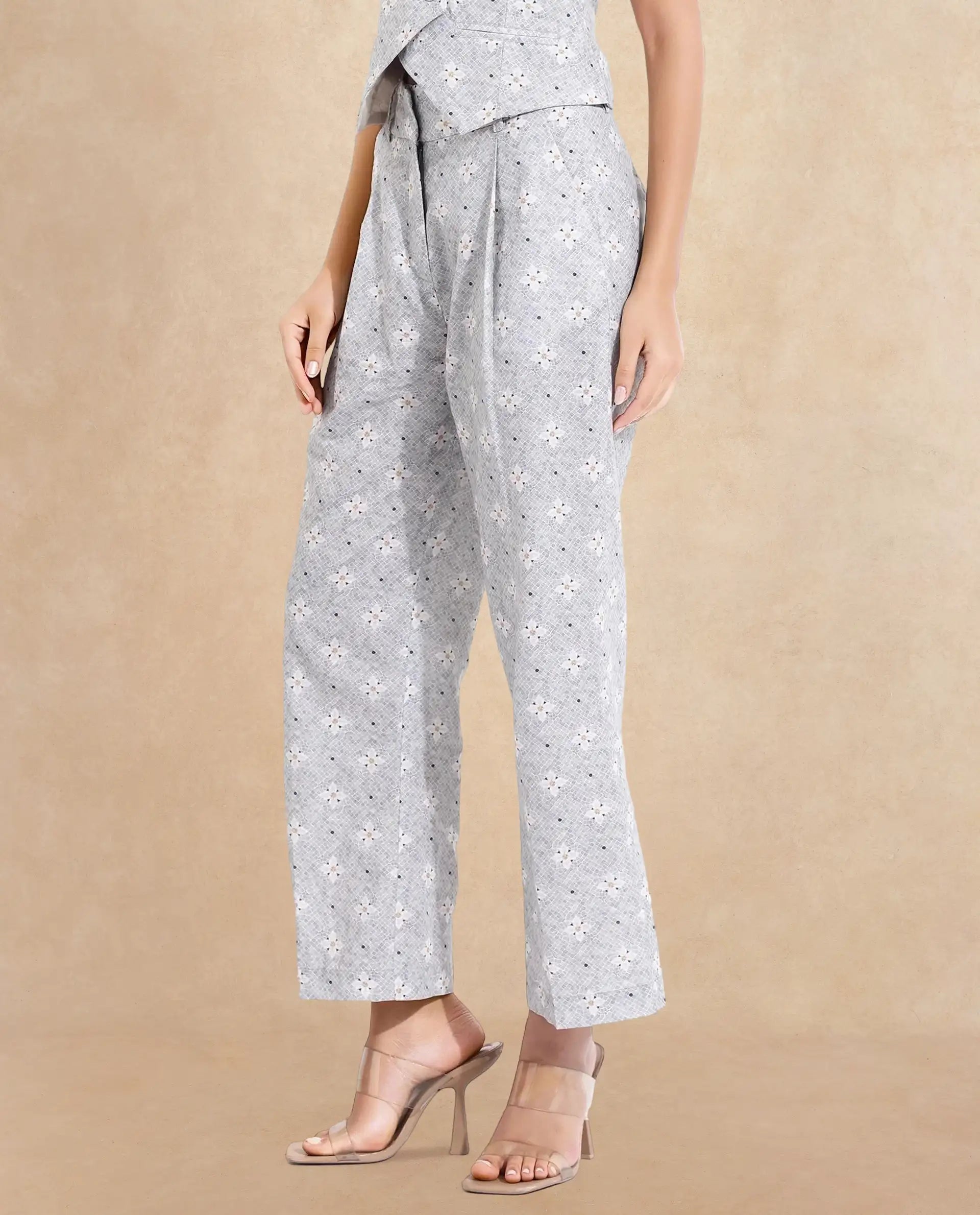 Elevate your formal wardrobe with these stylish light grey floral print trousers, designed for the modern woman. Featuring a straight fit and ankle-length cut, these woven trousers offer a sophisticated look with a touch of elegance. The button closure ensures a secure fit, making them perfect for any formal occasion. Crafted with attention to detail, these trousers combine comfort and style effortlessly. Ideal for office wear or special events, they are a must-have addition to your collection. Discover the perfect blend of fashion and functionality with these chic floral print trousers. Upgrade your style today!