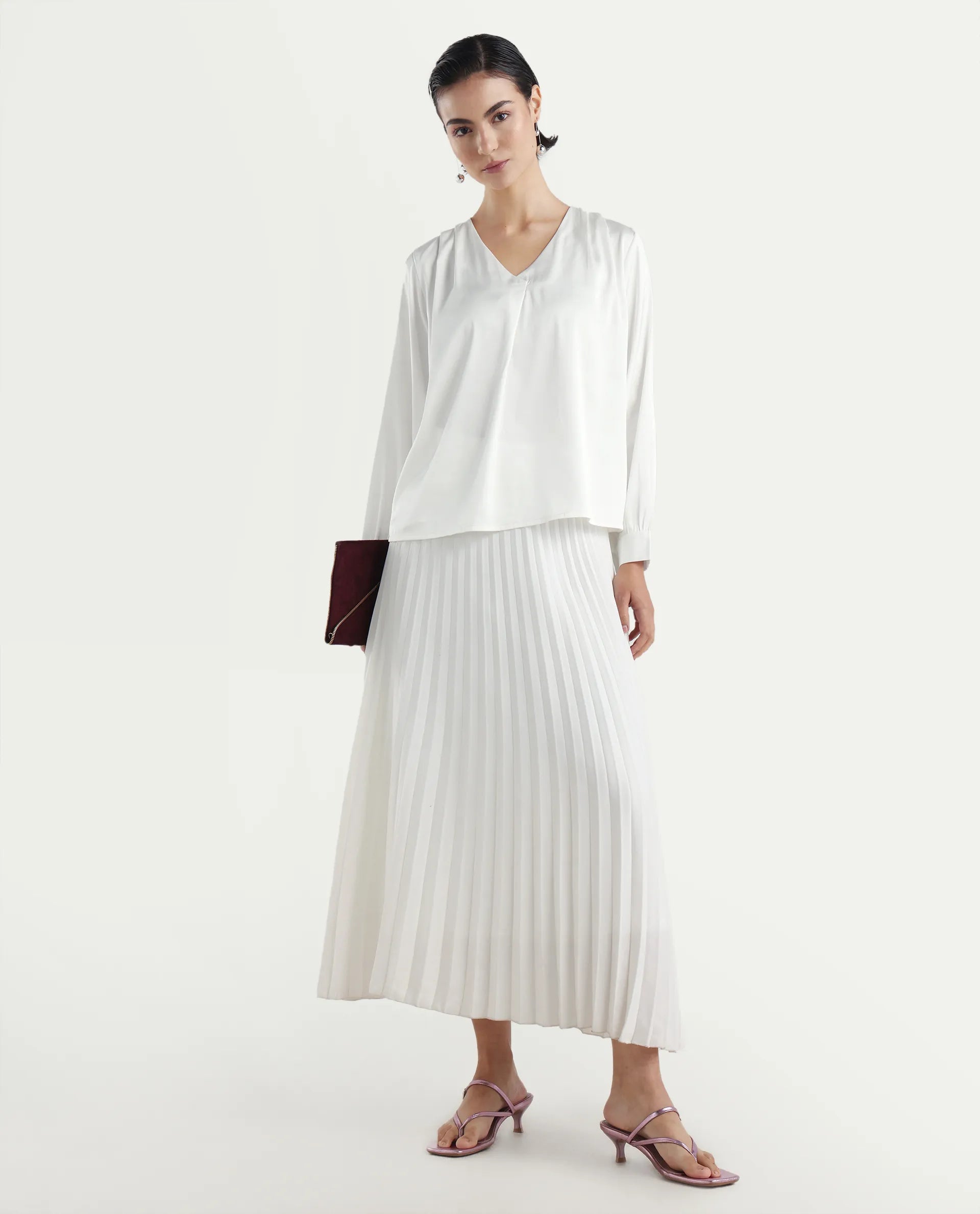 Elevate your formal look with our V-Neck Satin Top. Featuring cuffed sleeves and pleat detailing at the shoulder, this top exudes sophistication. Crafted from luxurious Polyester fabric, it combines style and comfort seamlessly.