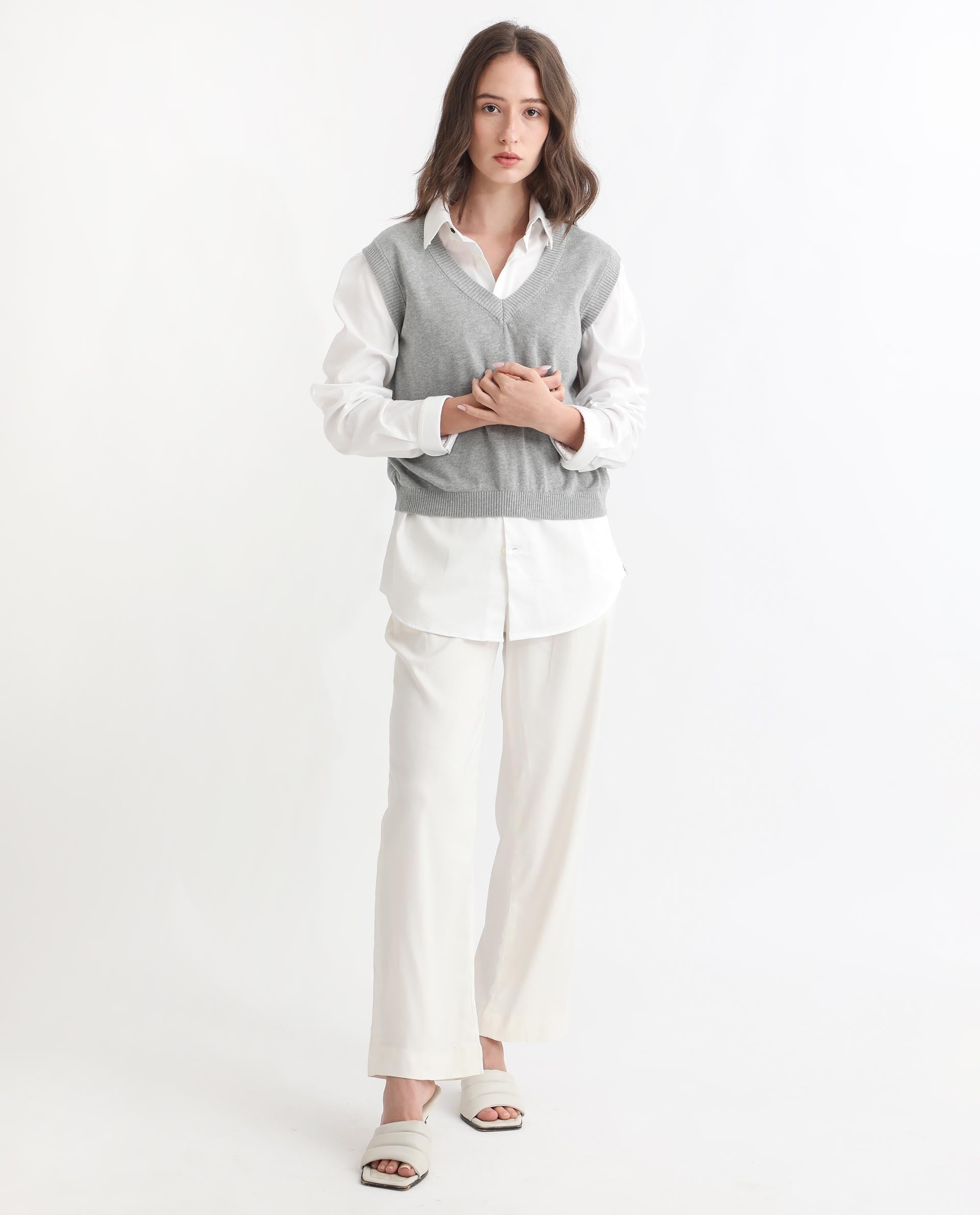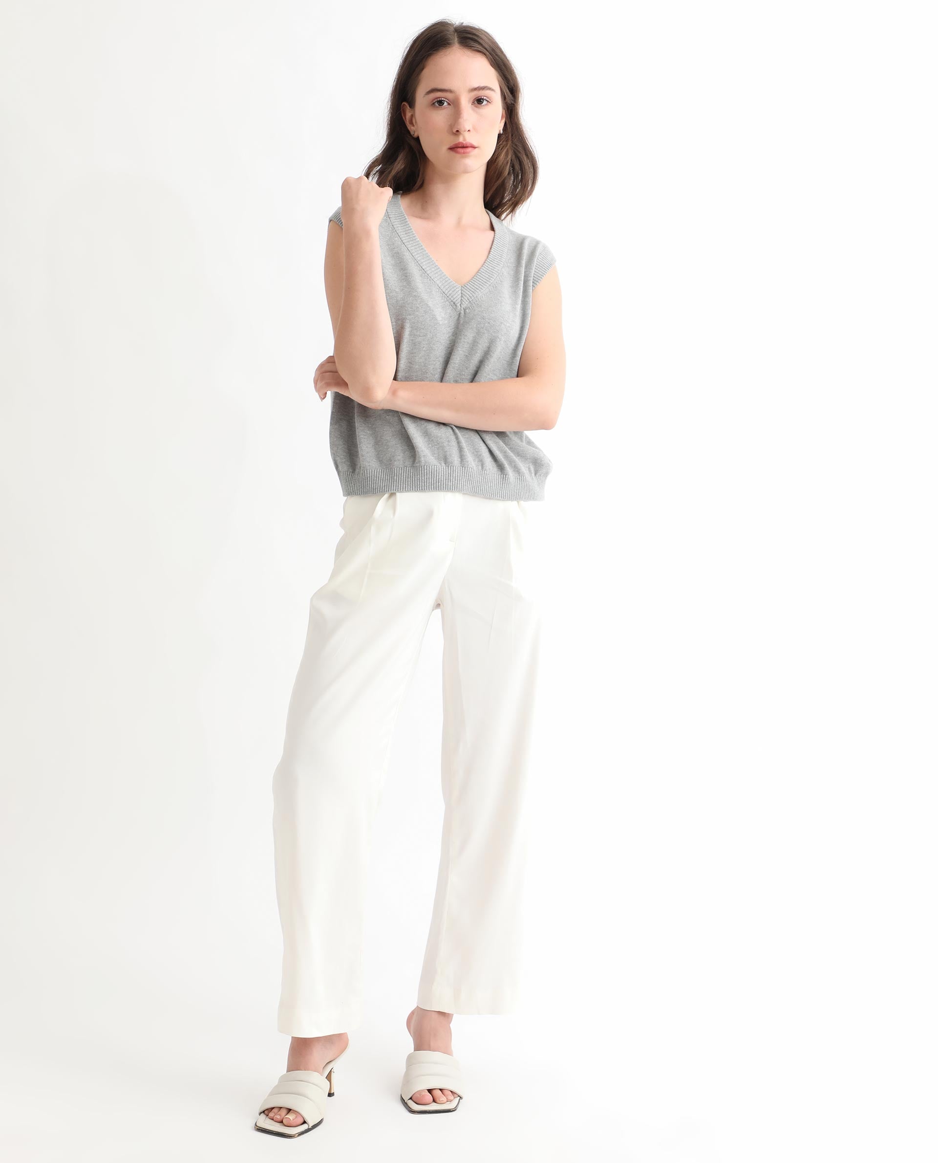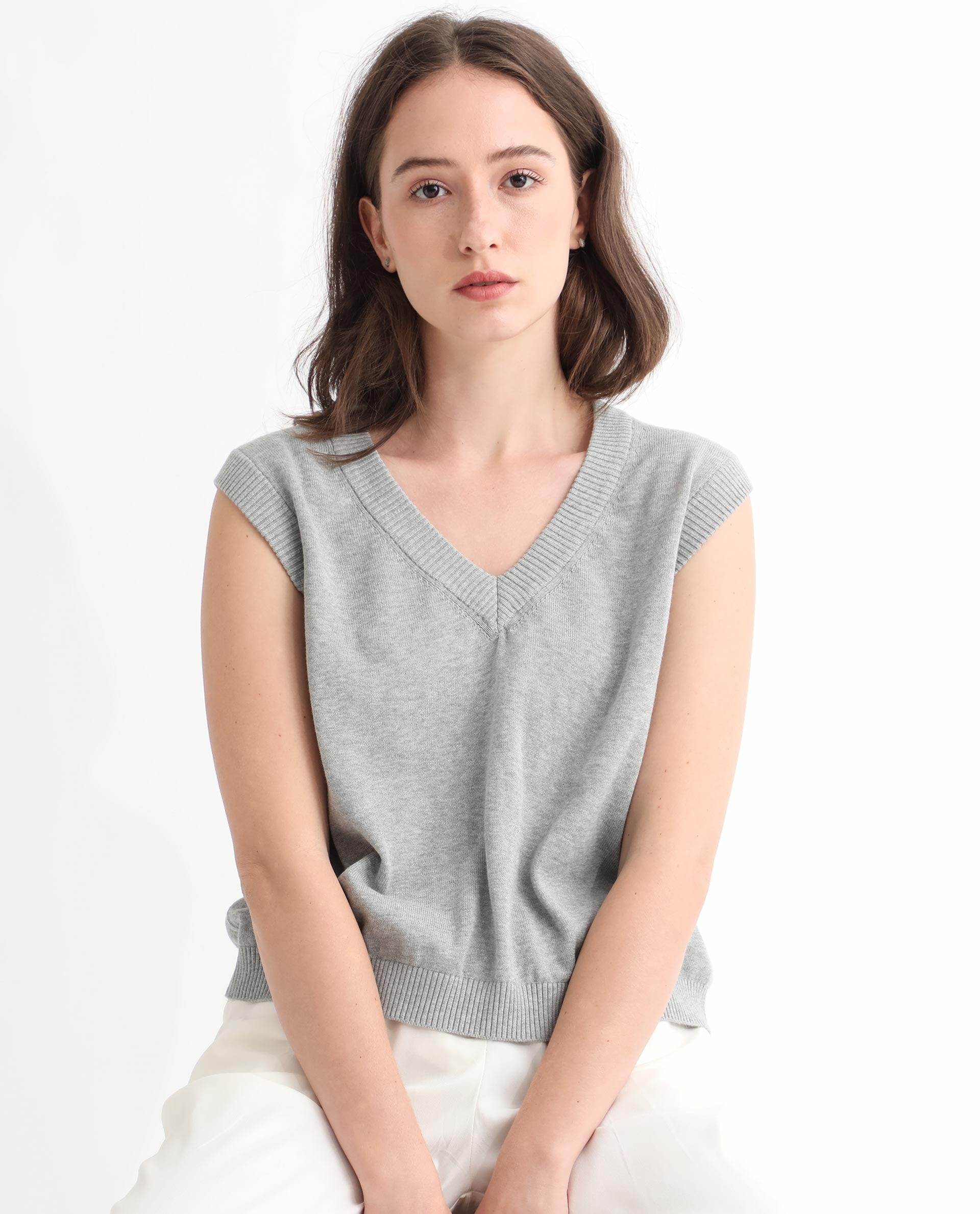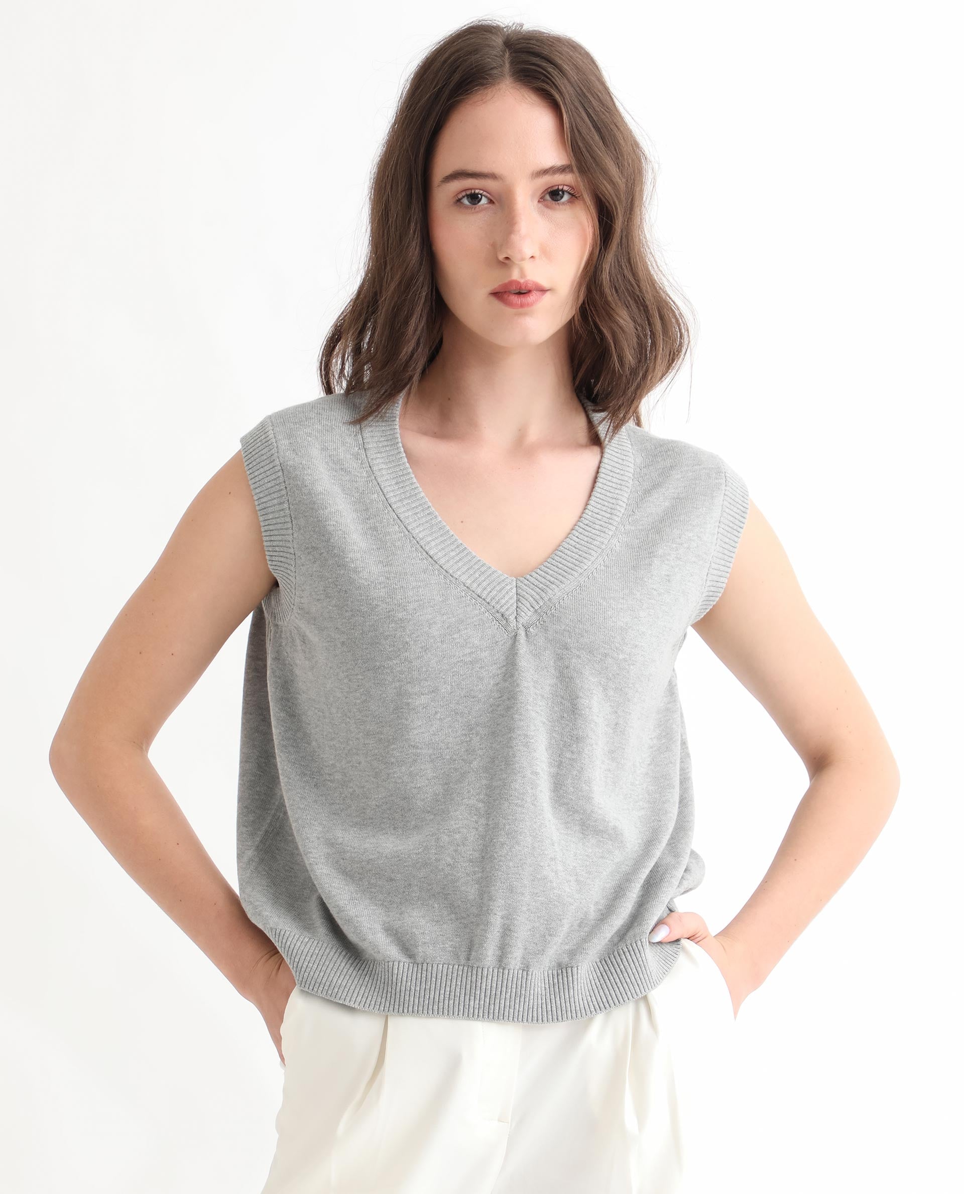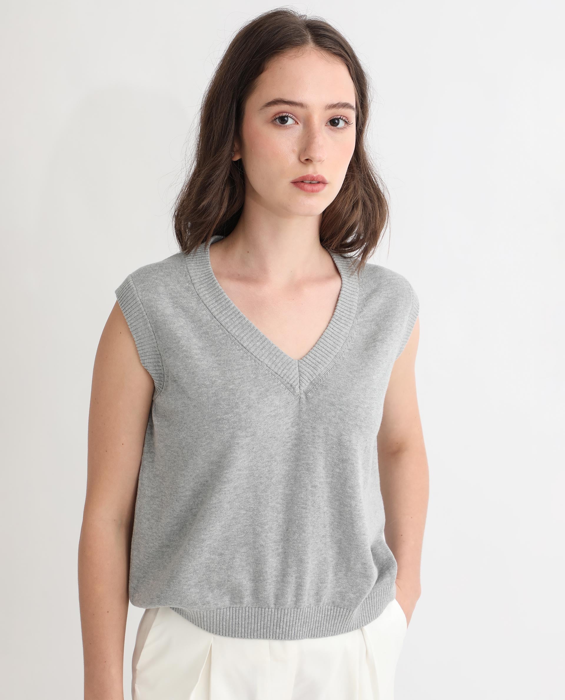 This Rareism Women's Madelyn sweater features a soft grey cotton fabric designed for breathable comfort. Its sleeveless, V-neck silhouette offers a refined and versatile style that fits easily under layers or stands alone. The regular fit ensures effortless wear throughout the day, combining classic simplicity with functional elegance for any casual or professional setting.