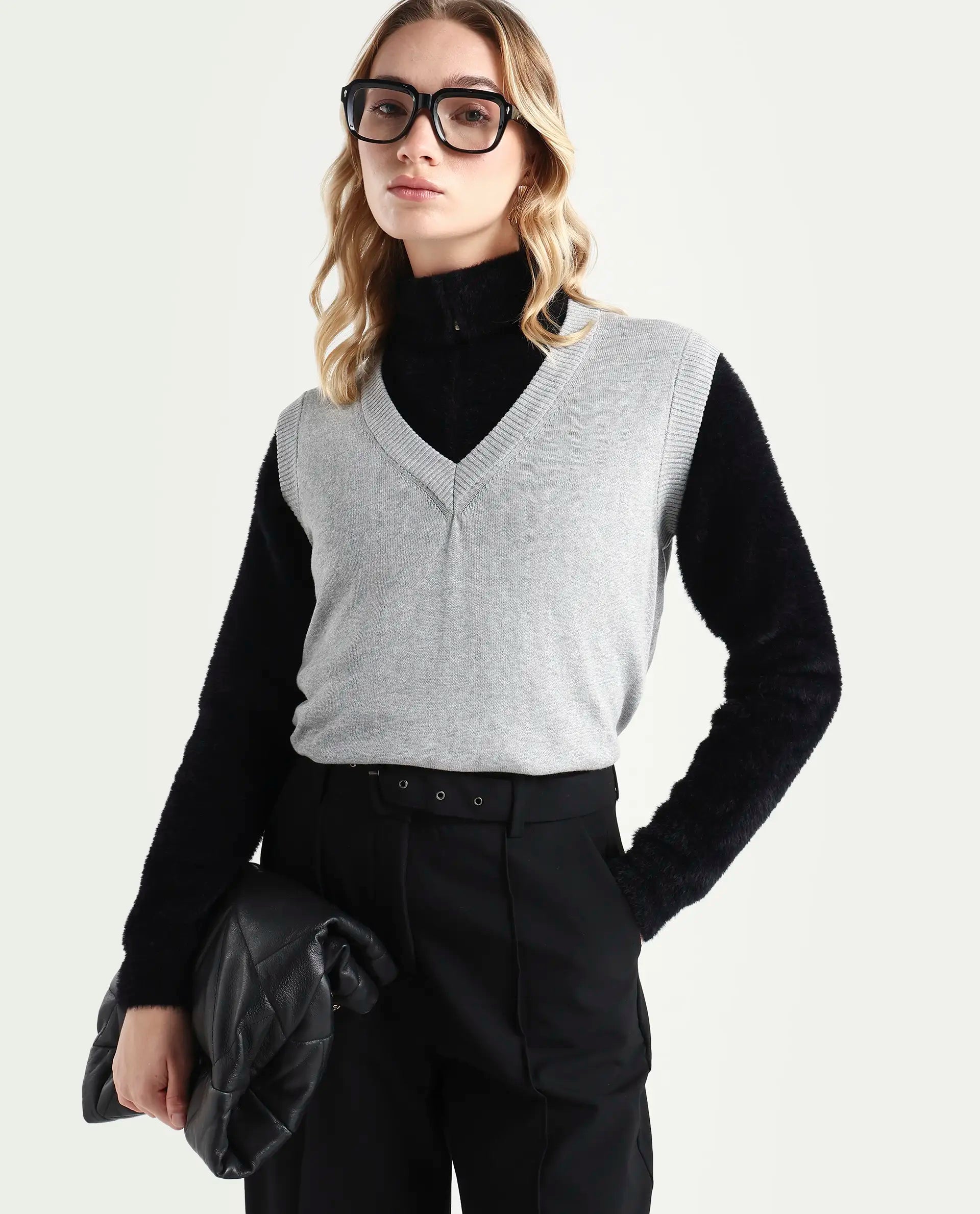 This Rareism Women's Madelyn sweater features a soft grey cotton fabric designed for breathable comfort. Its sleeveless, V-neck silhouette offers a refined and versatile style that fits easily under layers or stands alone. The regular fit ensures effortless wear throughout the day, combining classic simplicity with functional elegance for any casual or professional setting.