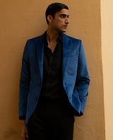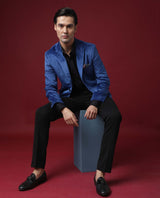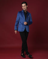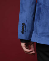 Rare Rabbit Men's Mazey Blue Velvet Plain Tailored Fit Full Sleeve Lapel Neck Blazer