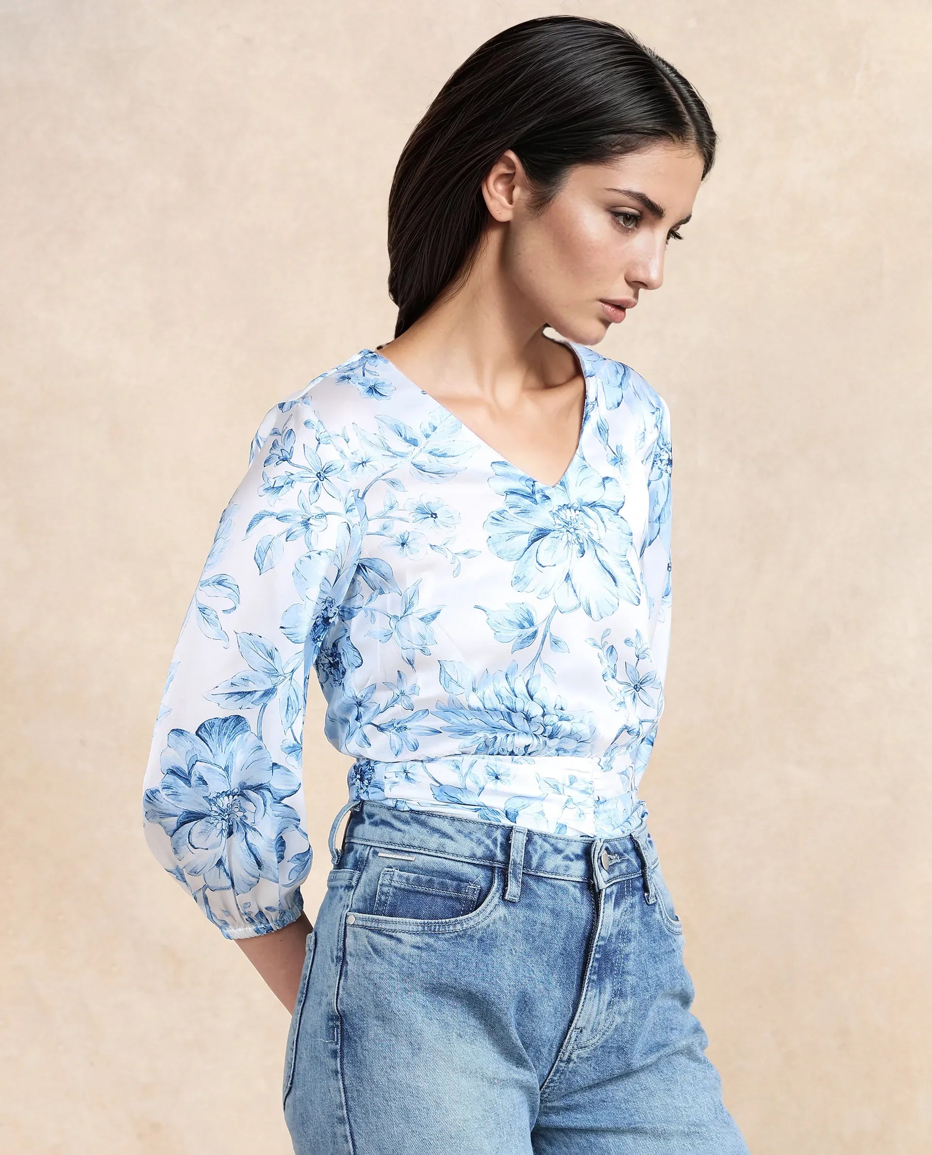 Elevate your resort wardrobe with this stunning floral printed V-neck top, perfect for any stylish getaway. This light blue women's top features a convenient zipper closure and a flattering regular fit. The cropped length and woven fabric add a touch of modern elegance, while the 3/4th bell sleeves enhance its chic appeal. Ideal for those seeking a blend of comfort and style, this top is a must-have for fashion-forward individuals. Embrace the latest trends with this floral print masterpiece, designed to make you stand out effortlessly. Discover the perfect addition to your collection today.