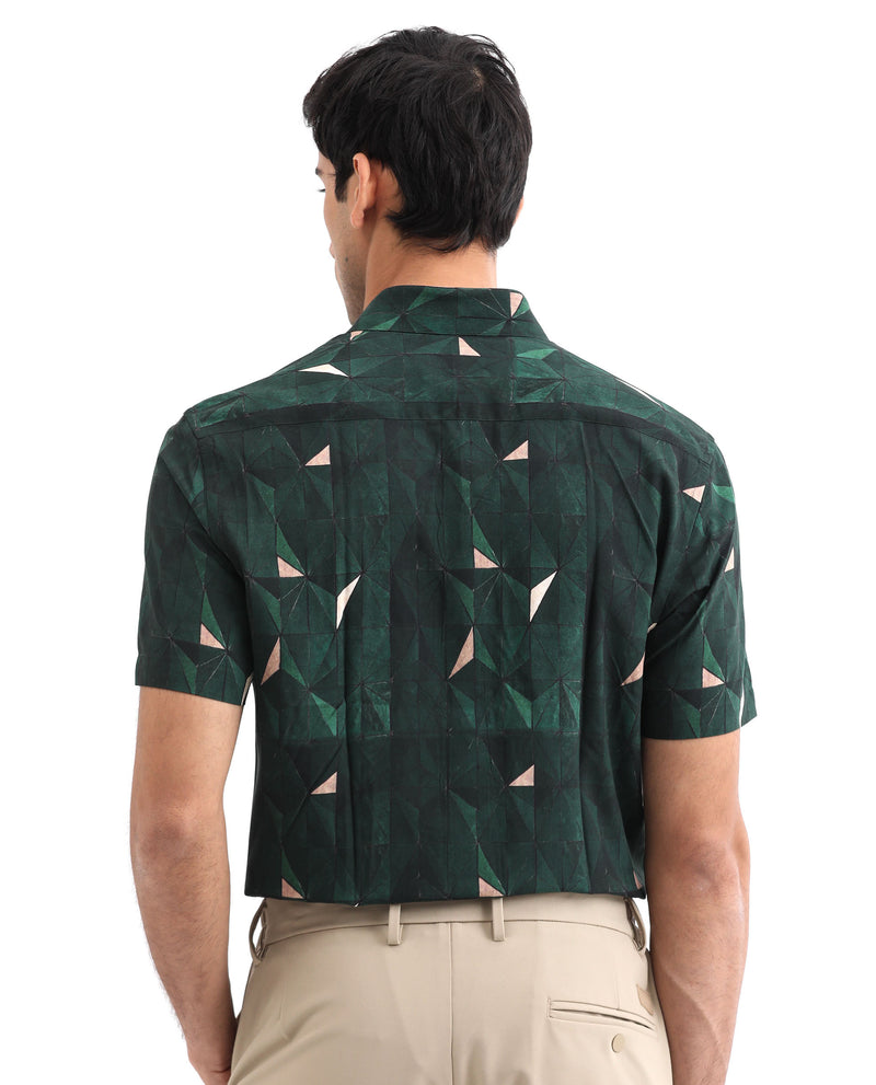 Rare Rabbit Men's Mose Green Viscose Fabric Half Sleeves Geometric Print Shirt