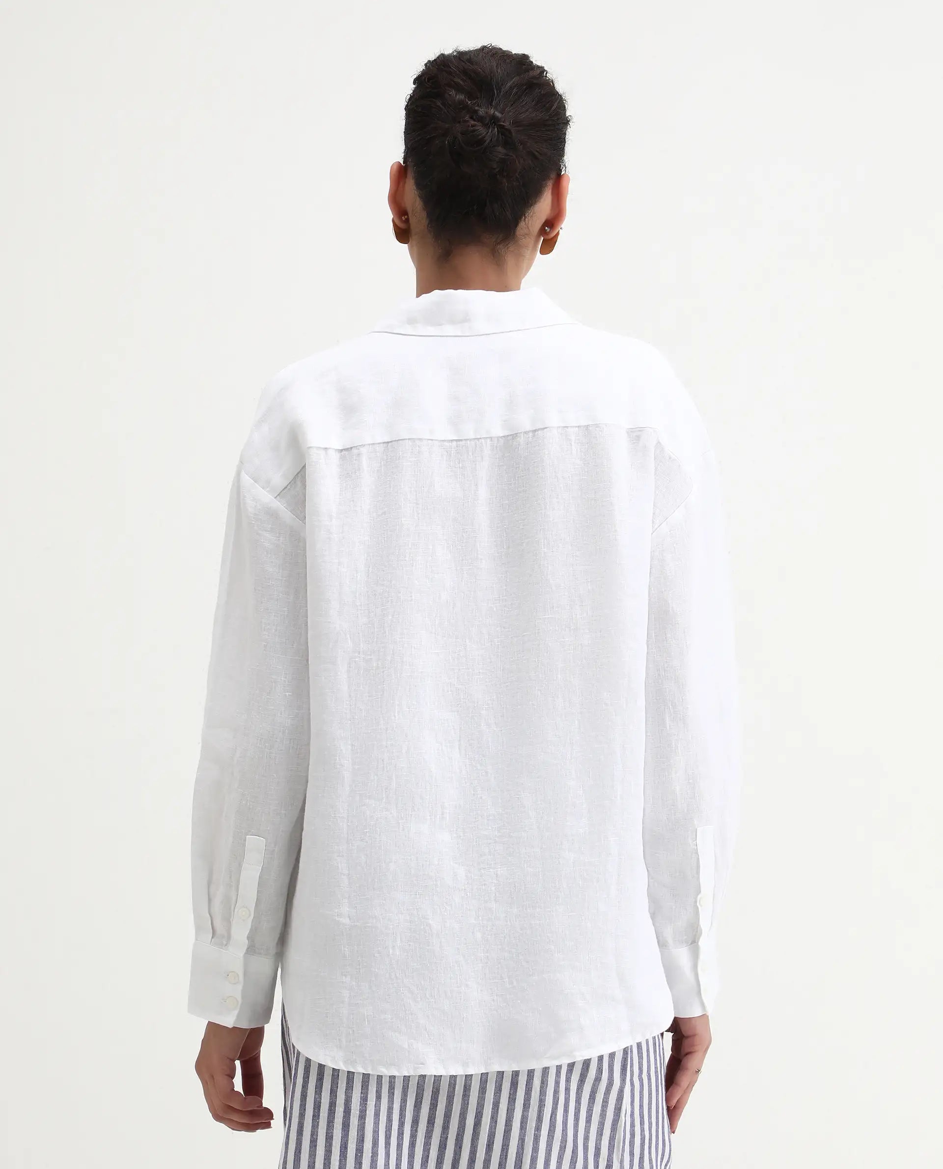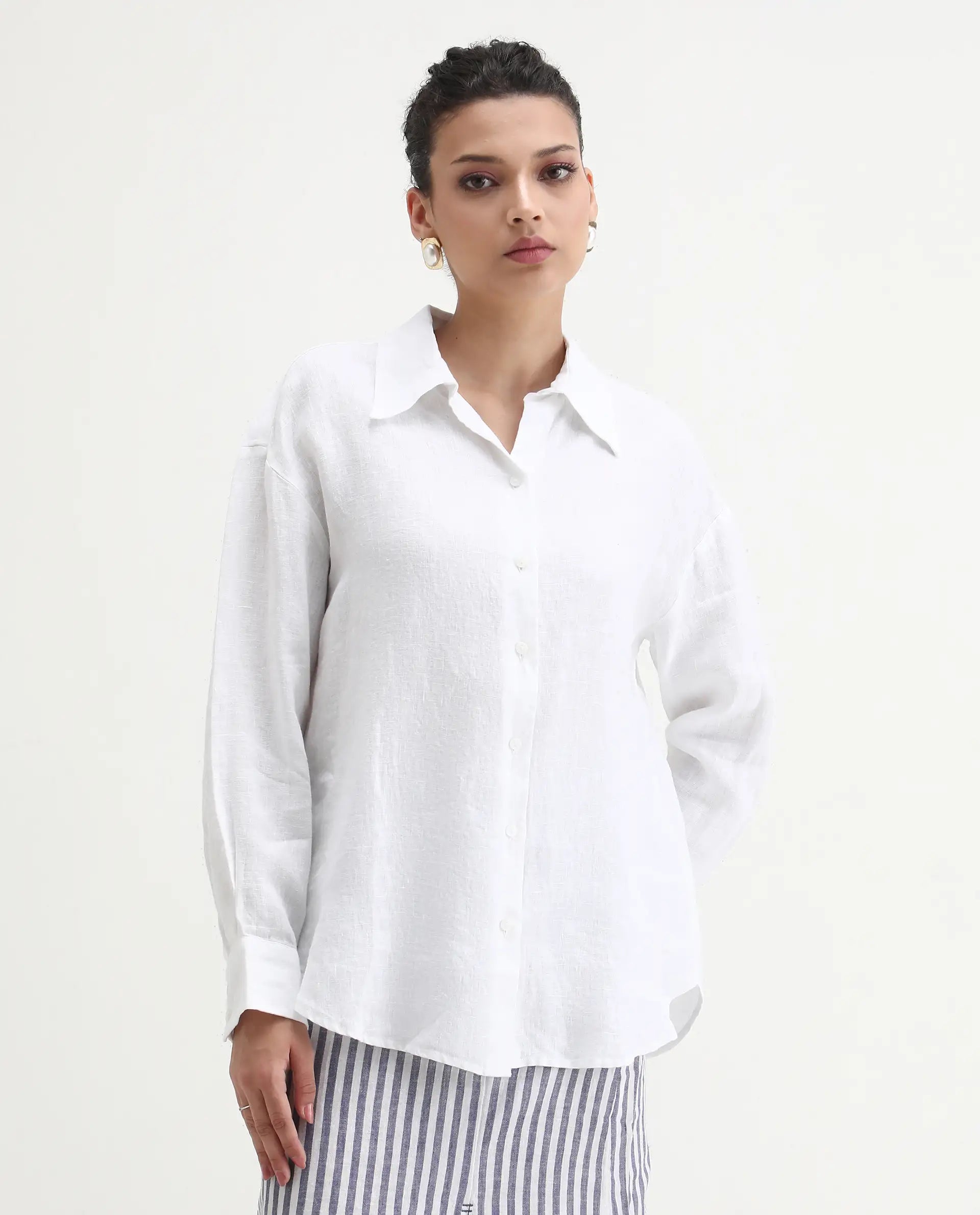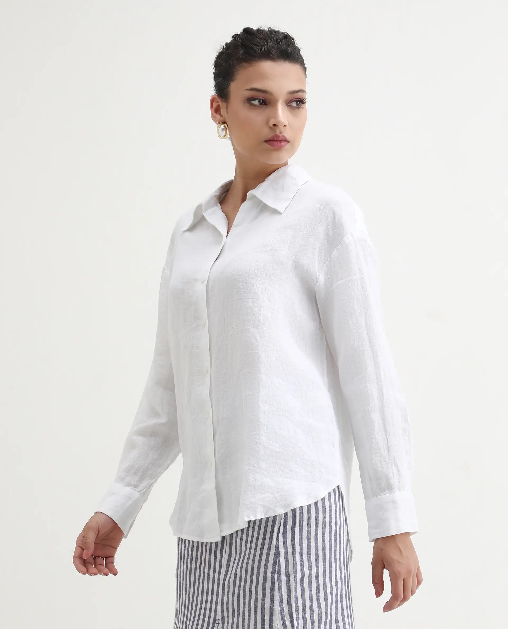 This Rareism Women's Nenorat shirt features a breathable white linen fabric, ideal for comfort and style in warm weather. Its spread collar and boxy fit offer a modern silhouette that pairs well with both casual and professional looks.