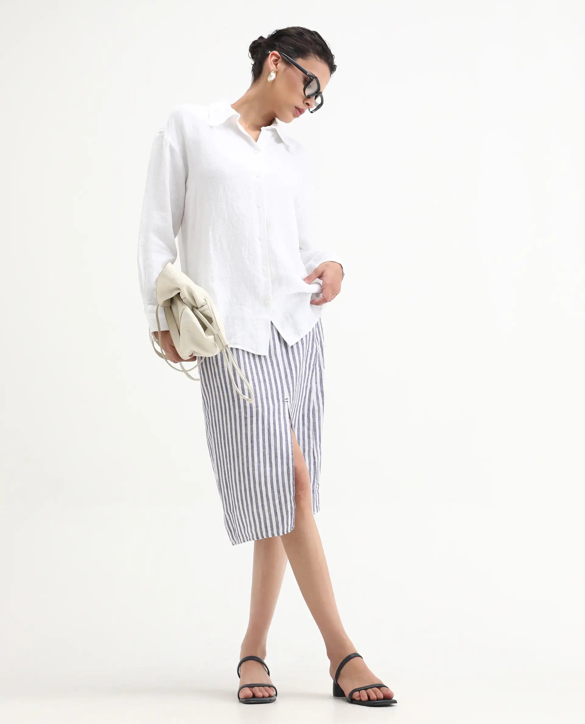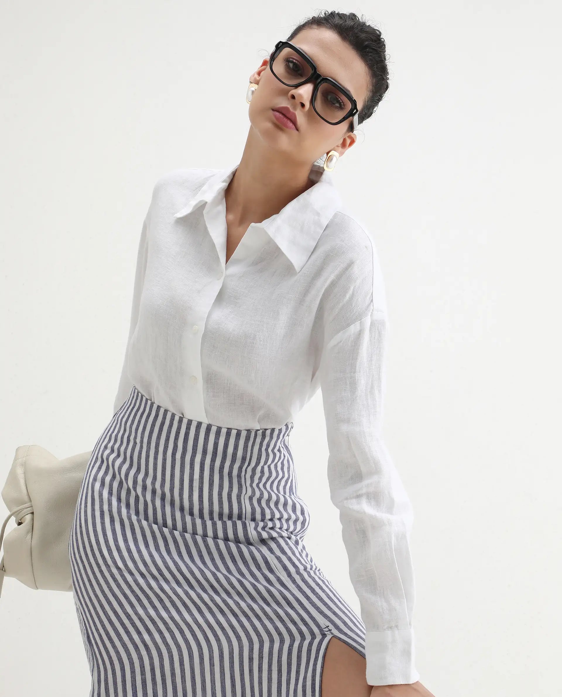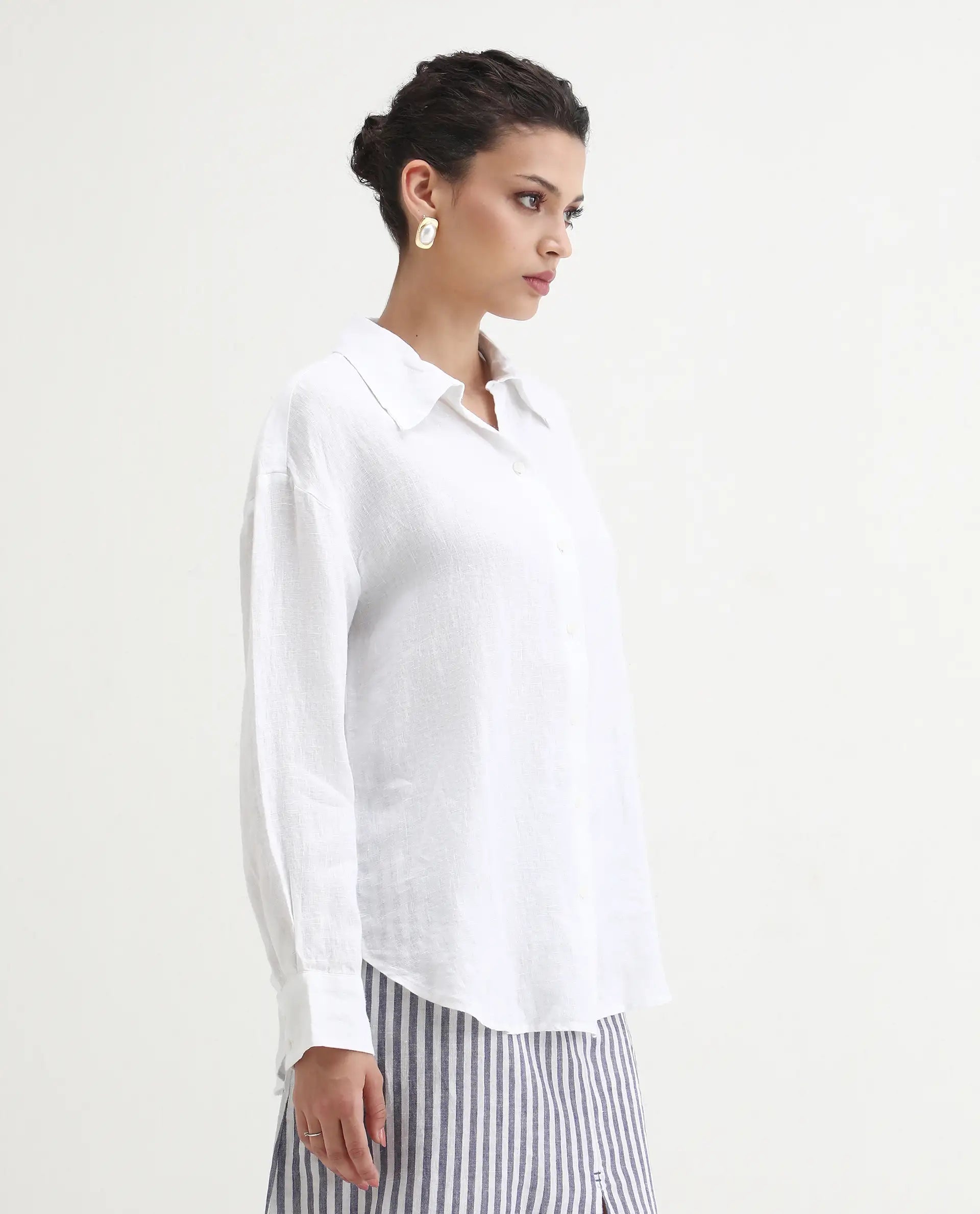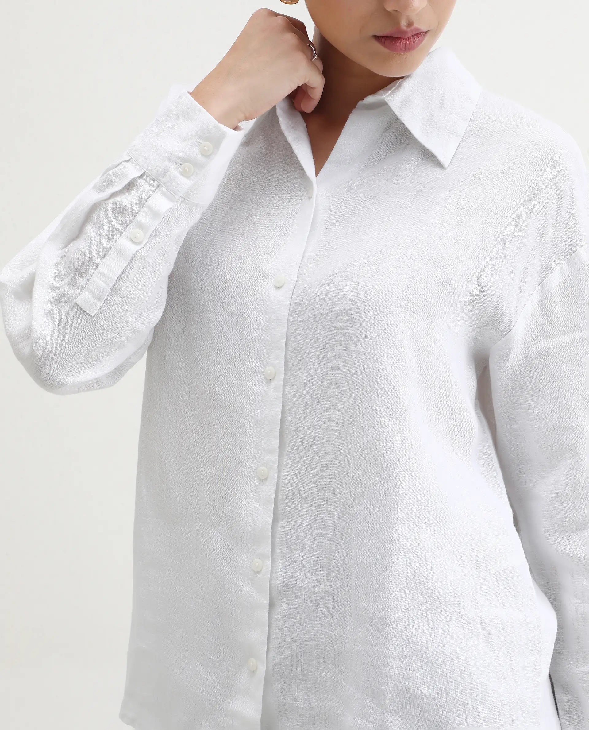 This Rareism Women's Nenorat shirt features a breathable white linen fabric, ideal for comfort and style in warm weather. Its spread collar and boxy fit offer a modern silhouette that pairs well with both casual and professional looks.