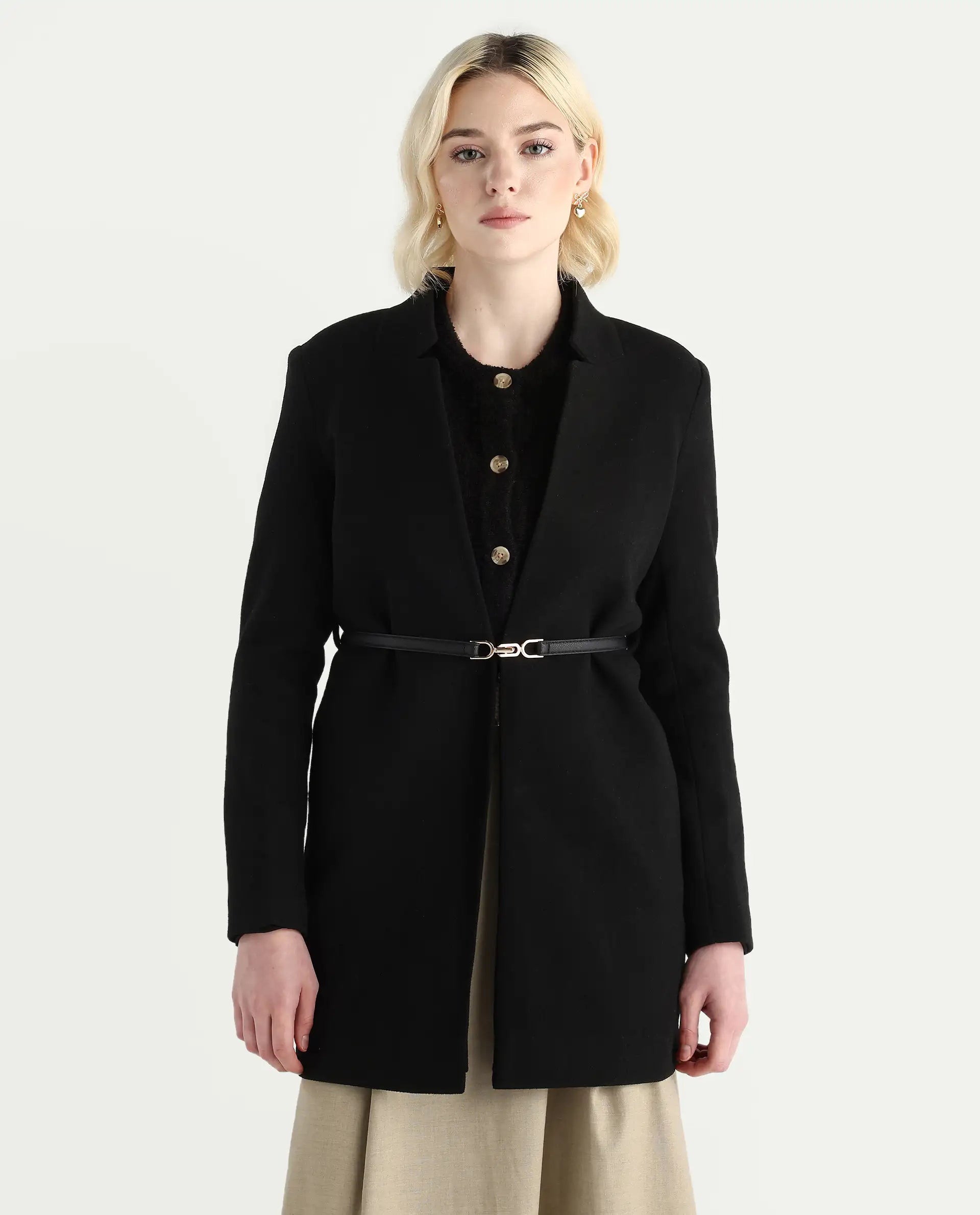 NEXMARIO - BLACK SOLID LONG JACKET WITH BELT