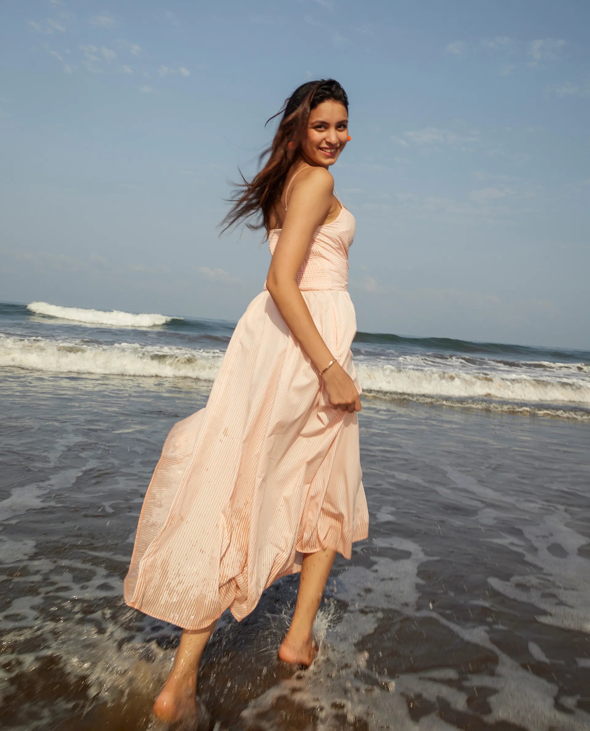 - The model (Chest-34, Waist-28, Hips-38, Height-178 cms) is wearing a size XS.