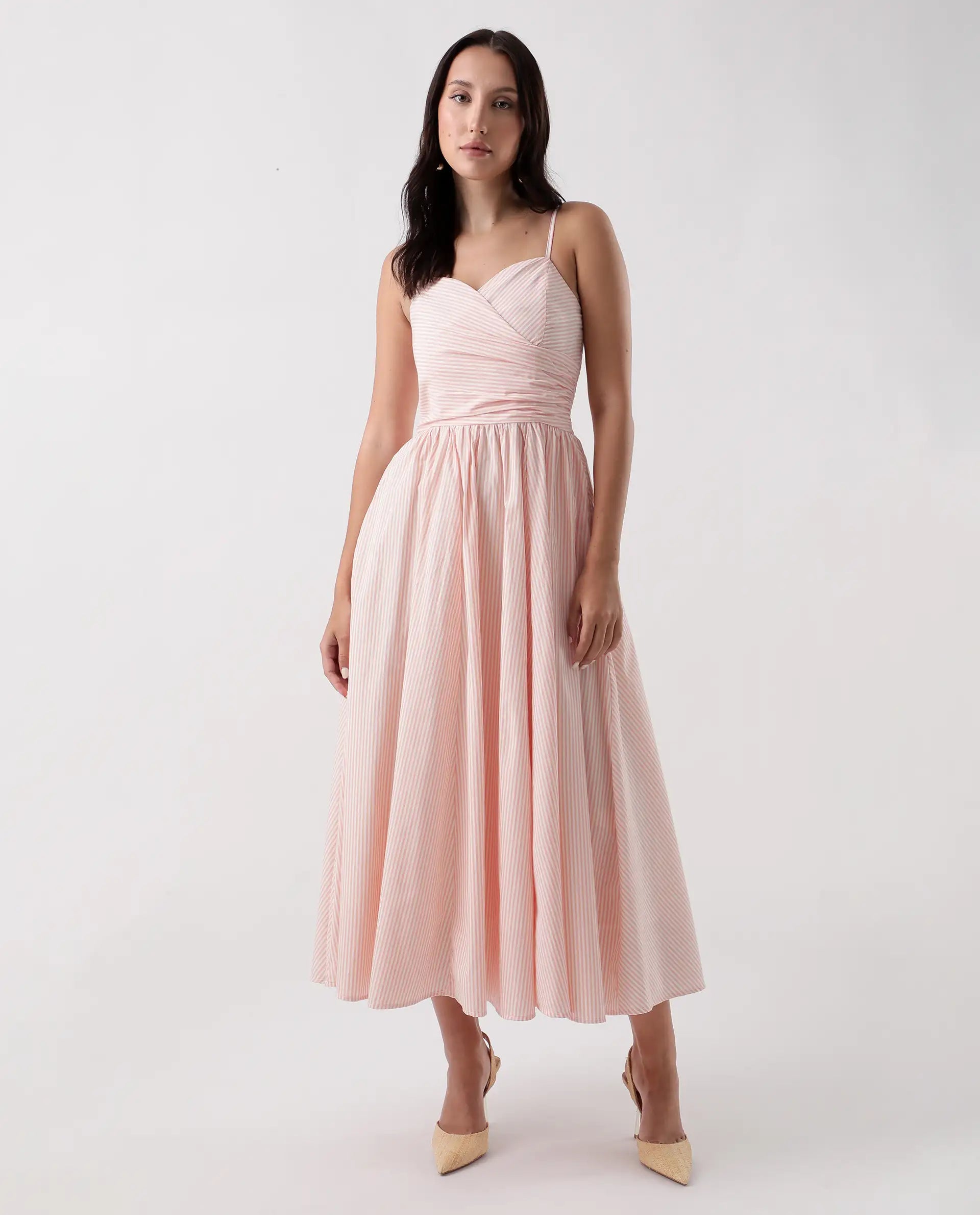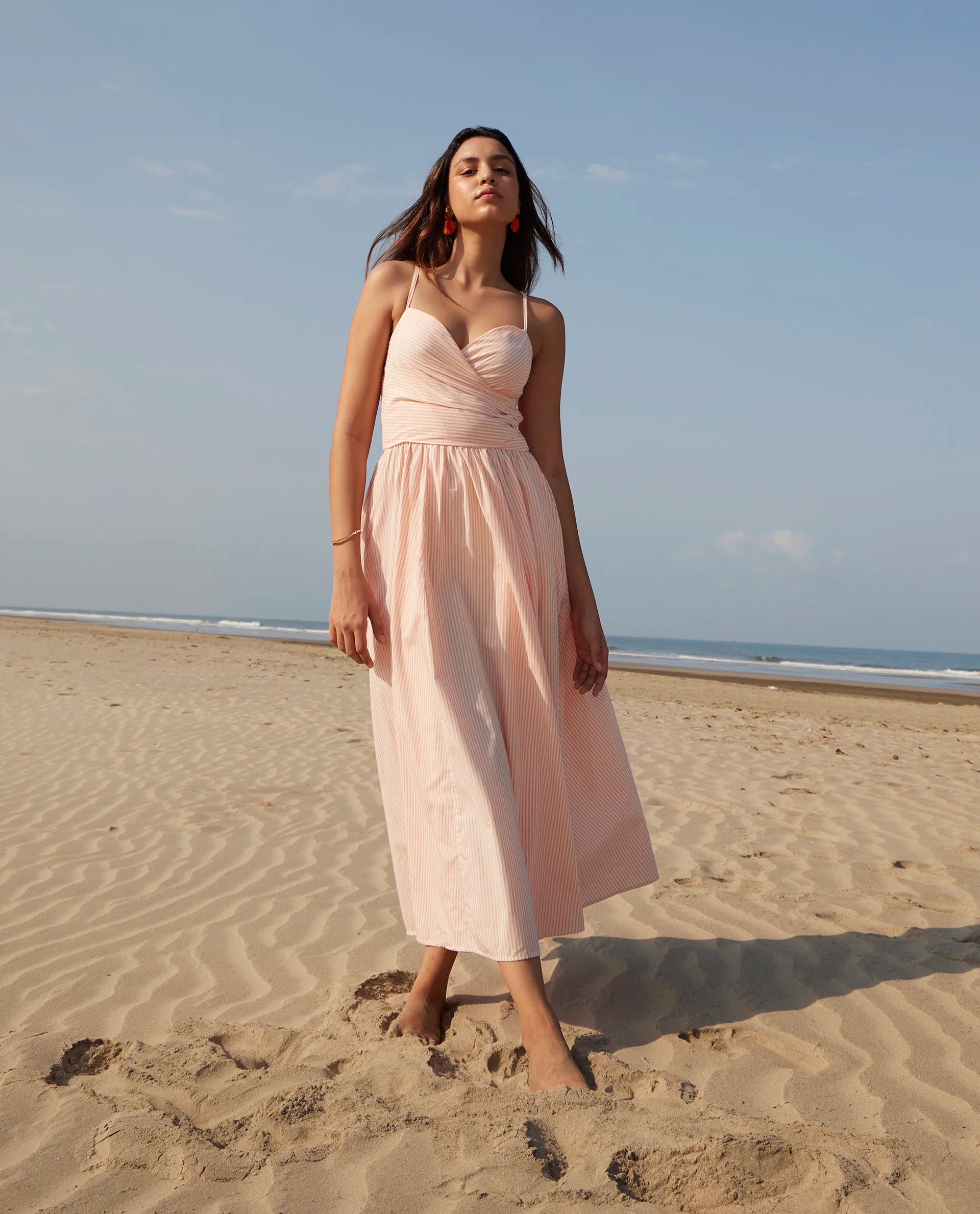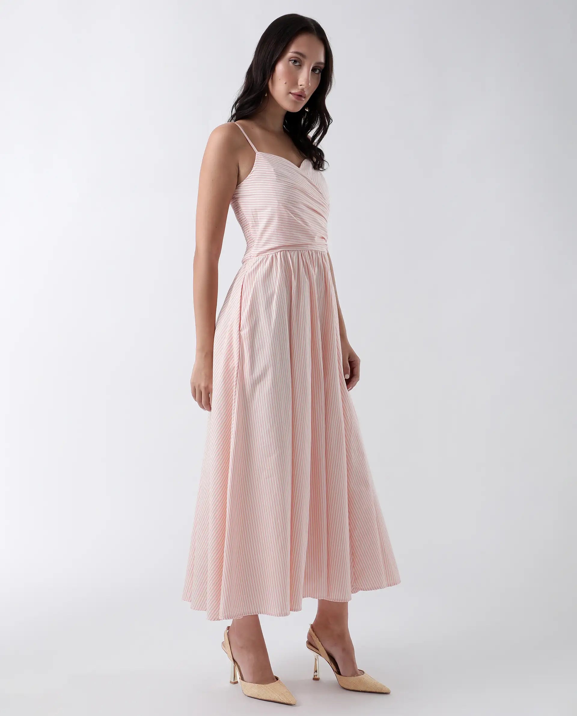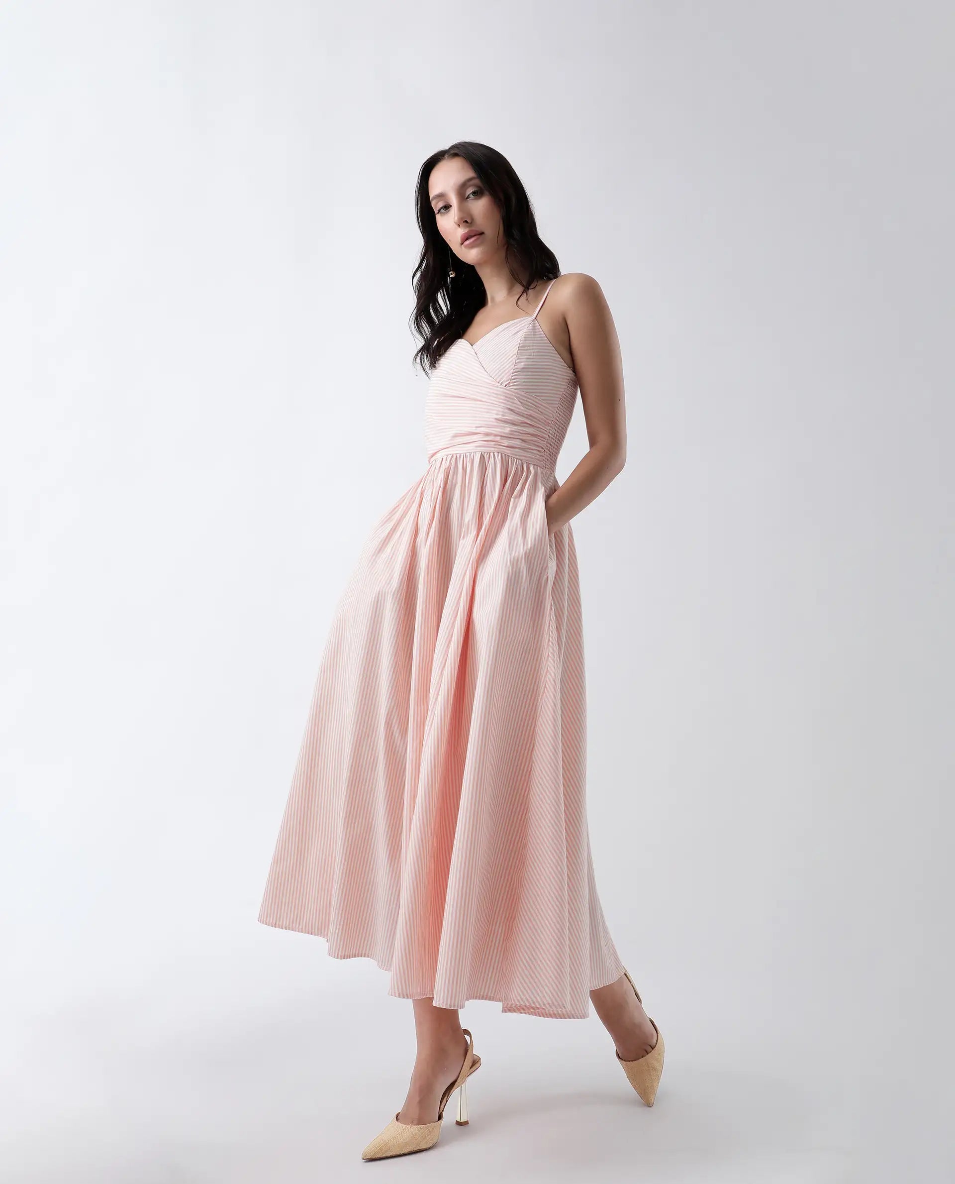 This Rareism Women Nuloon Dress features a soft, comfortable 100% cotton blend fabric, a stylish sweatheart neckline, and a flattering fit and flare design. The zipper closure and midi length make it a versatile and easy-to-wear dress, perfect for any occasion. Embrace your unique style with the trendy narrow stripes pattern.