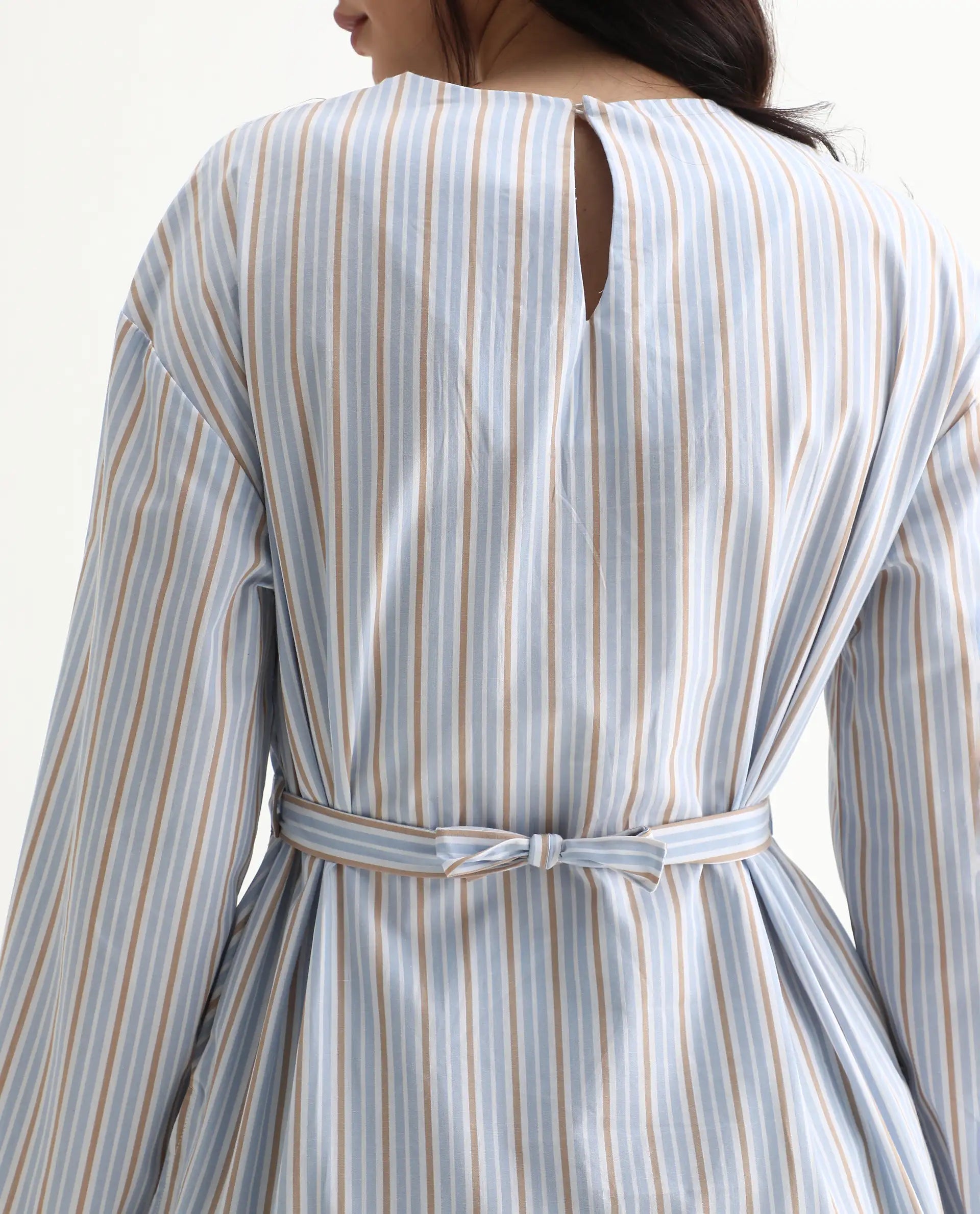 Crafted from soft cotton fabric, this Rareism top features extended sleeves and a classic round neck for a comfortable fit. The button closure adds a refined touch, while the subtle striped pattern enhances its timeless appeal. Ideal for both casual and semi-formal occasions, this light blue top combines style with breathable comfort.