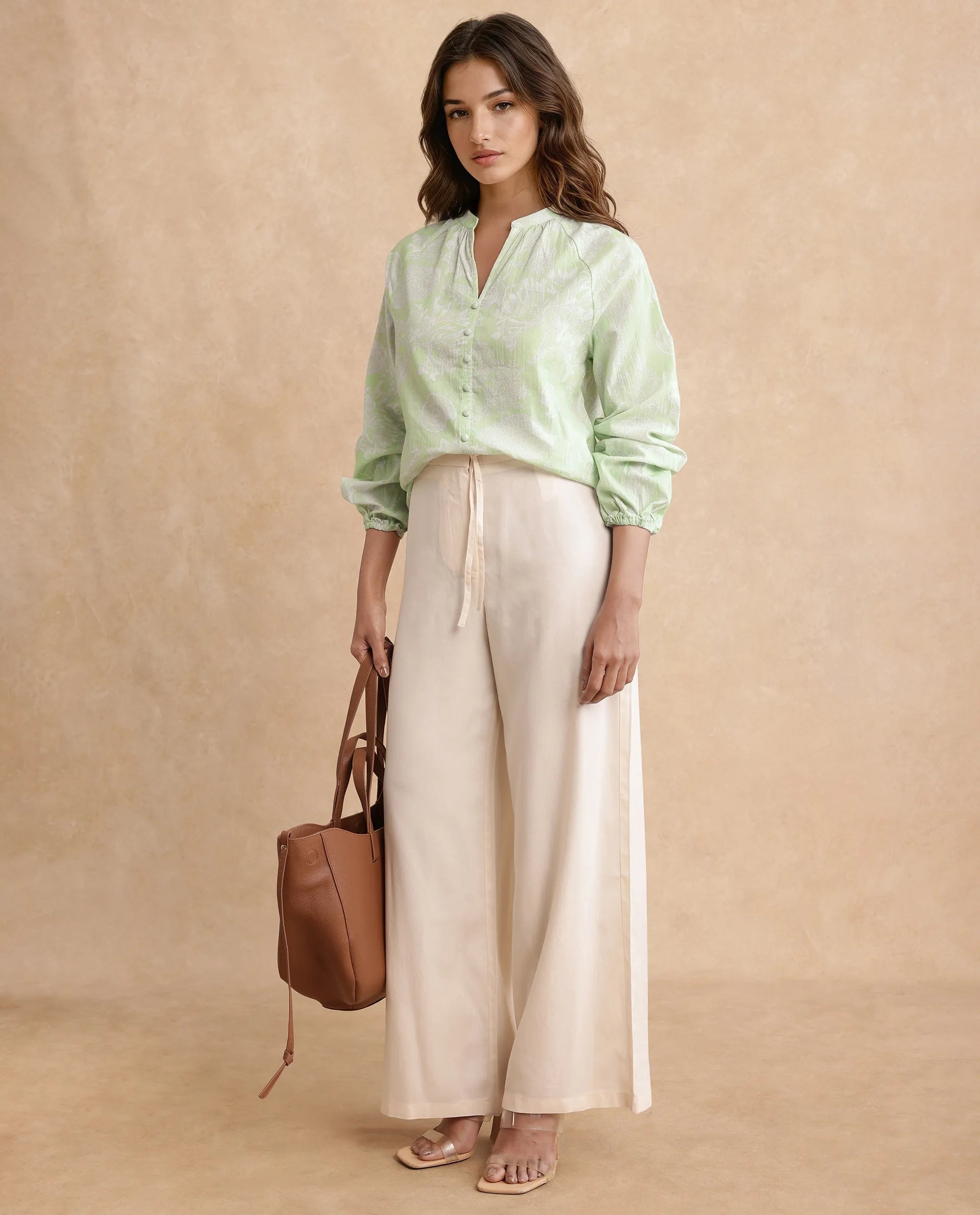 Introducing the Rareism Women Prenser Green Top, crafted with 100% cotton fabric for ultimate comfort. Featuring a collared neck and button closure, this top offers a relaxed fit and boasts a stylish abstract print. Elevate your wardrobe with this must-have addition.