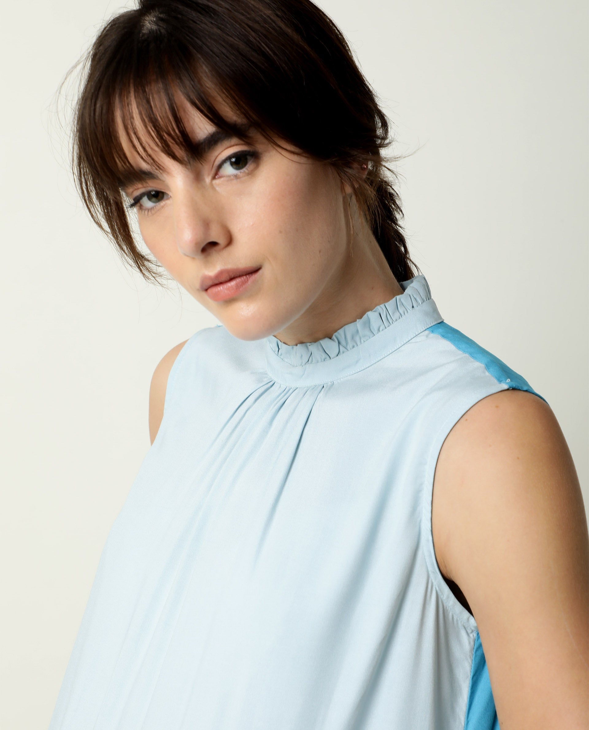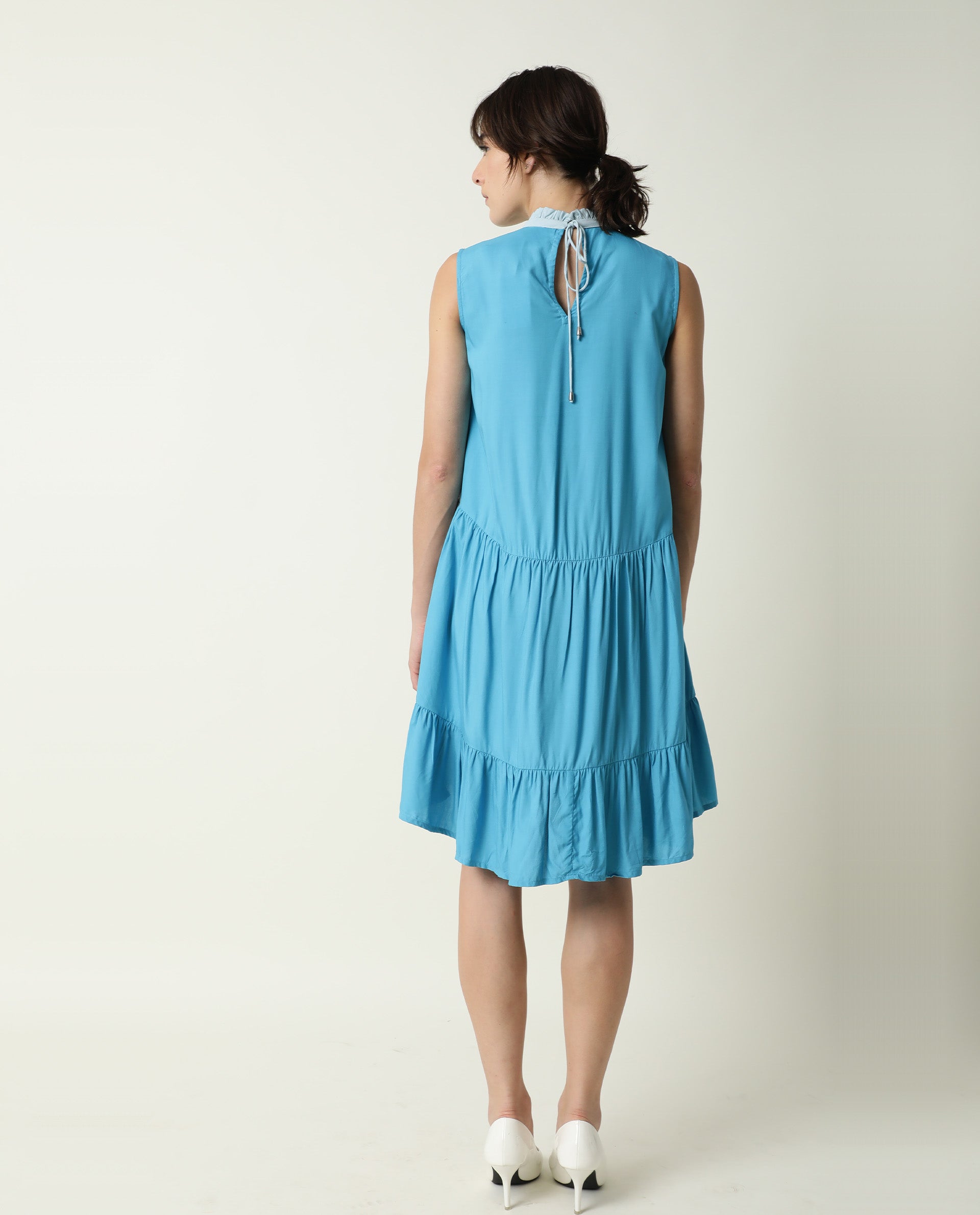 -With band collar and ruffled neck, light gathers at front and multiple tiers and side pockets.