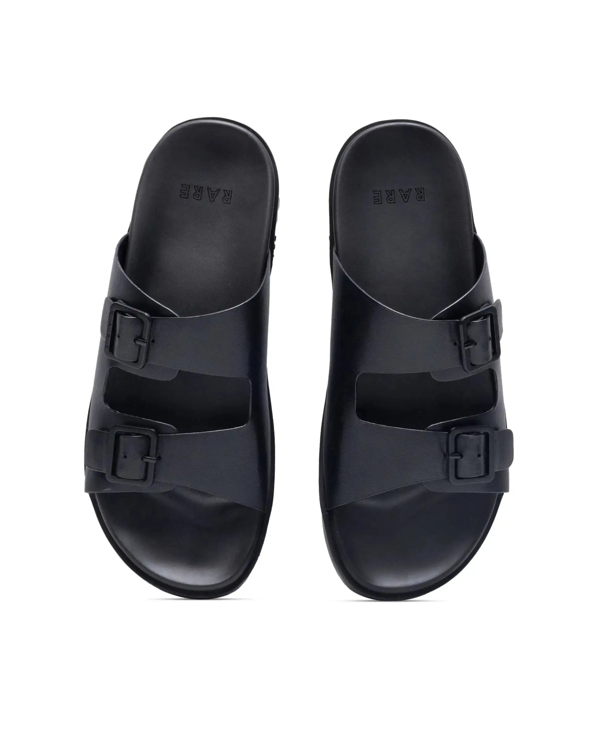 Upgrade your footwear game with Rare Rabbit's Raro Black Leather Slip-On Closure Sandal. Made from premium leather, these slip-ons provide both style and comfort. Perfect for any occasion, these sandals are a must-have for the modern man.