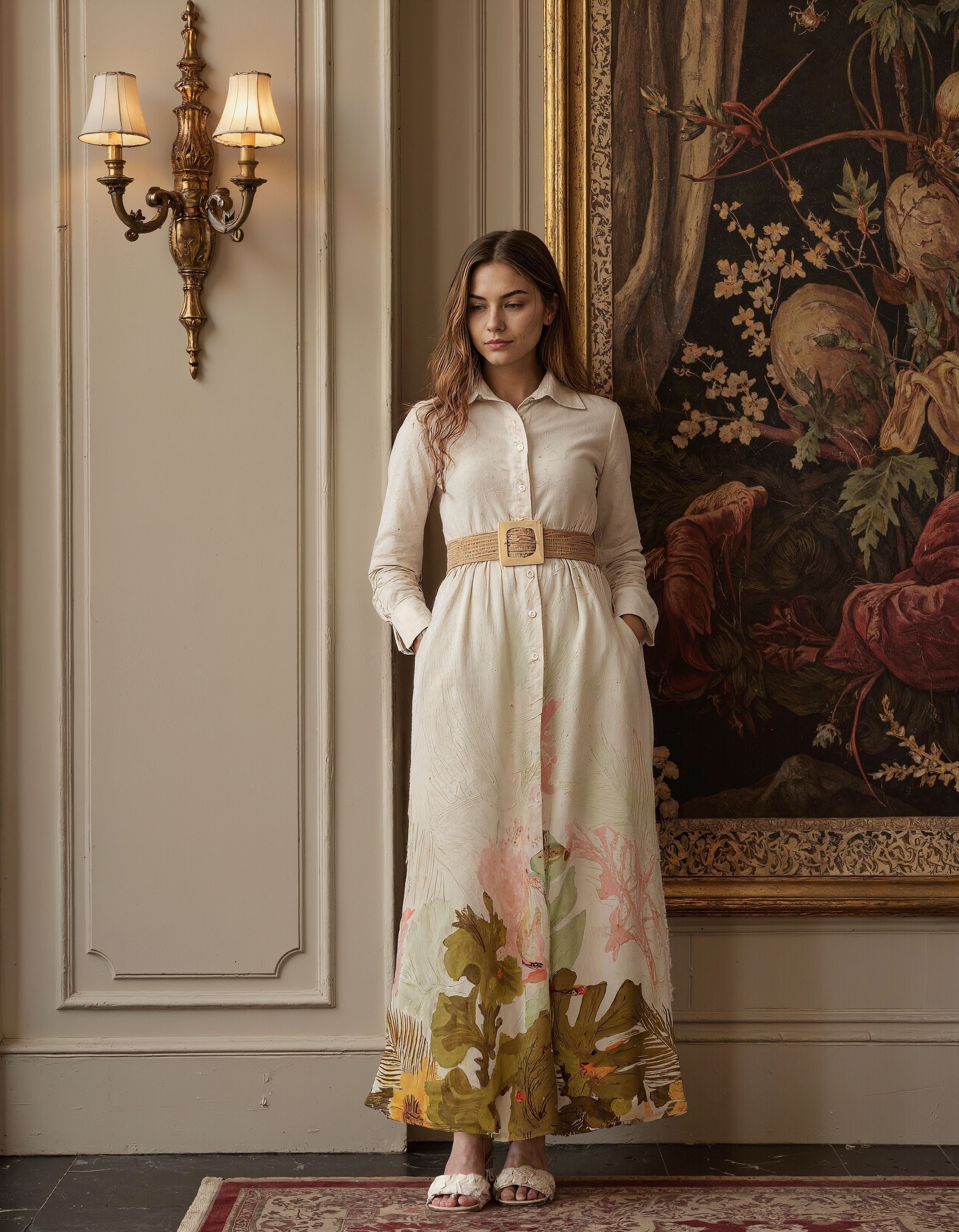 Elevate your wardrobe with this elegant off-white maxi dress, featuring a stunning floral pattern that exudes sophistication and charm. Perfect for any occasion, this dress combines comfort and style effortlessly. The lightweight 100% Cotton fabric ensures a graceful flow. Pair it with your favorite sandals or heels for a complete look that turns heads.