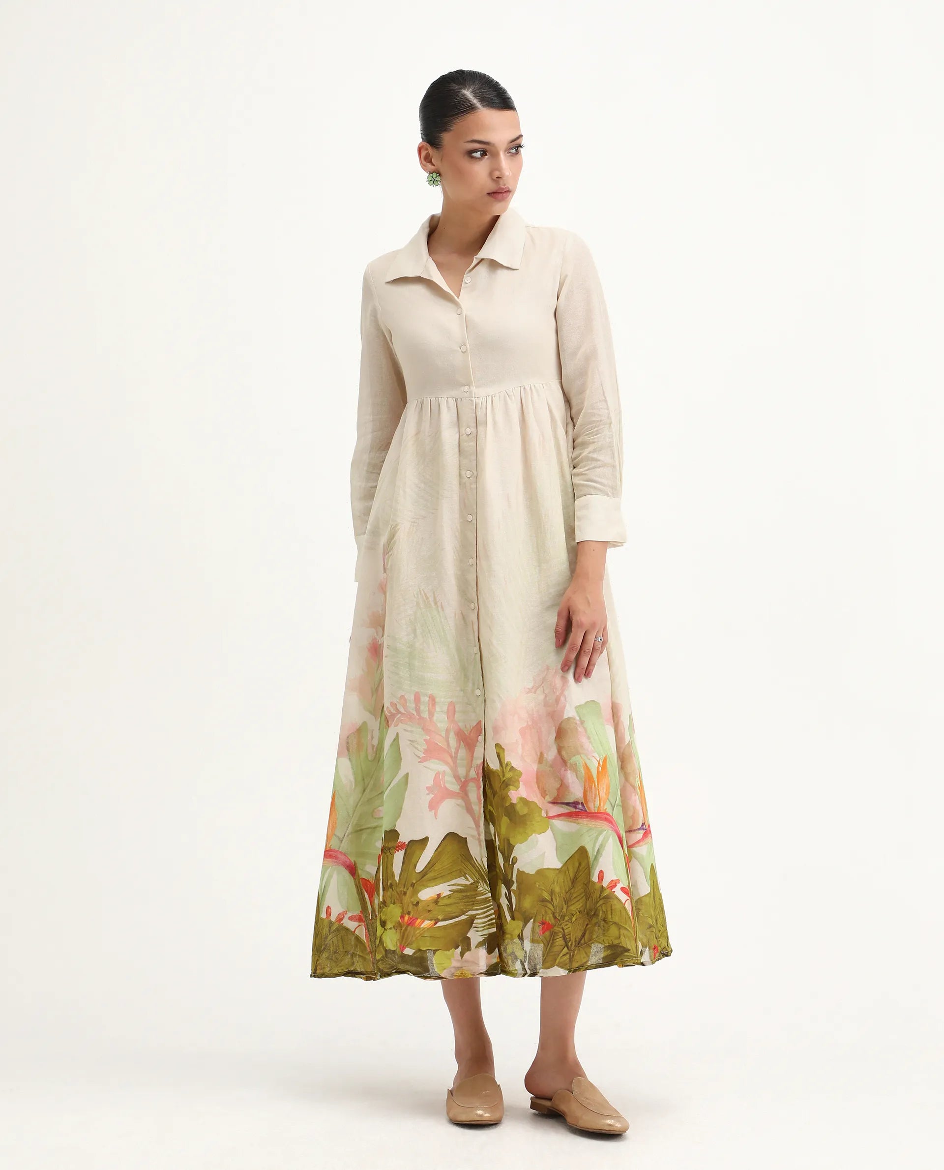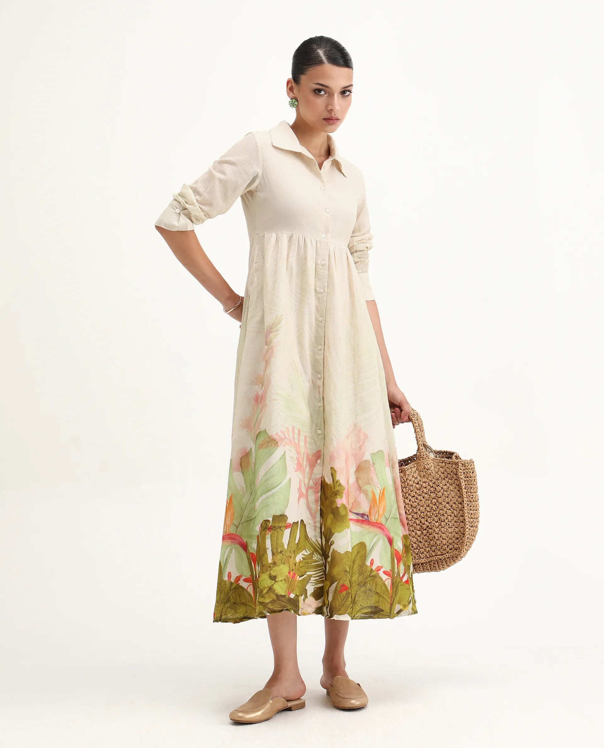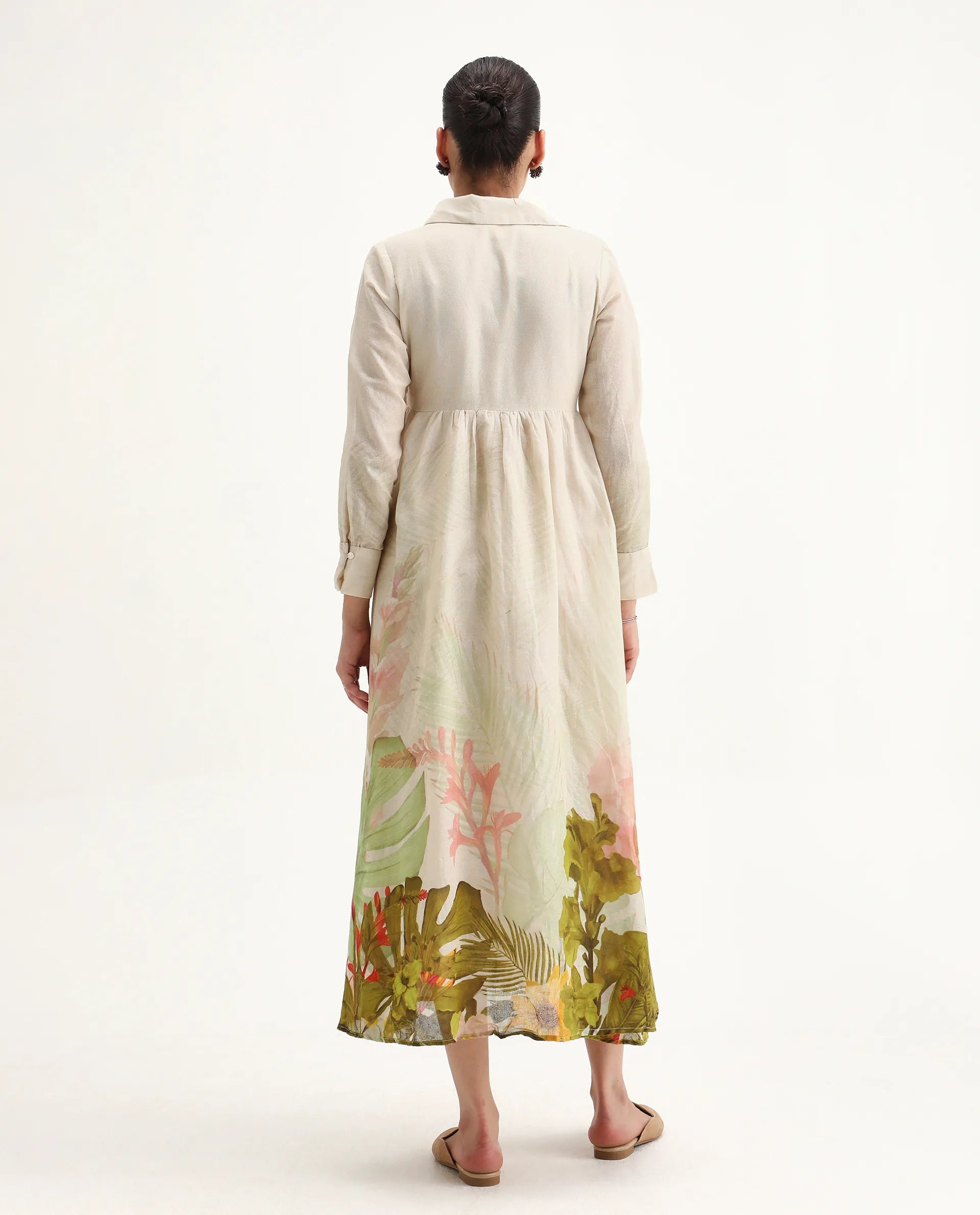 Rareism Women's Ronai Off White Cotton Spread Collar Tropical Print Cuffed Sleeve Maxi Flared Dress