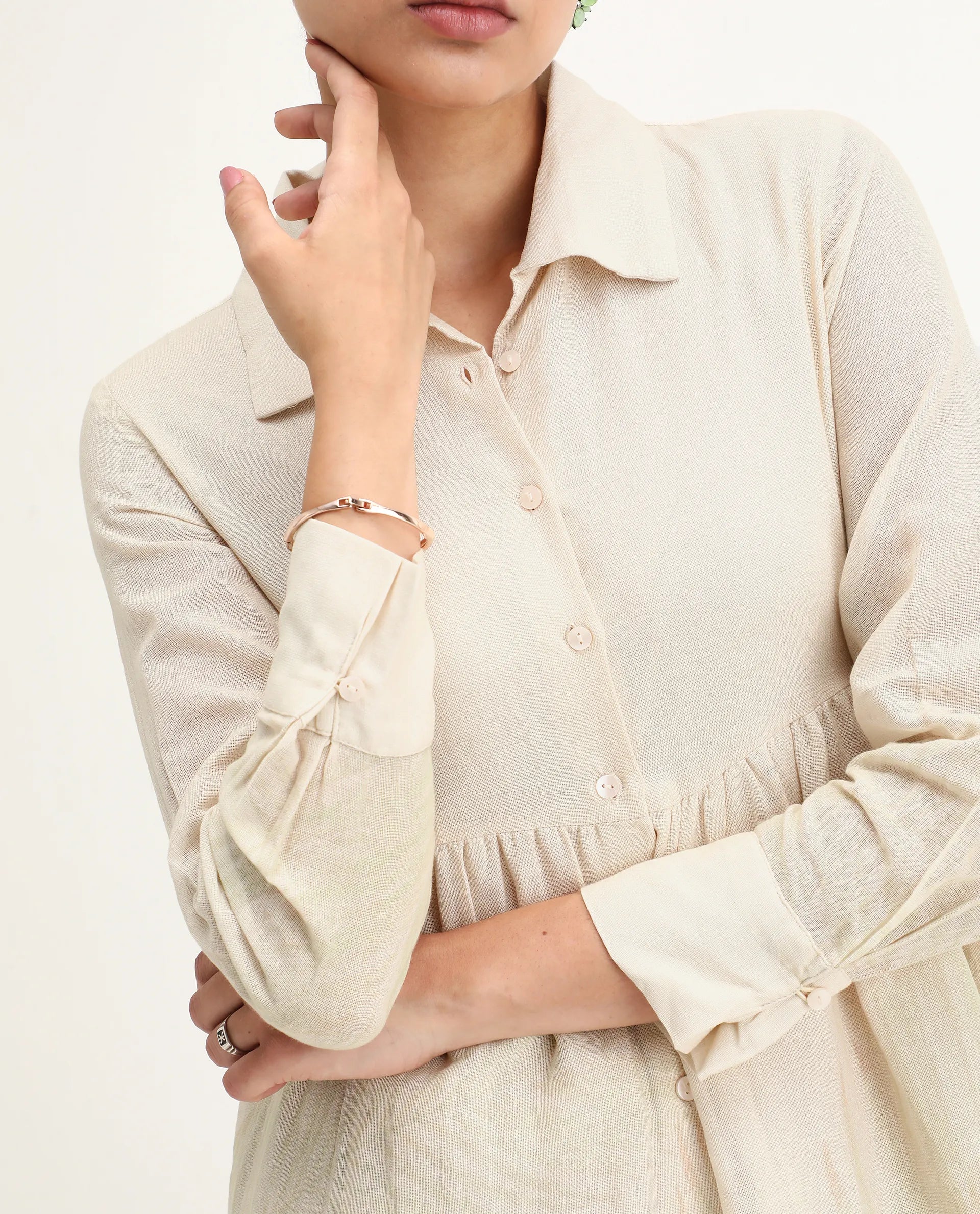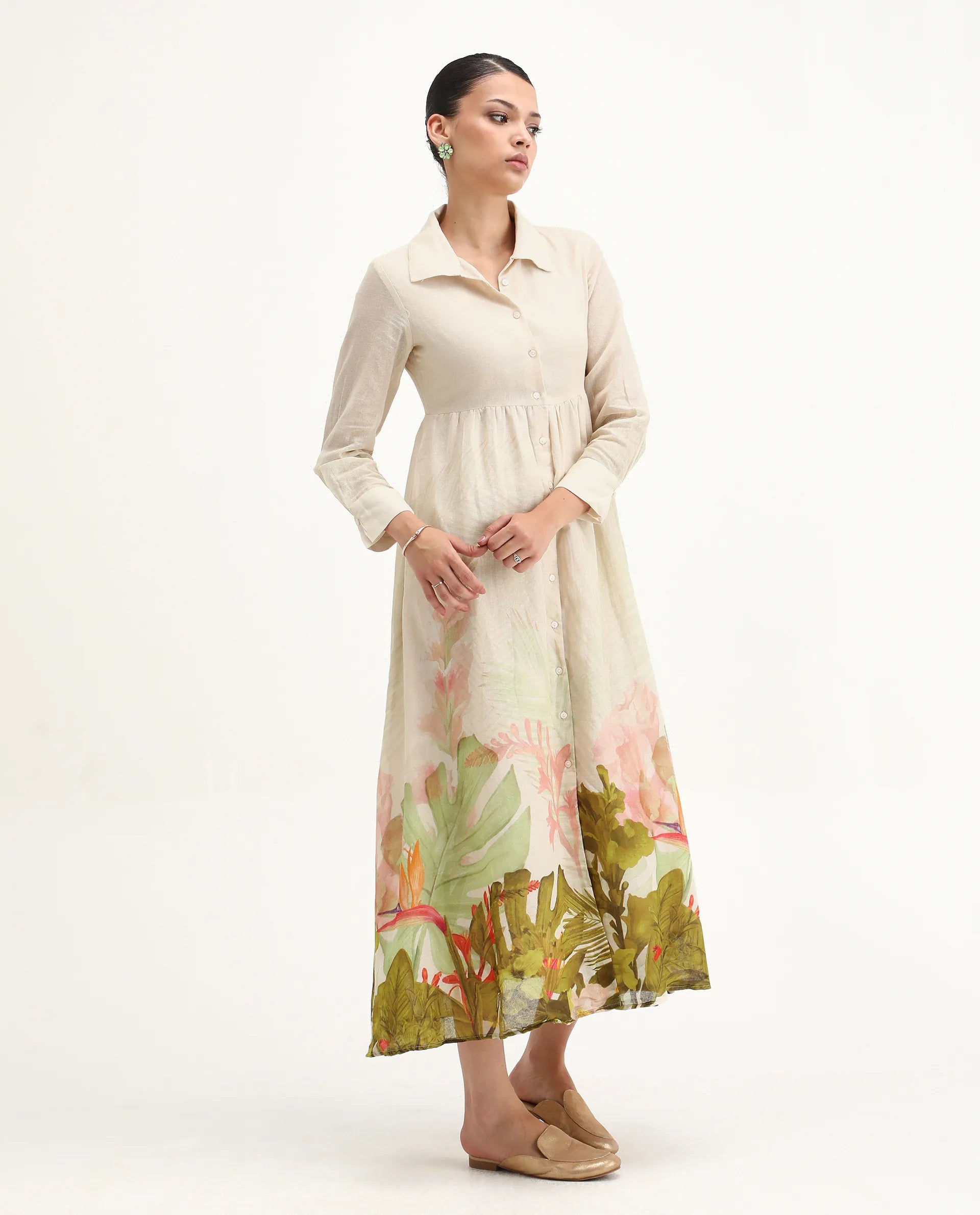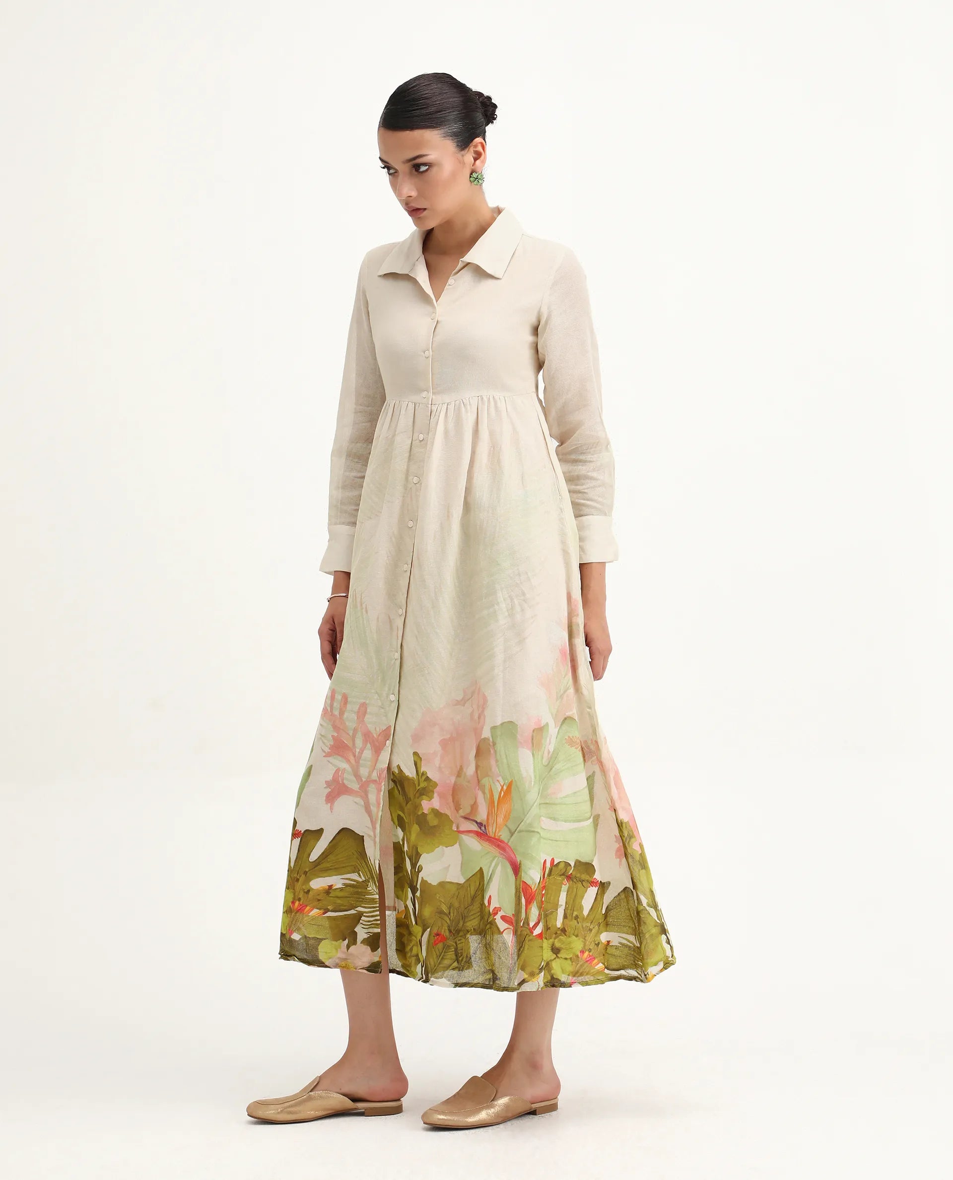 Rareism Women's Ronai Off White Cotton Spread Collar Tropical Print Cuffed Sleeve Maxi Flared Dress