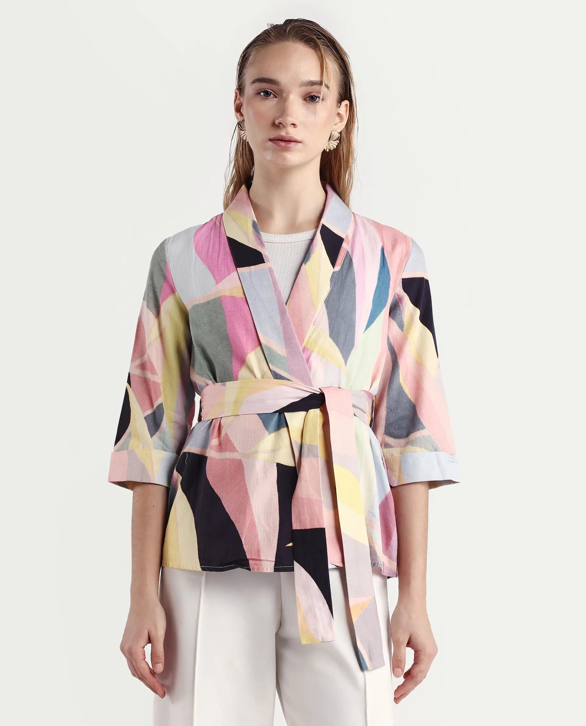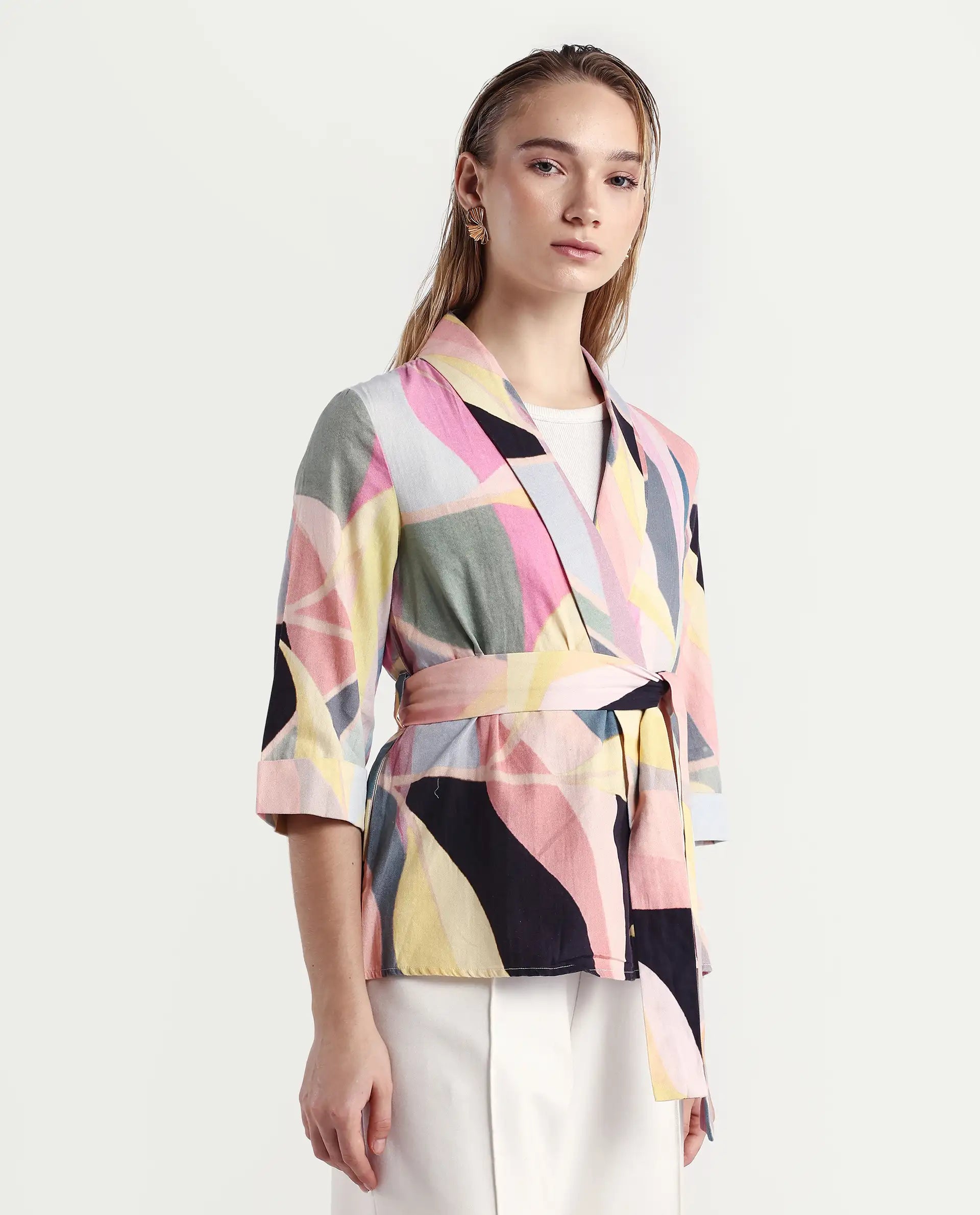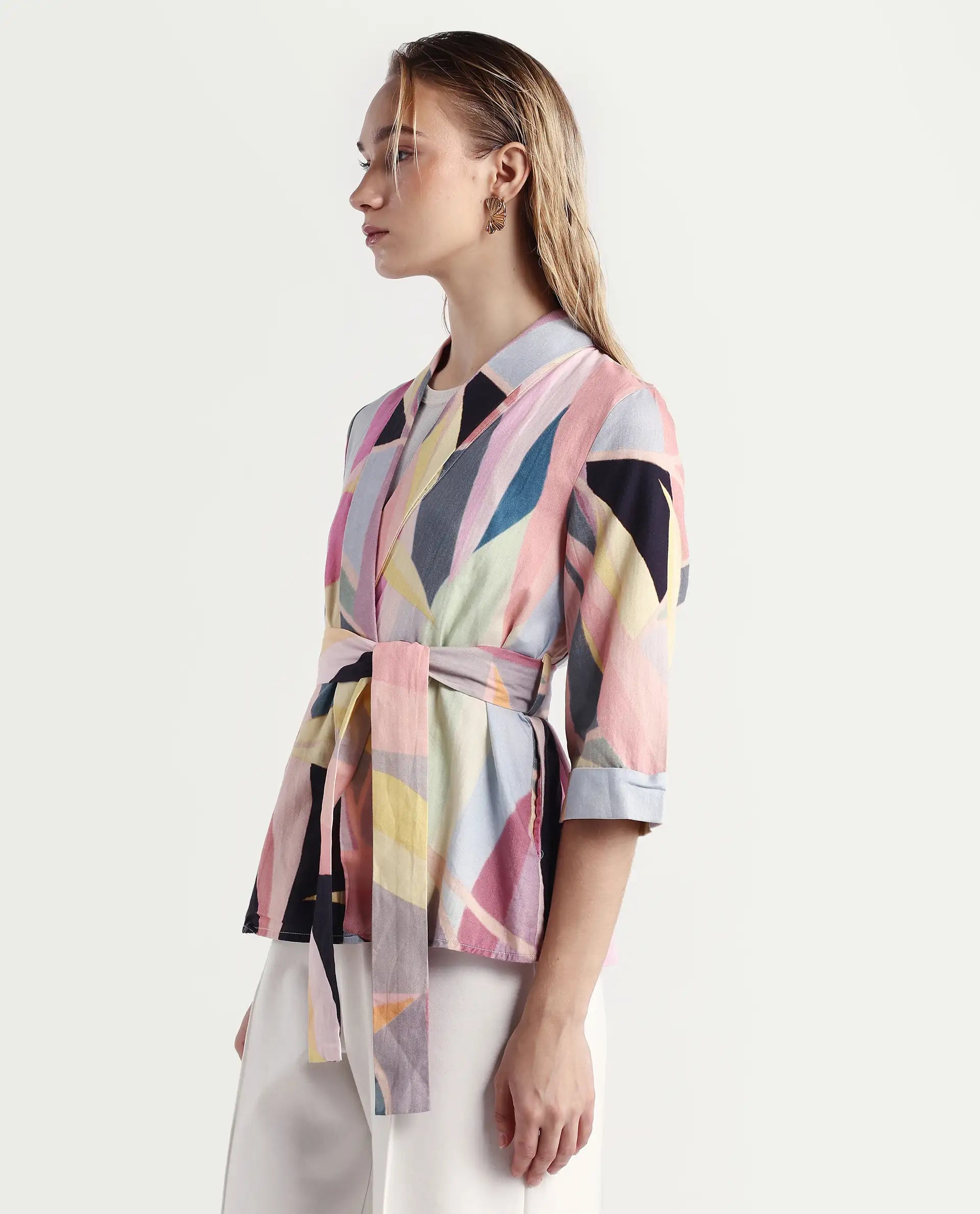 A abstract printed overlayer in 3/4th sleeve and tie-up at waist.