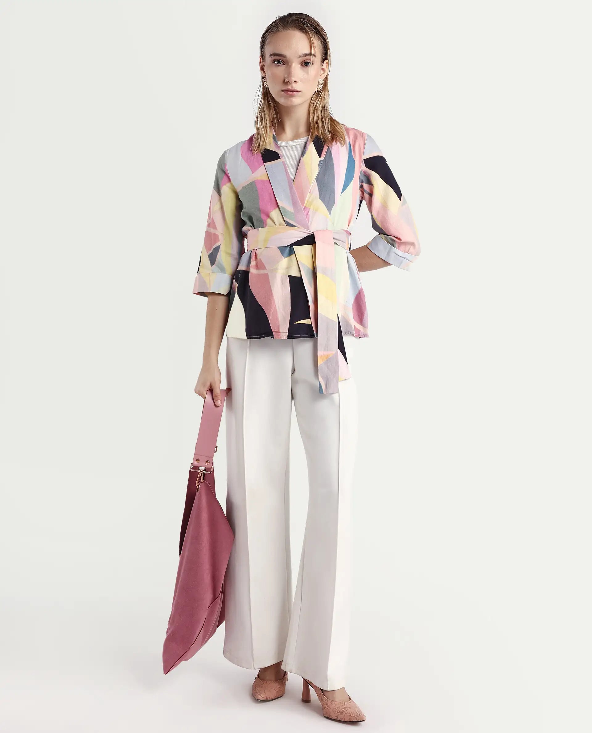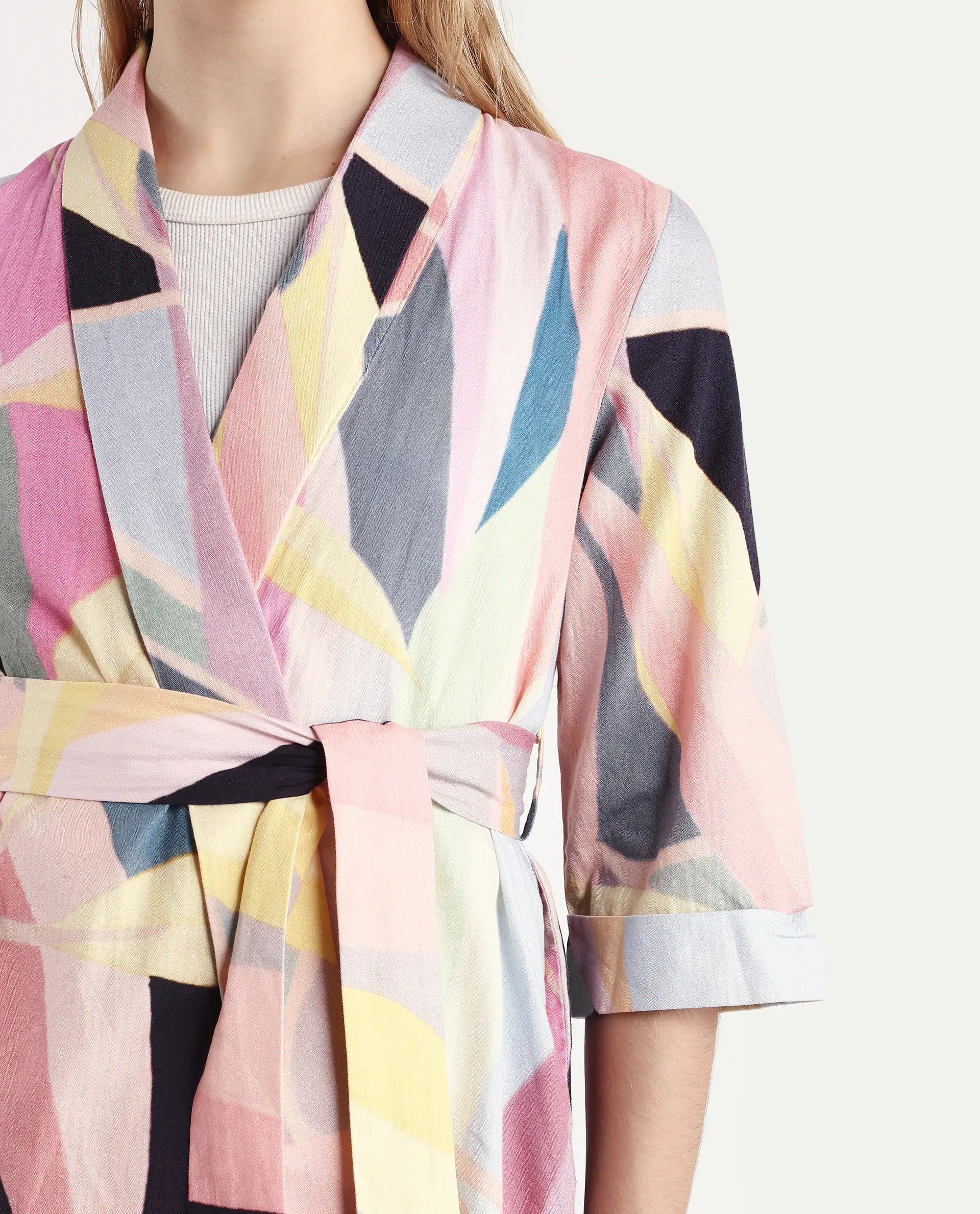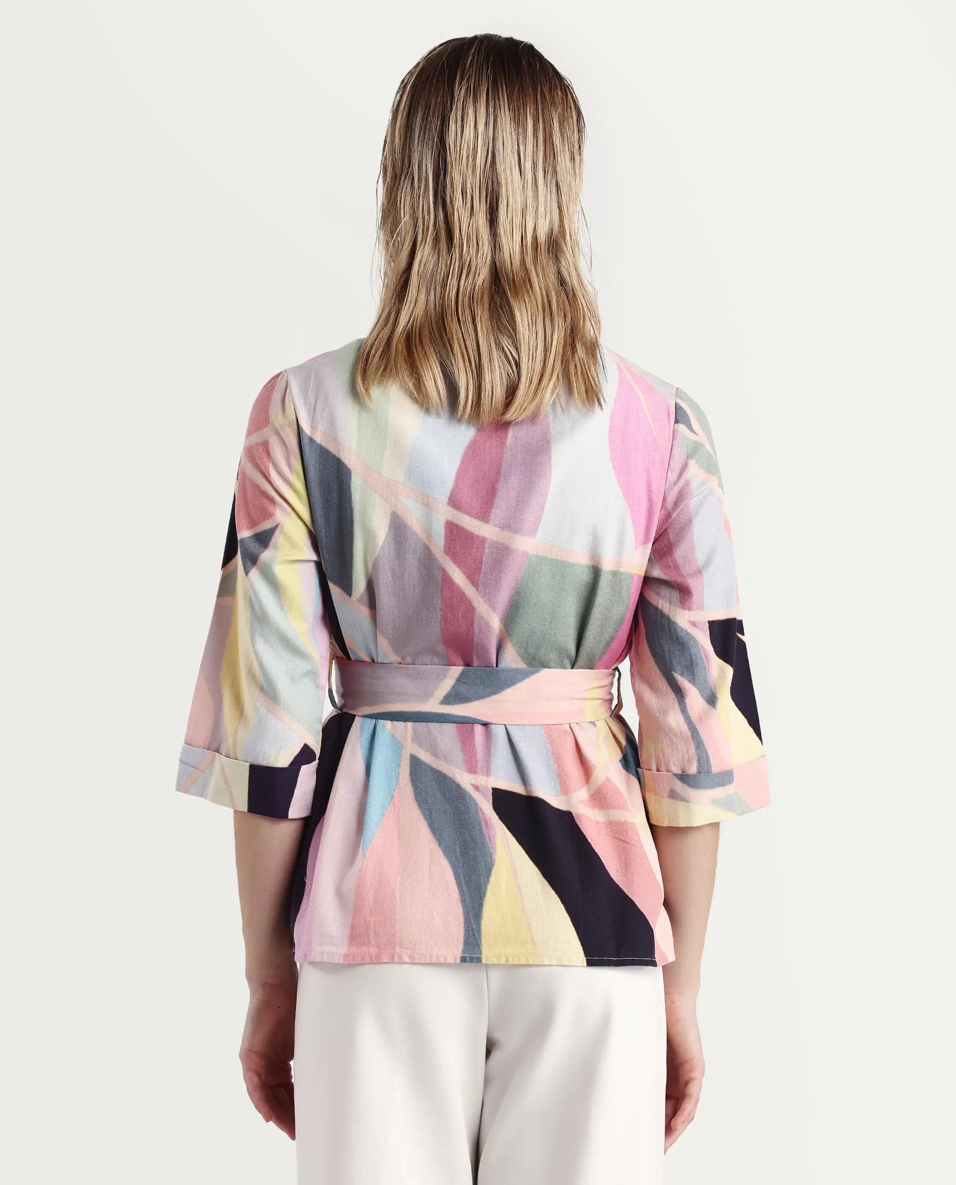 A abstract printed overlayer in 3/4th sleeve and tie-up at waist.