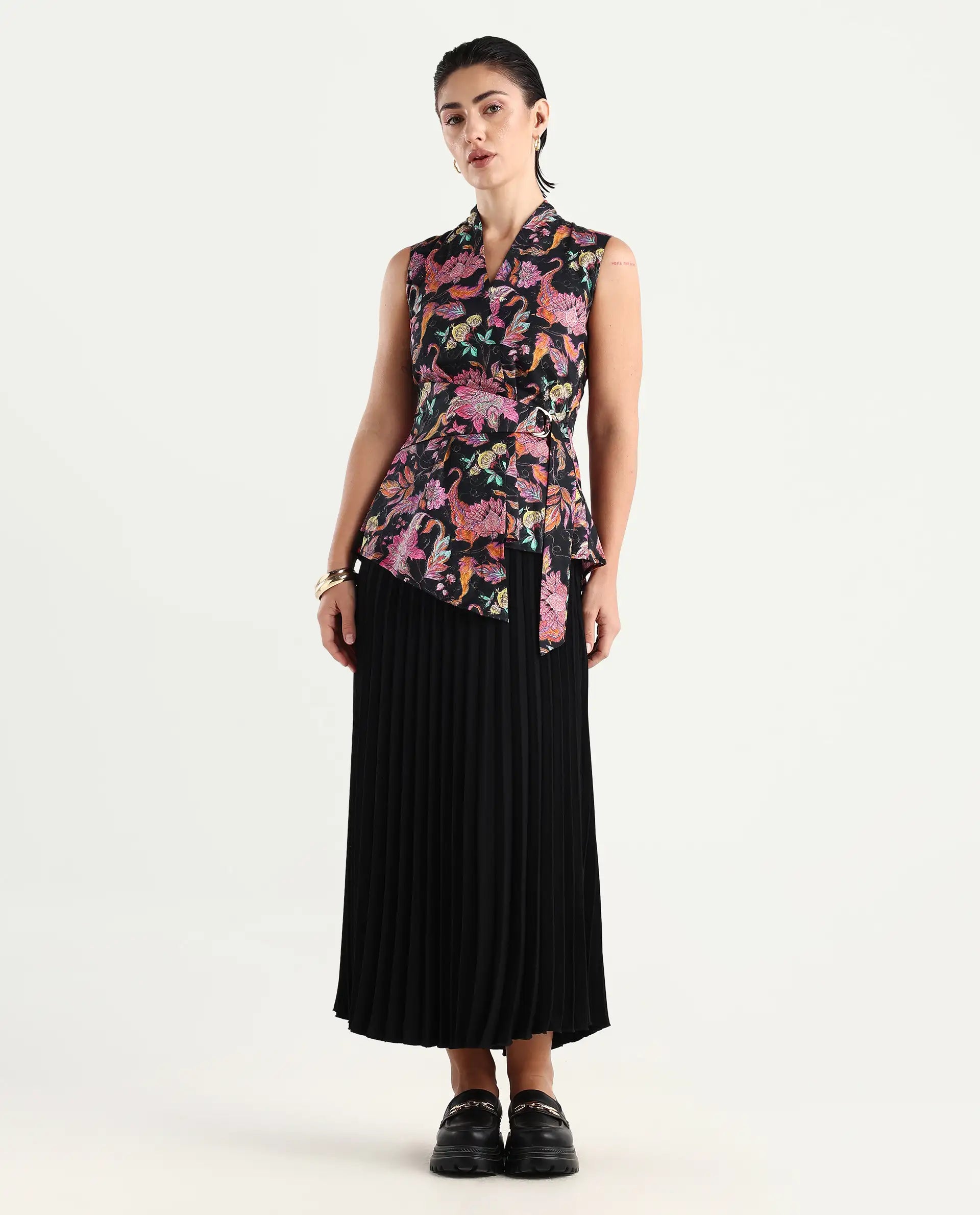 - The model (Chest-34, Waist-28, Hips-38, Height-178 cms) is wearing a size XS.