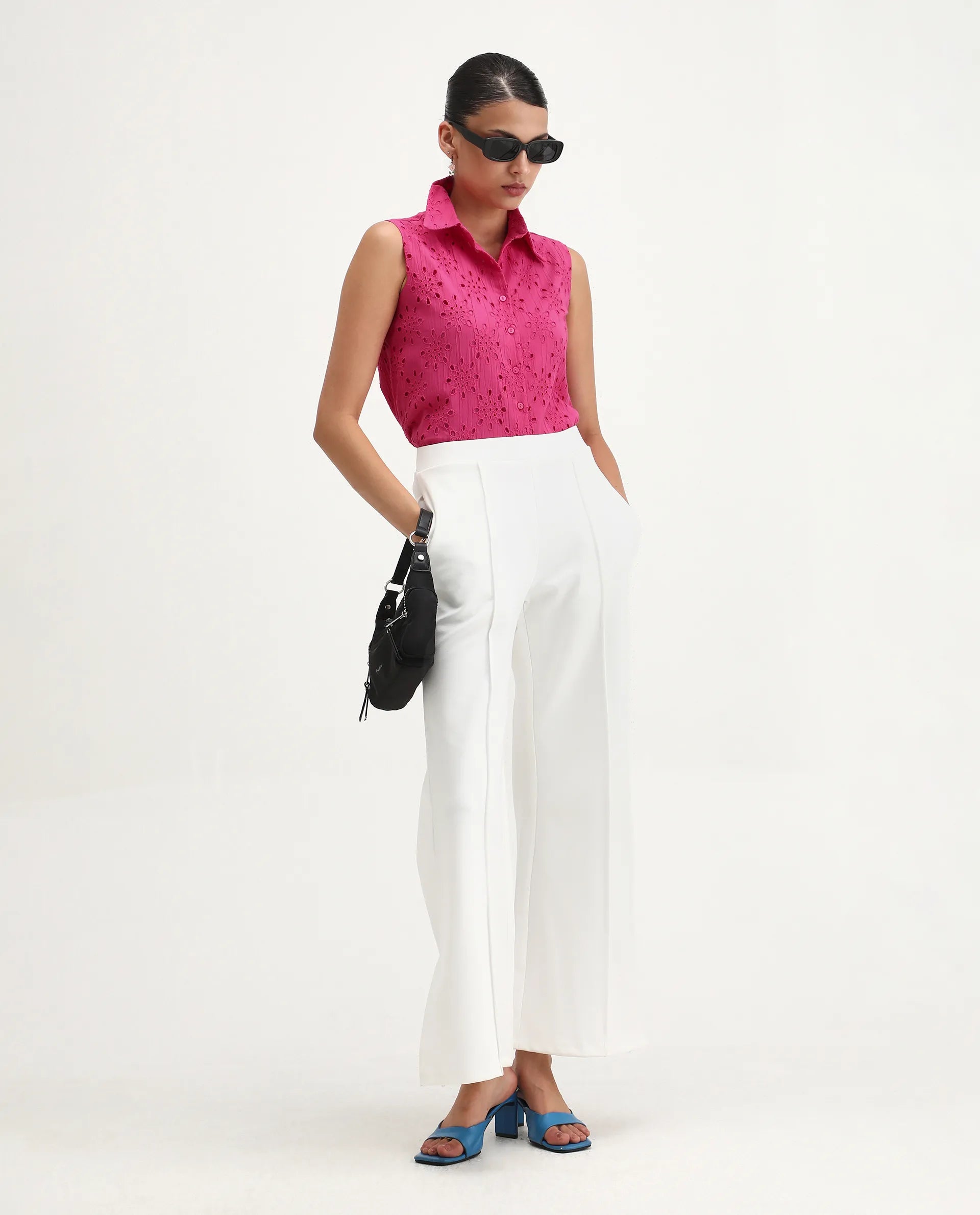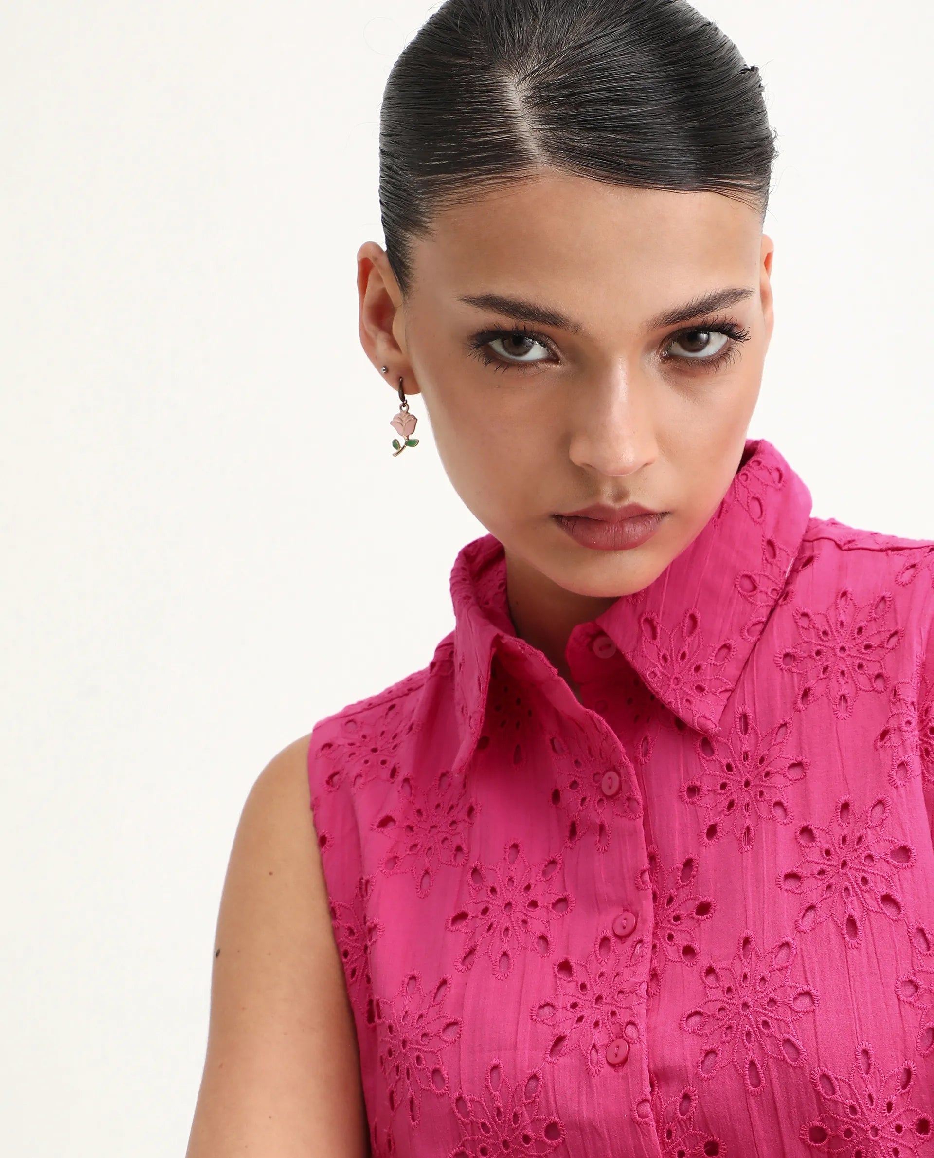 Introduce a pop of pink with this chic and playful top from Rareism. The 100% cotton fabric is lightweight and comfortable, making it perfect for warm weather. Sleeveless with a collared neck and button closure, this top also features a unique Schiffli pattern that adds a touch of whimsy to any outfit. Perfect for a day out or a casual weekend look.
