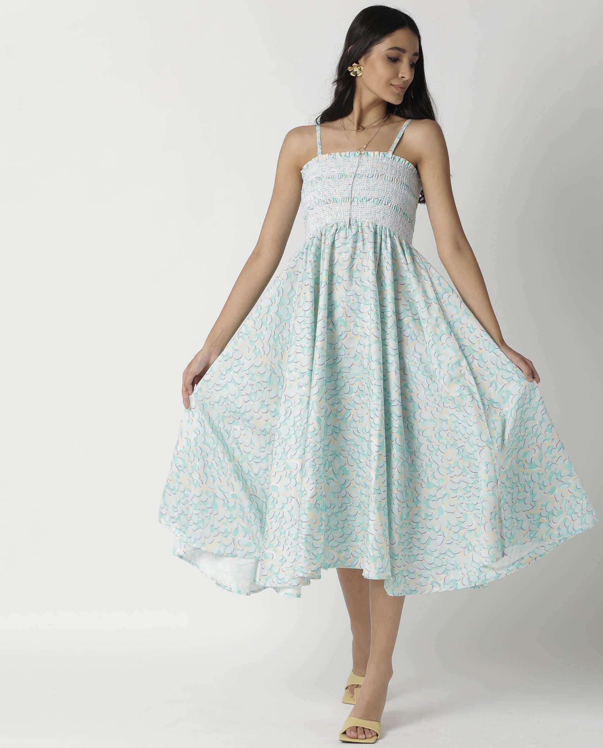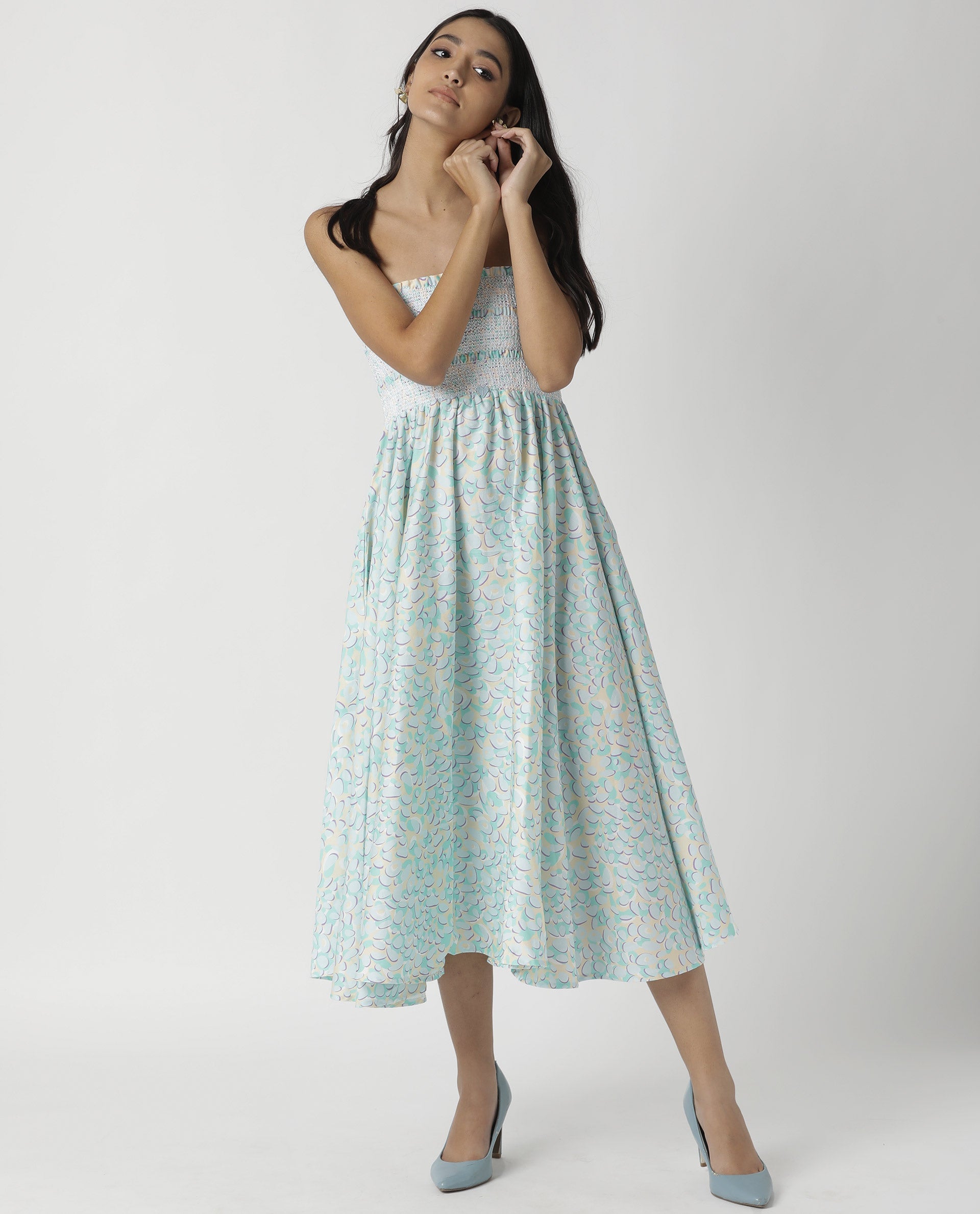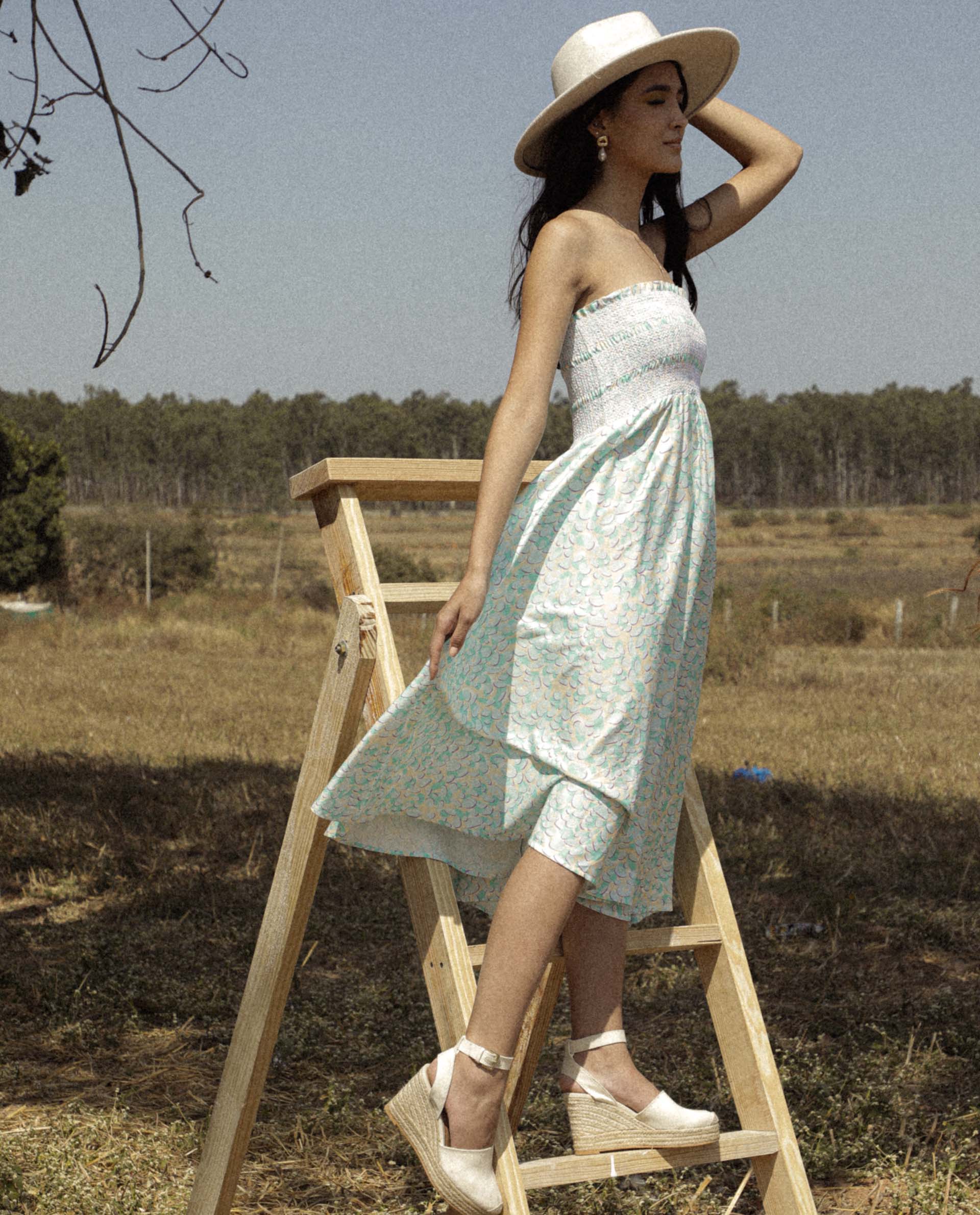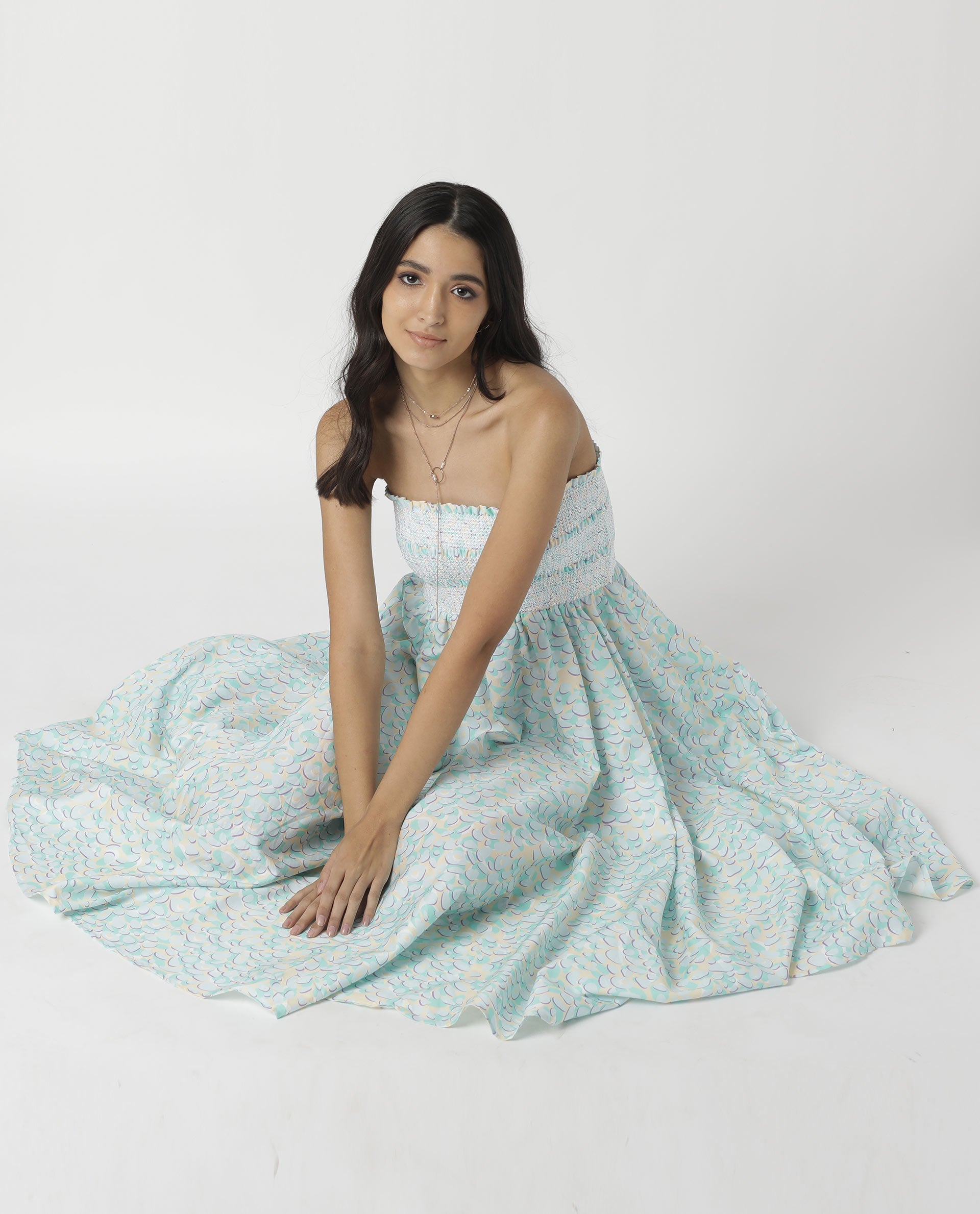 -With intricate smocking at the chest, and full circular flare and detachable straps in new pastel print. -Best worn with minimalist accessories for dates and dinners -Cotton Satin