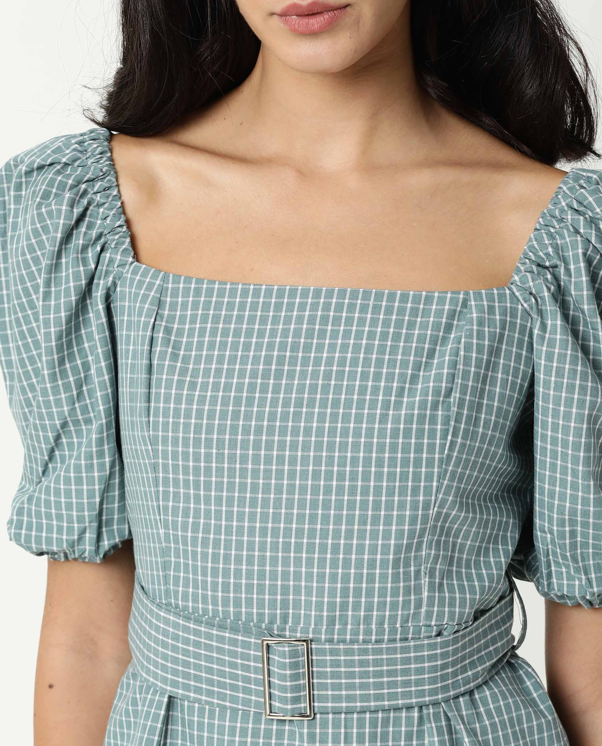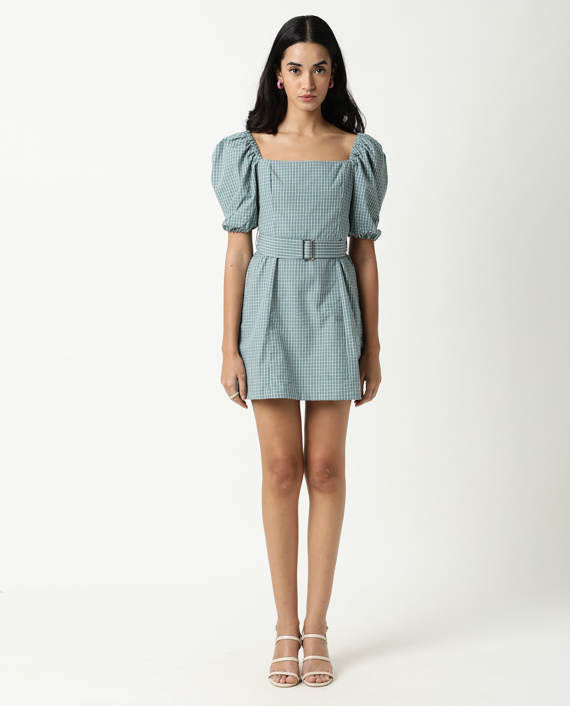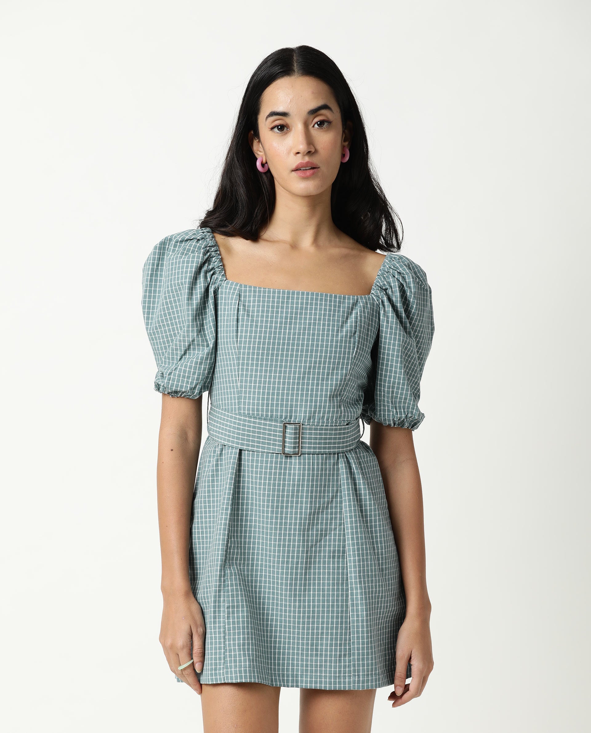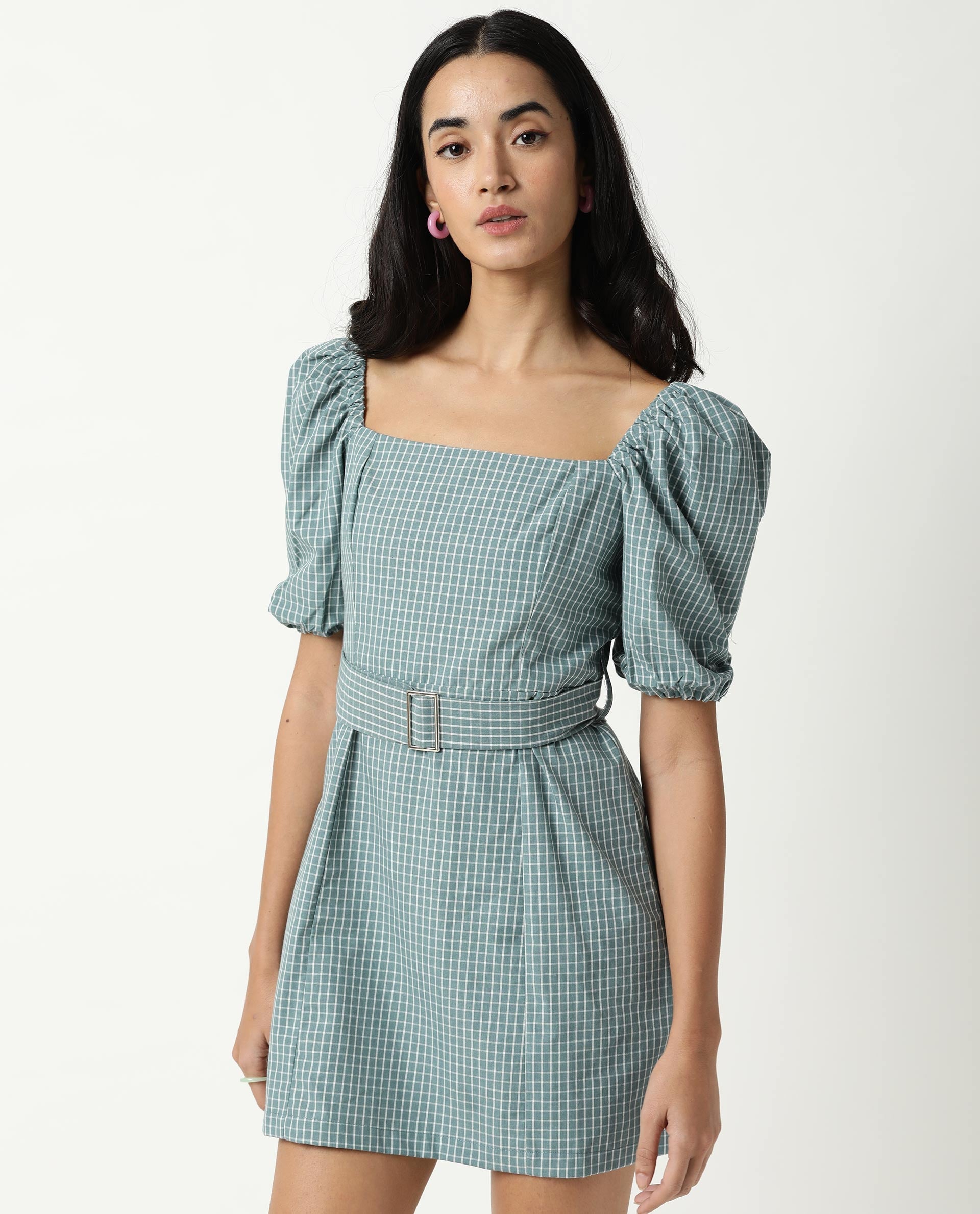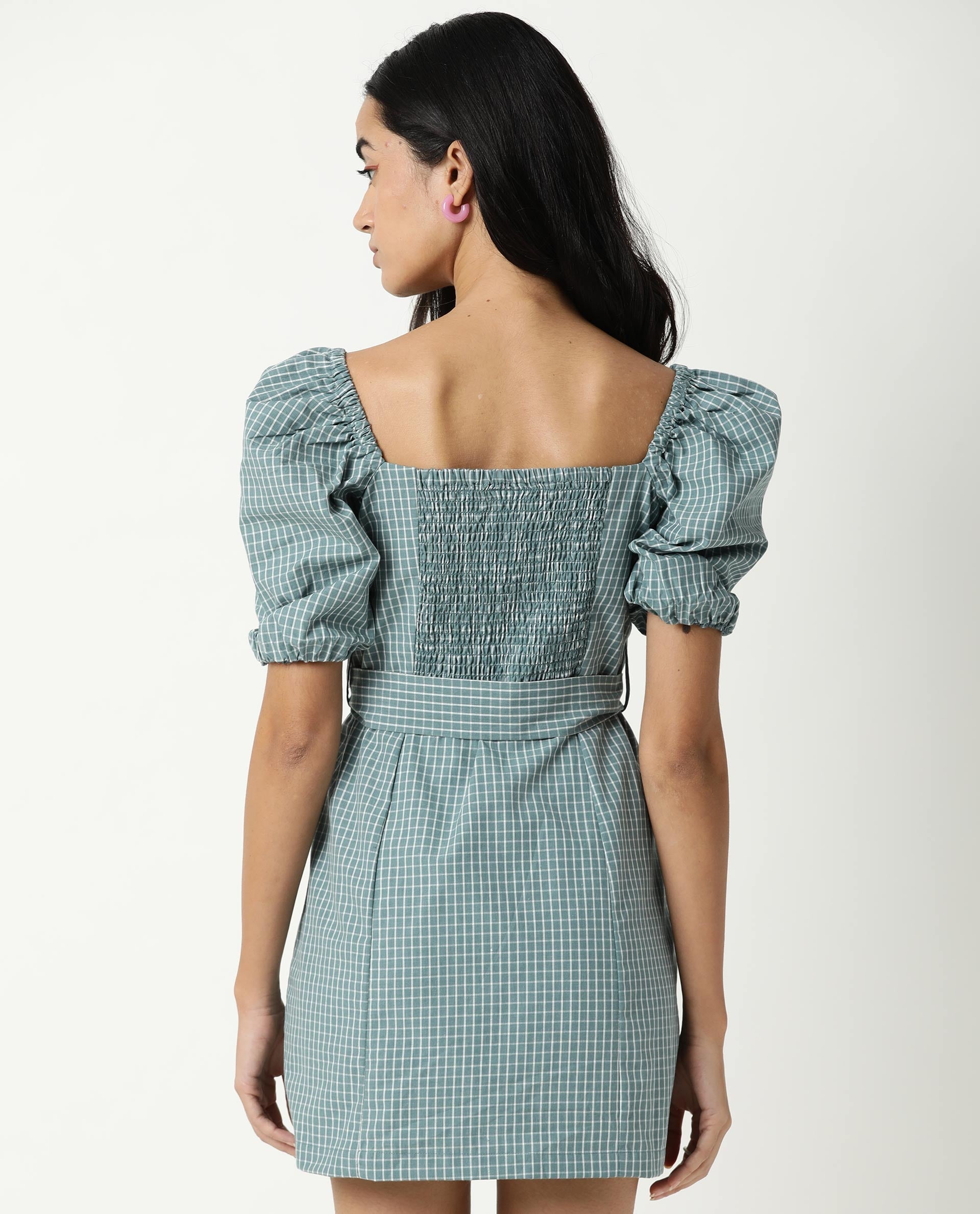 Rareism Women's Train Green Linen Square Neck Checked Puff Sleeves Mini Slim Fit Dress