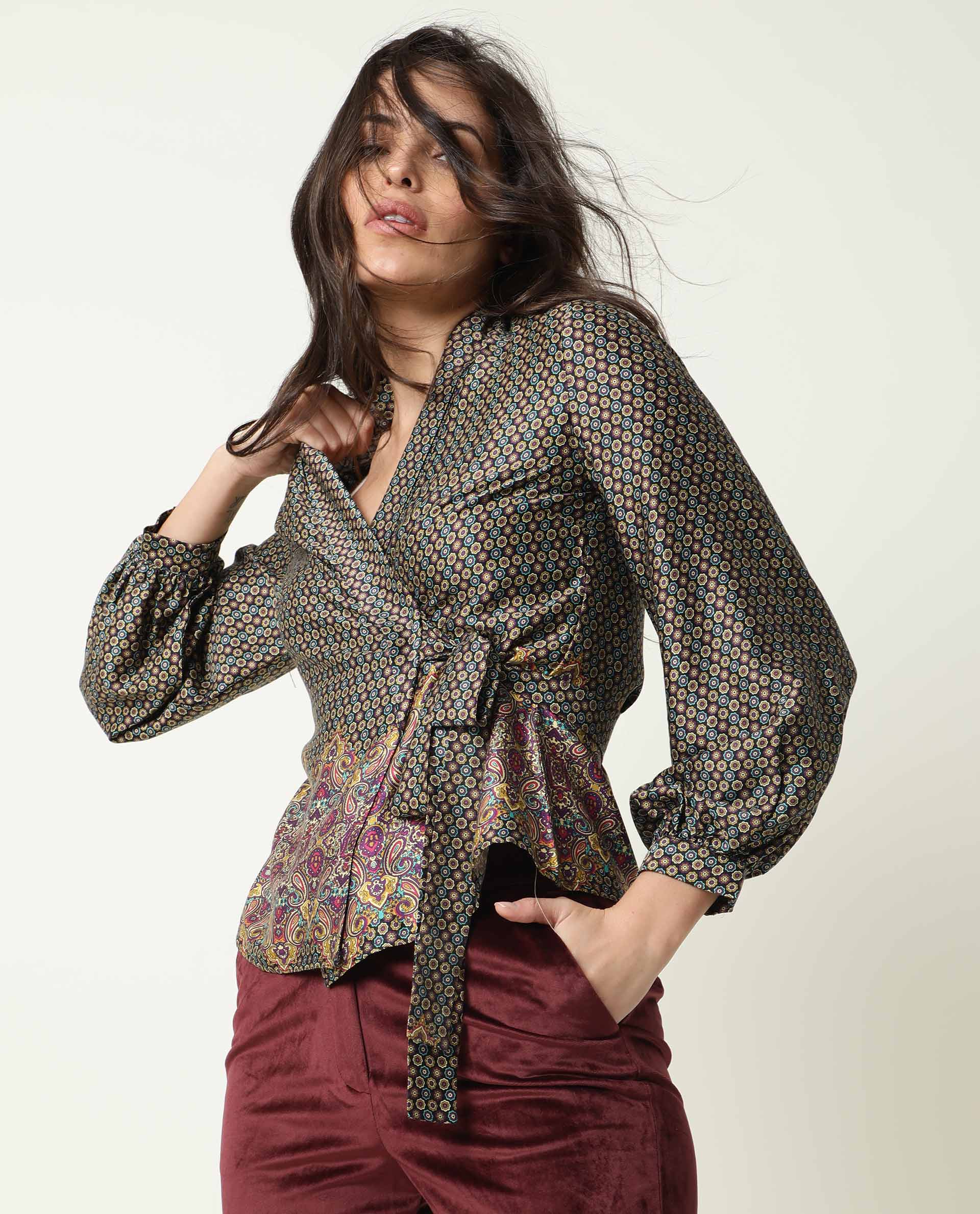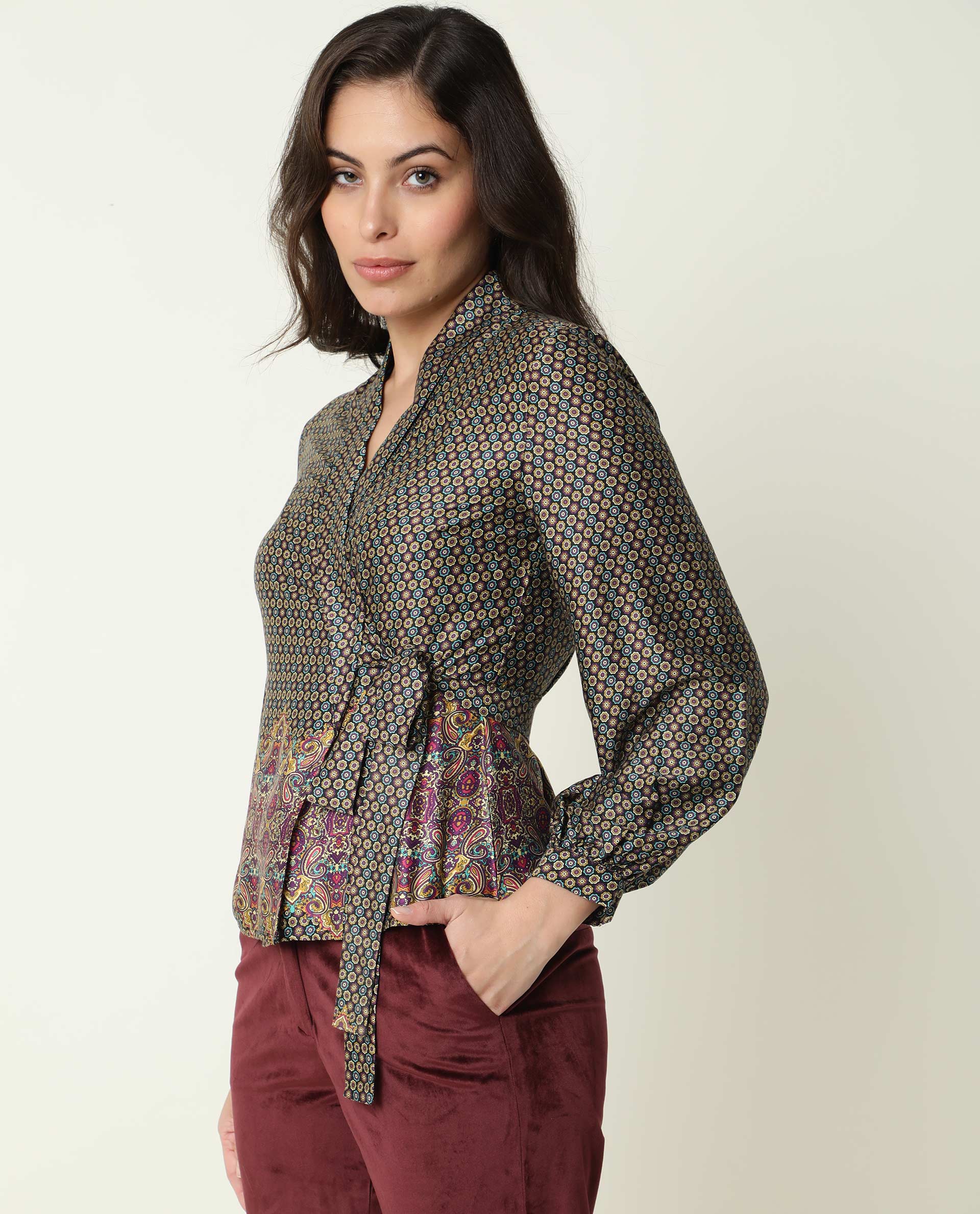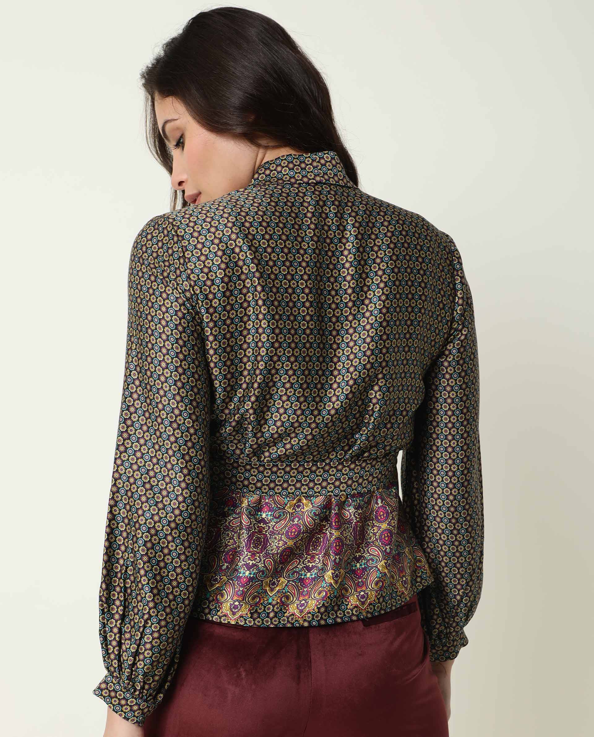 A abstract printed over lay in 3/4th sleeve.
