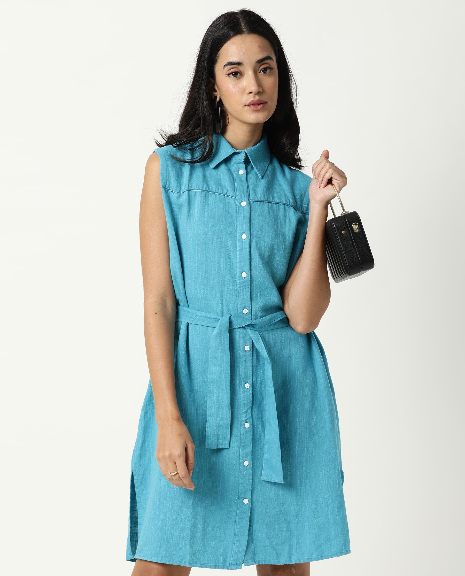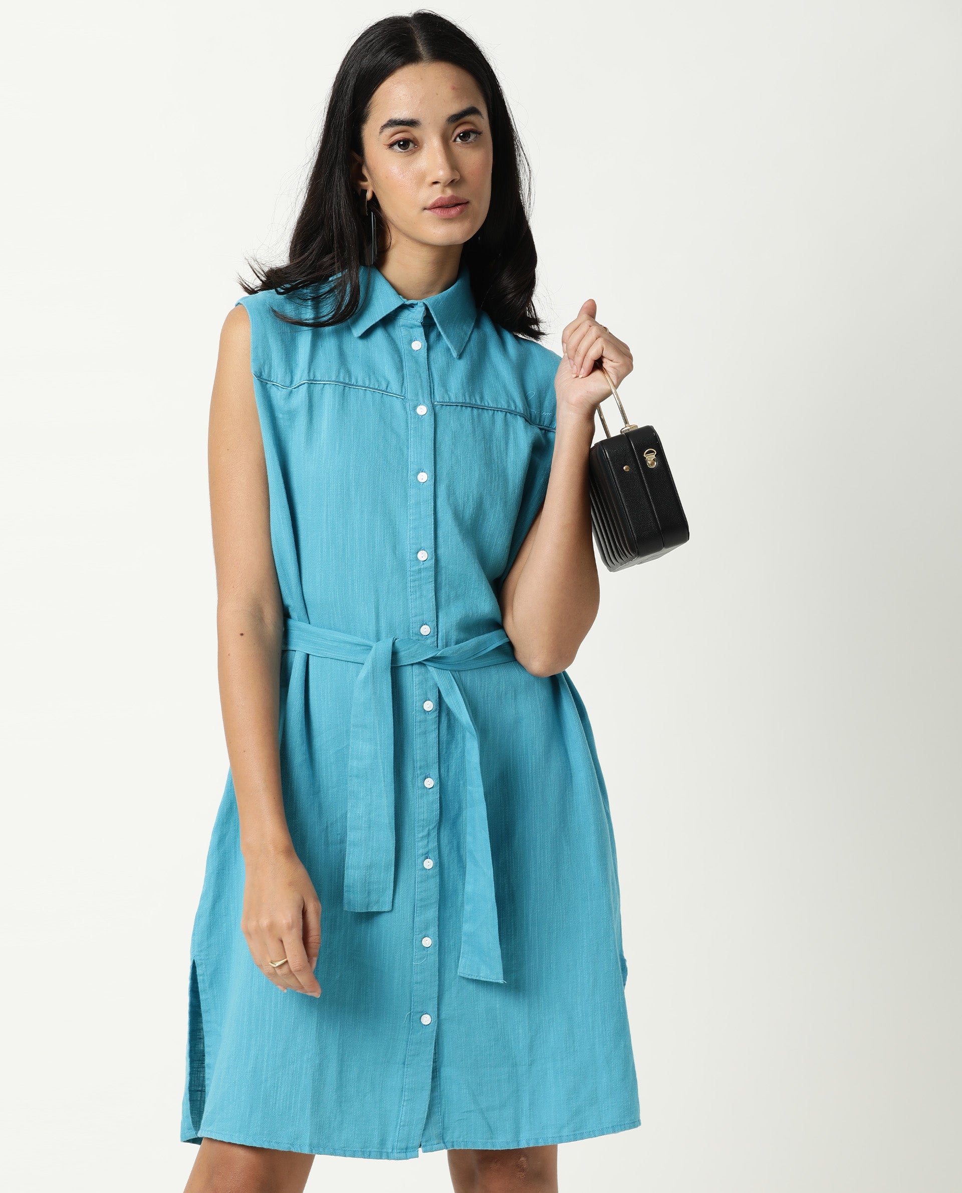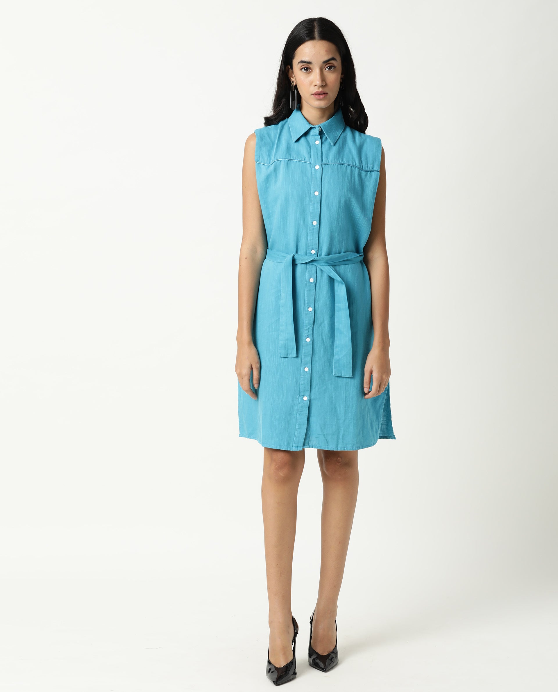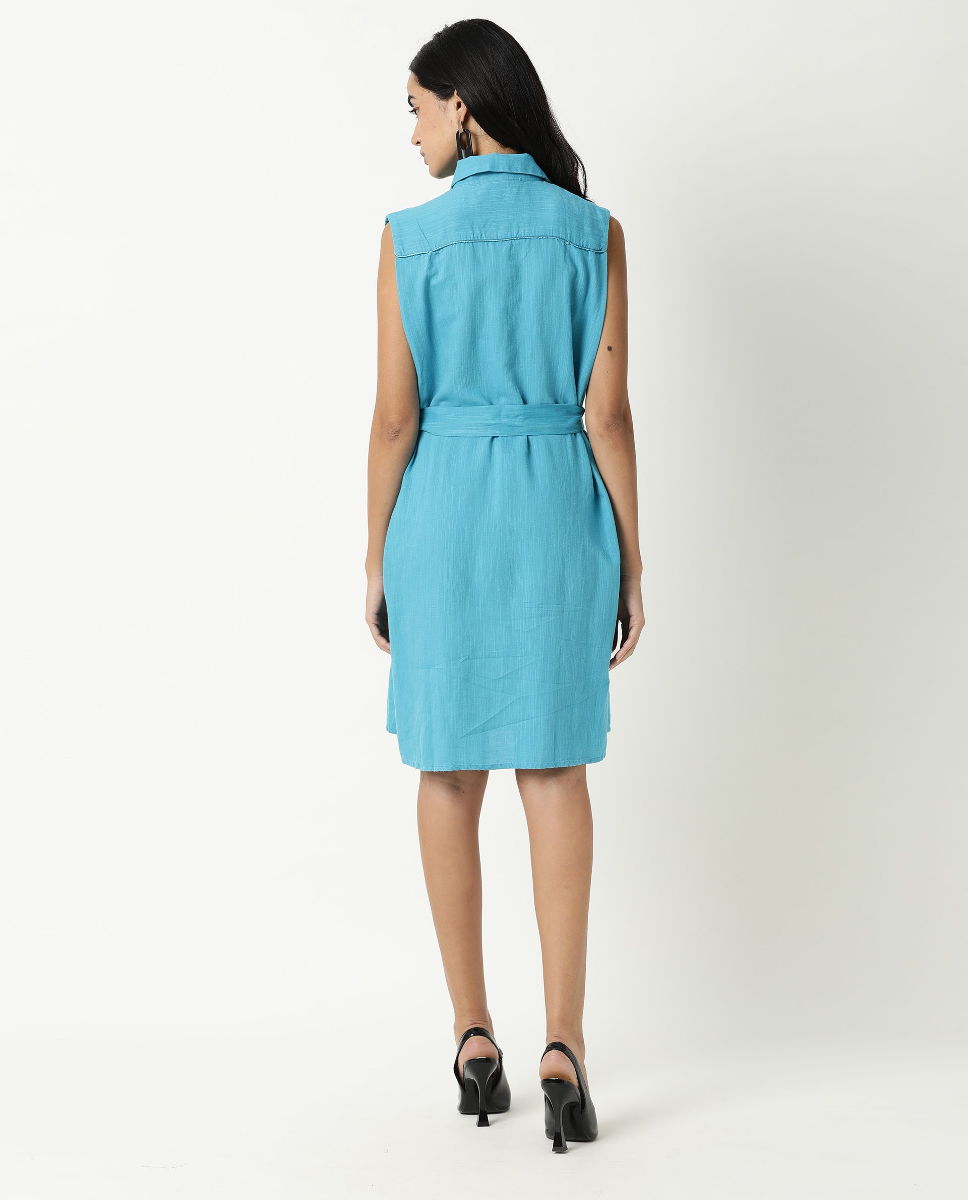 Rareism Women's Zolaa Blue Linen Spread Collar Plain Sleeveless Mini Regular Fit Dress