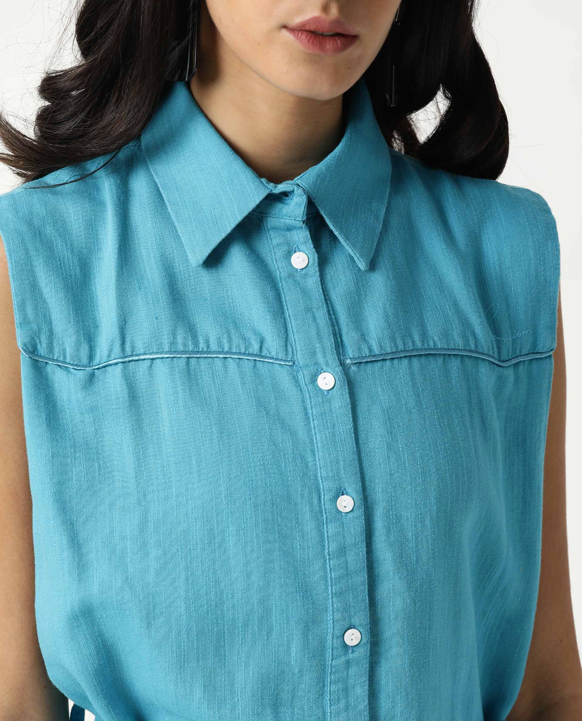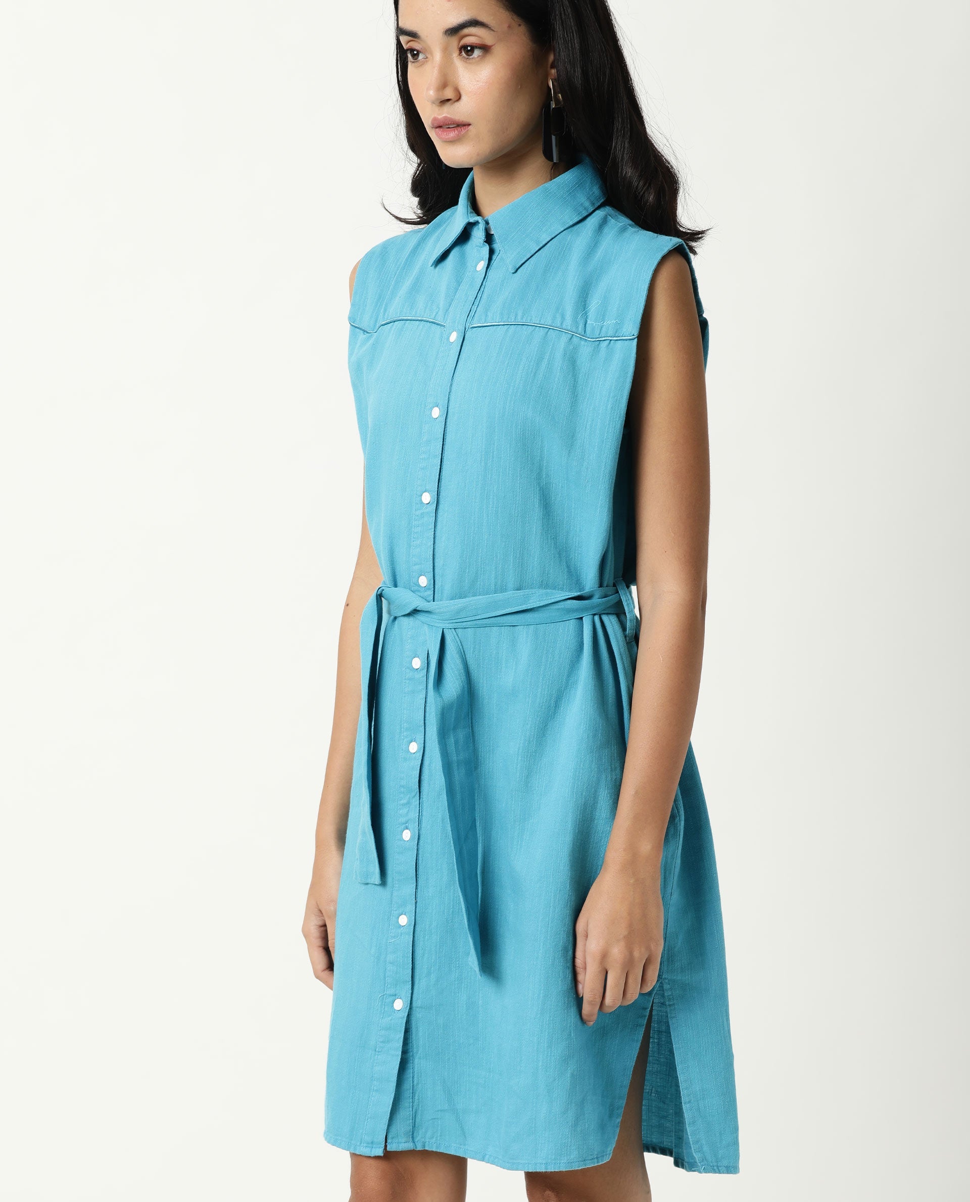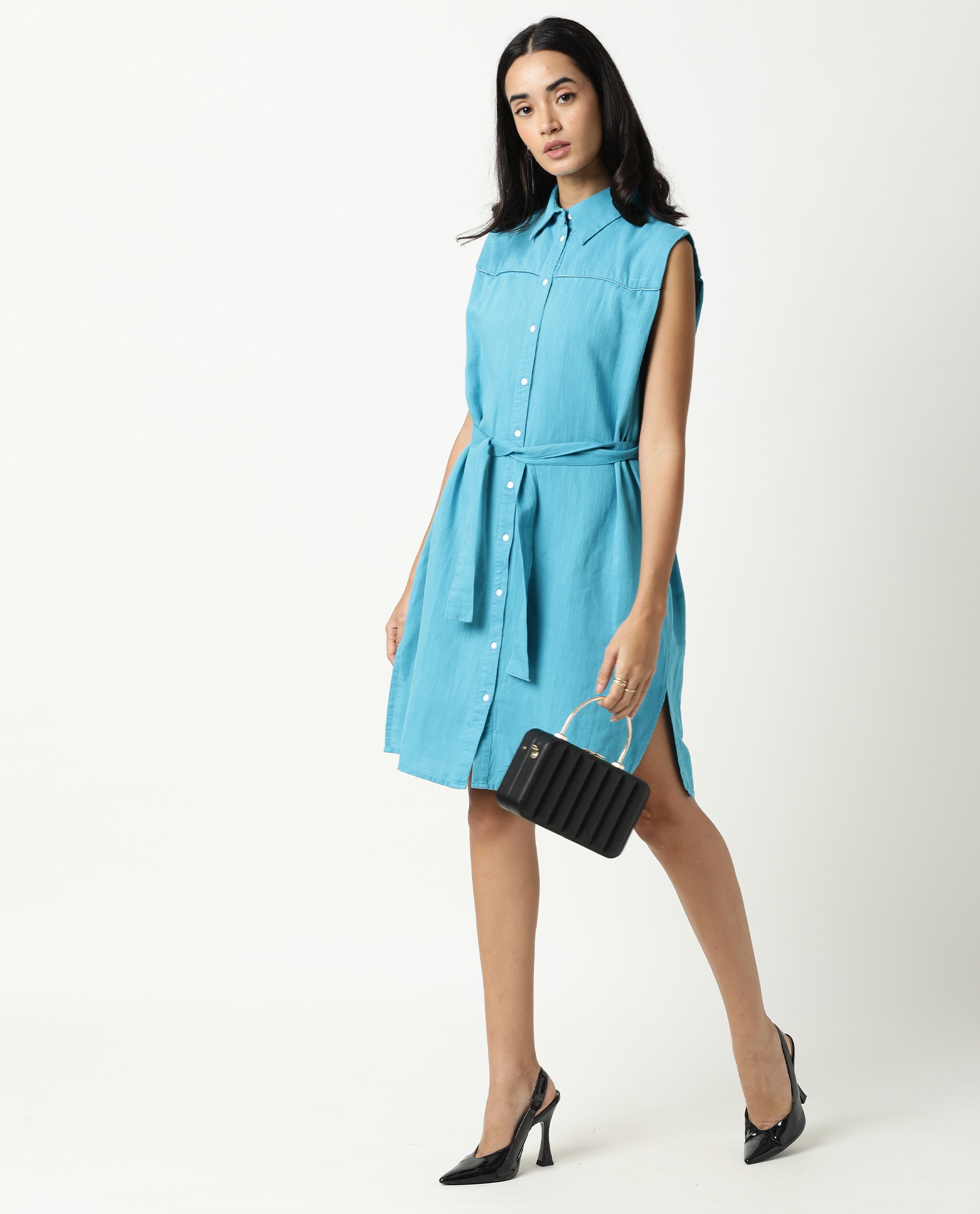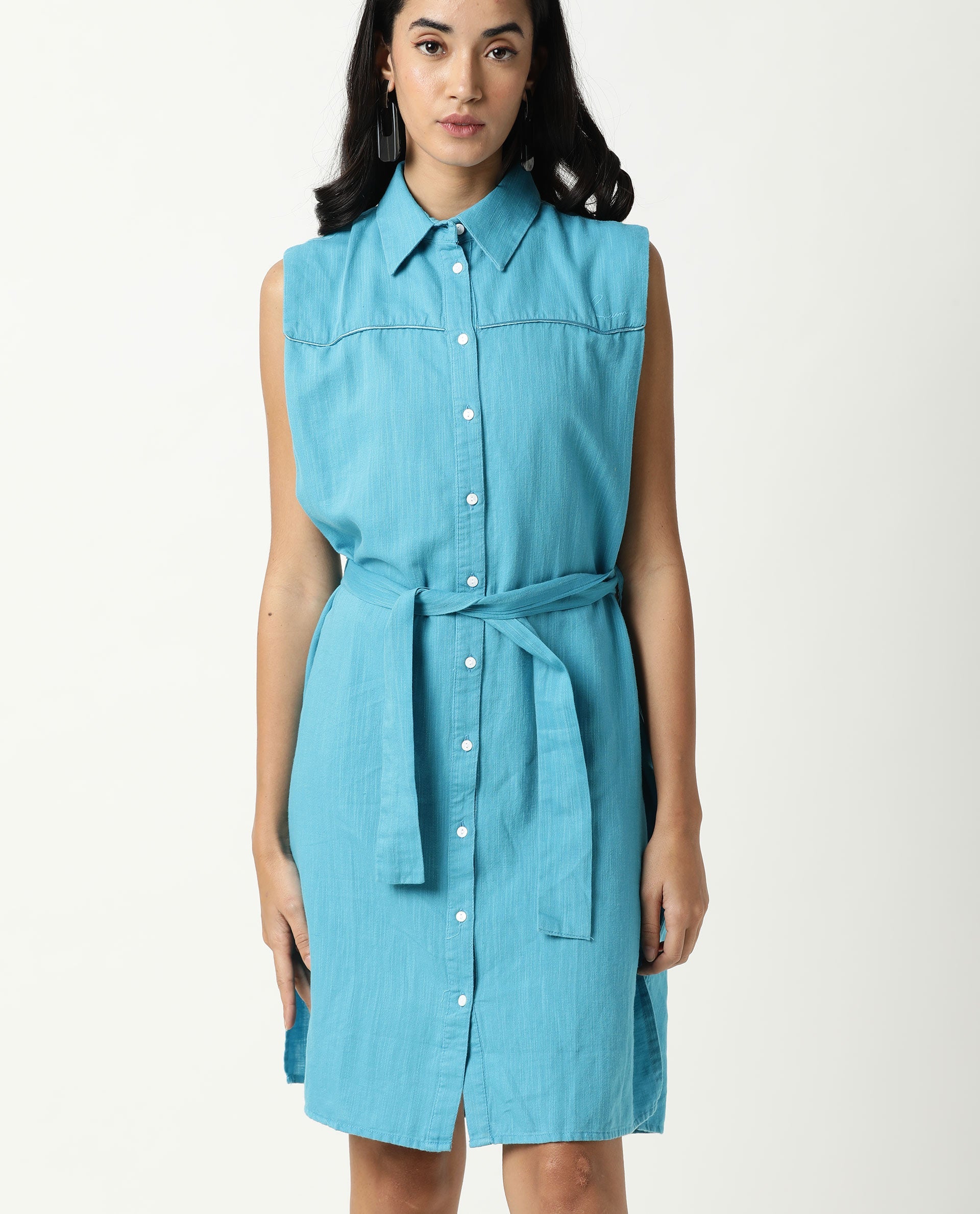 Rareism Women's Zolaa Blue Linen Spread Collar Plain Sleeveless Mini Regular Fit Dress